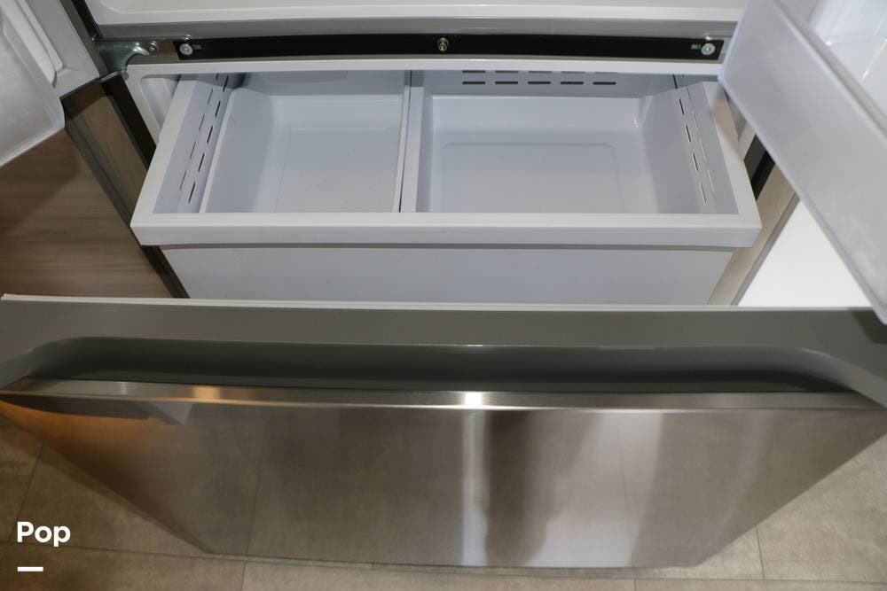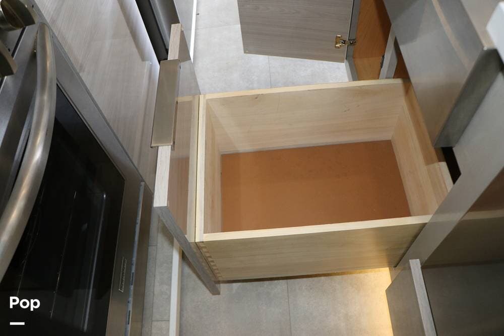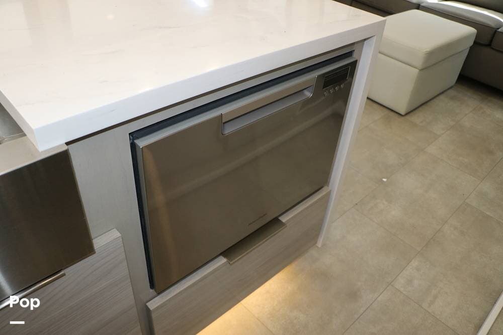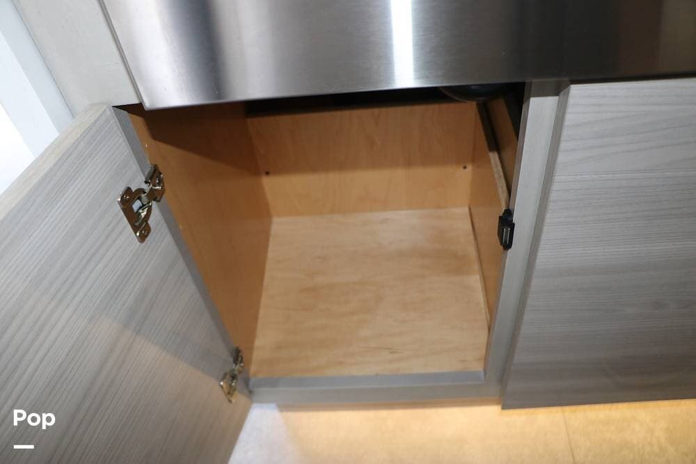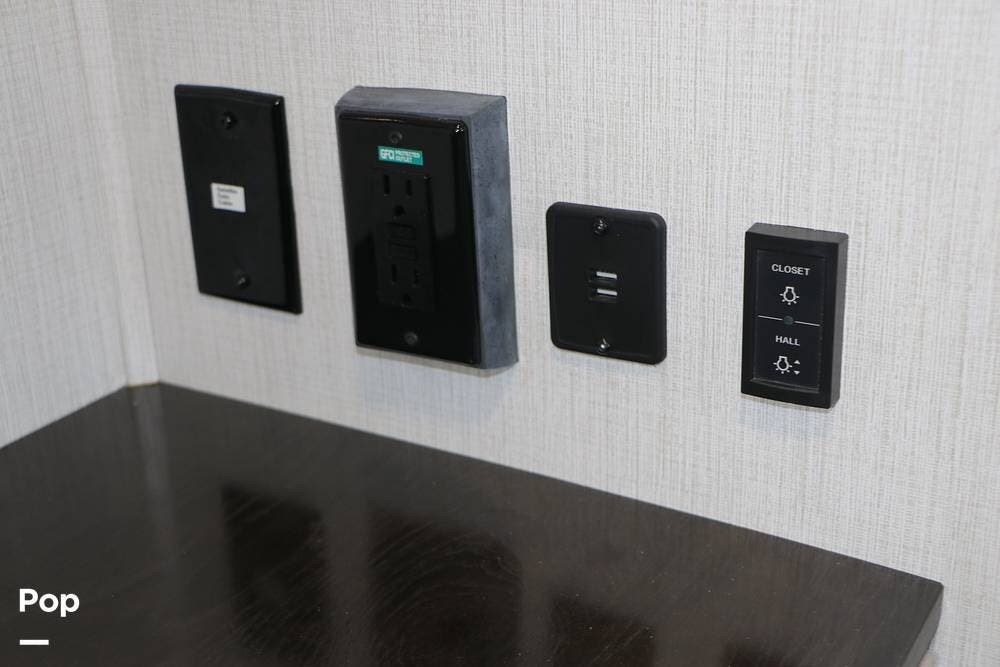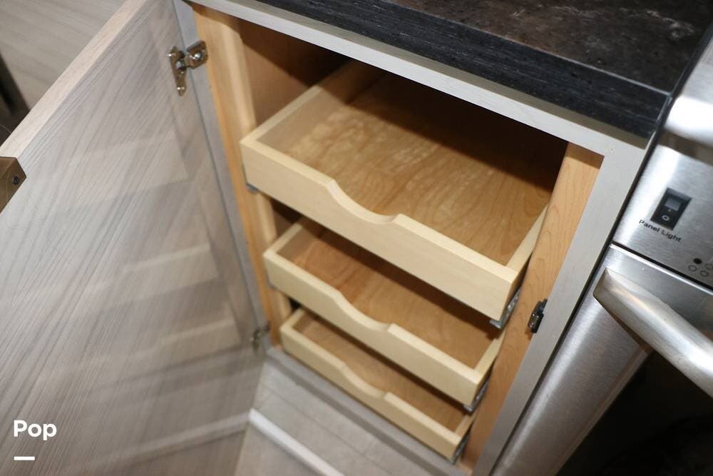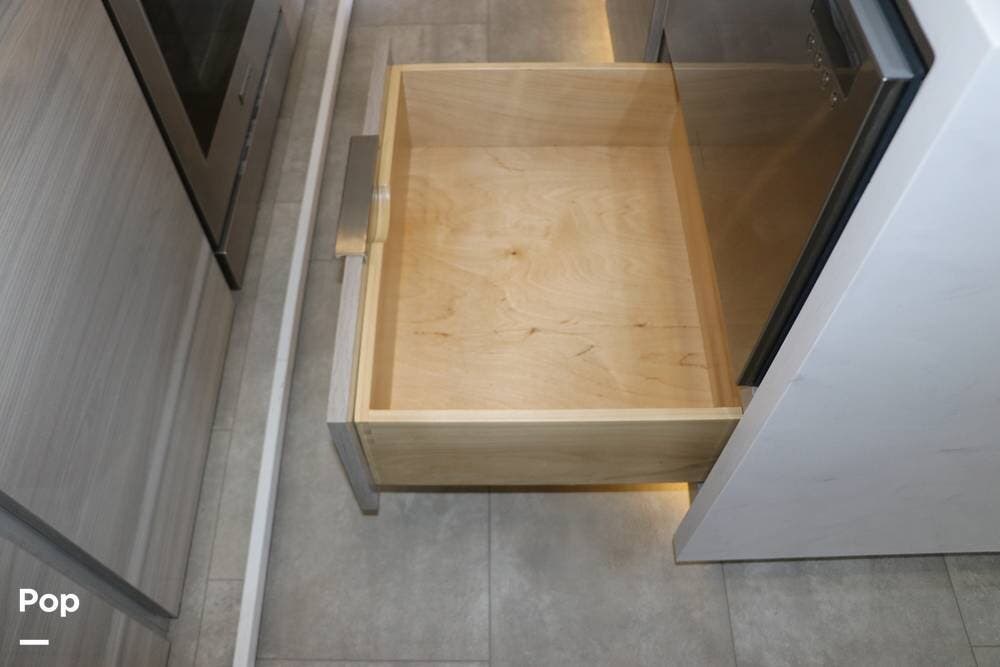 The floor plan features a spacious living area with a galley and a Rear Living area that includes a large entertainment center with full floor-to-ceiling storage space behind it. The entertainment center is complemented by a large flat-screen TV, stereo system, and electric fireplace that can be used for both heating and ambiance. The lovely cabinetry throughout the unit shows the attention to detail that makes a huge difference in the quality of your living and storage areas.