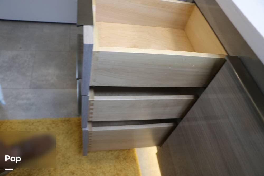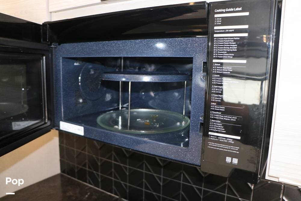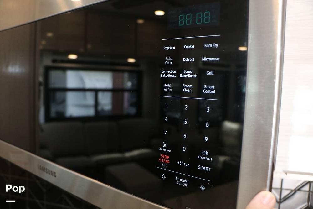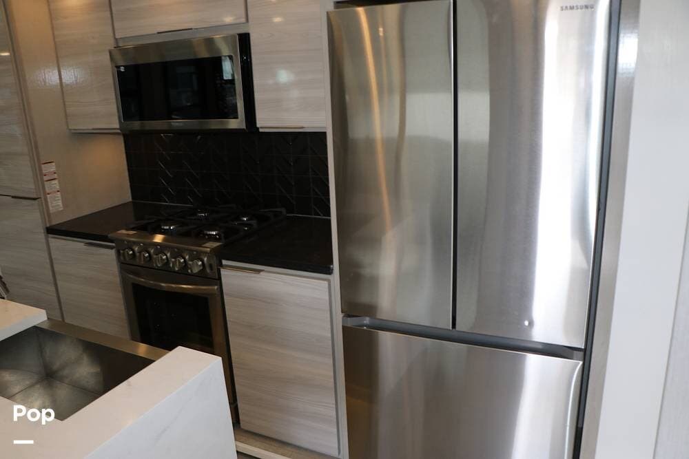 The large kitchen island features a Farm-Style Stainless Steel sink, accompanied by matching solid surface covers and a Dishwasher. The galley has ample storage space and features a microwave/convection oven over a 4-burner gas stove top with a cast-iron grating. There is a full-size gas oven below and a large 3-door Stainless Steel Residential Refrigerator/freezer. The cabinet area to your immediate right, as you enter, also features the full touchscreen control center, along with additional controls, all in one central location.