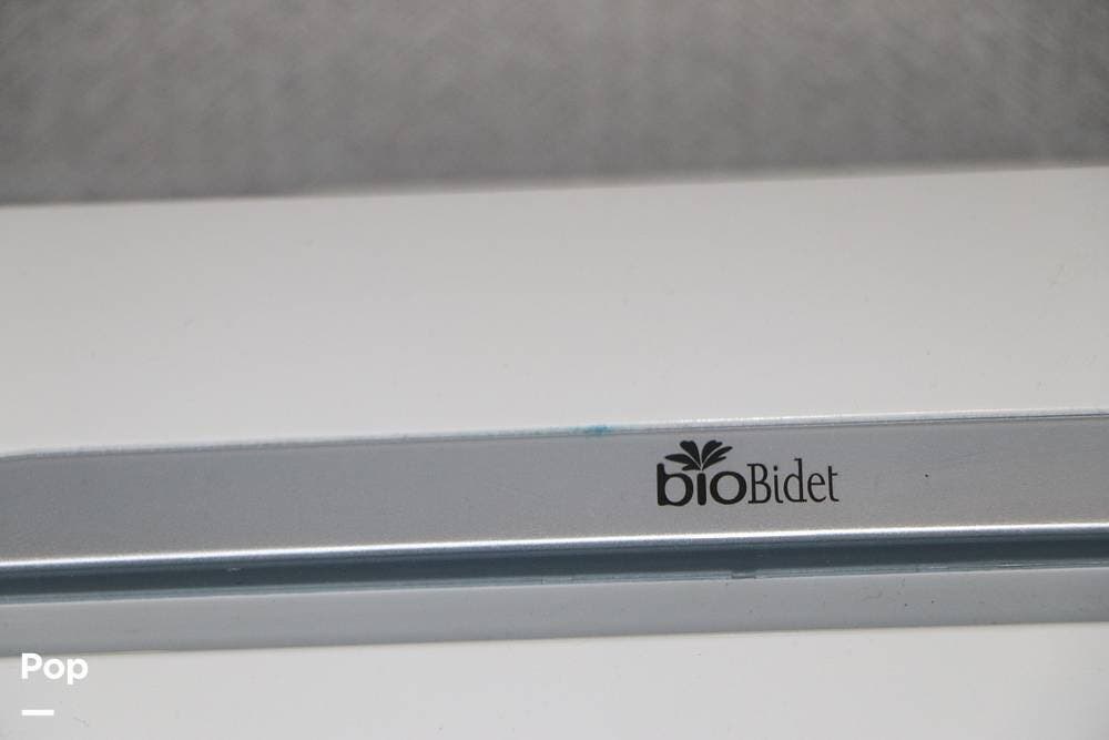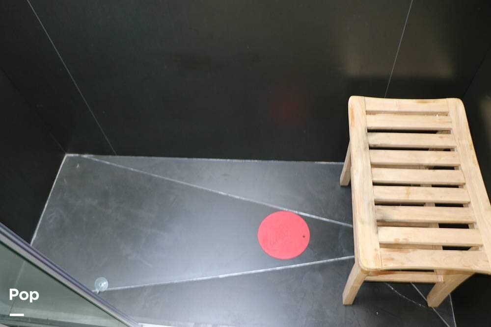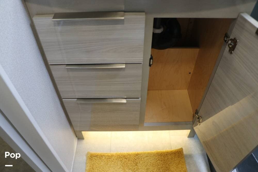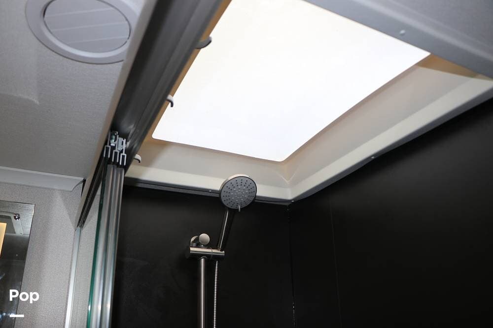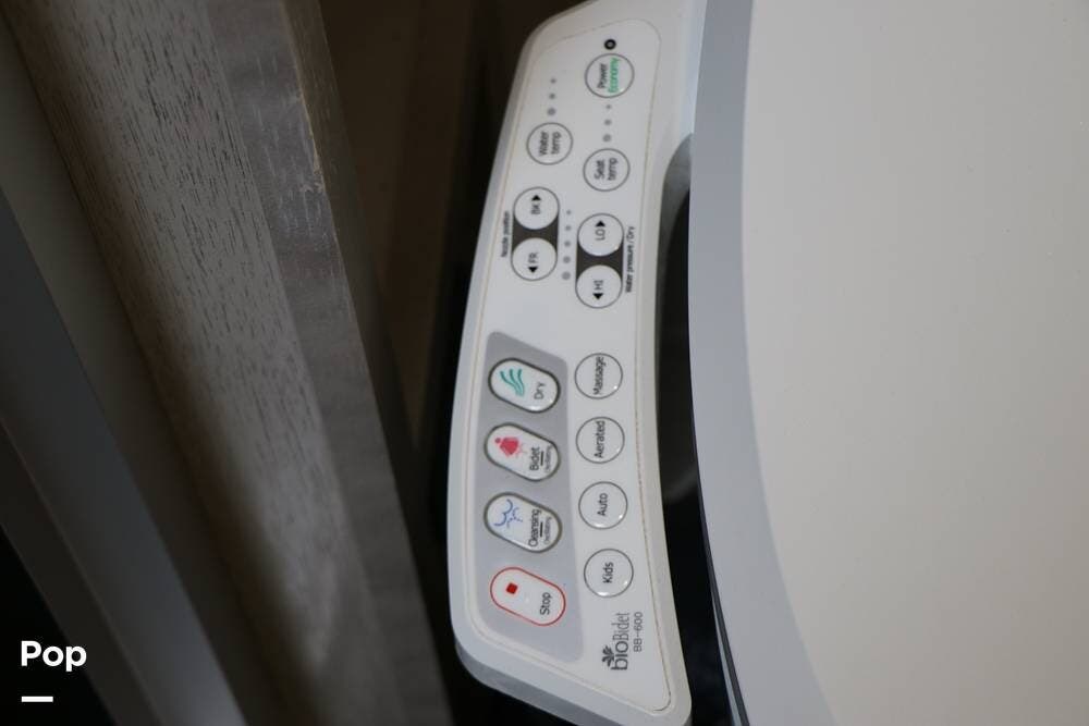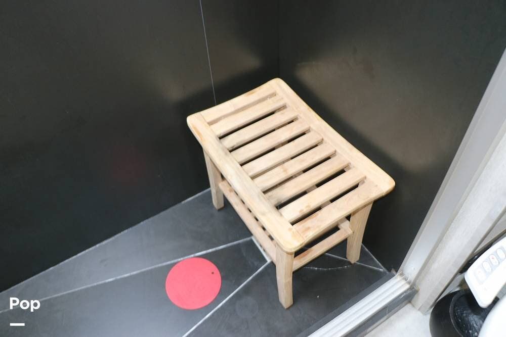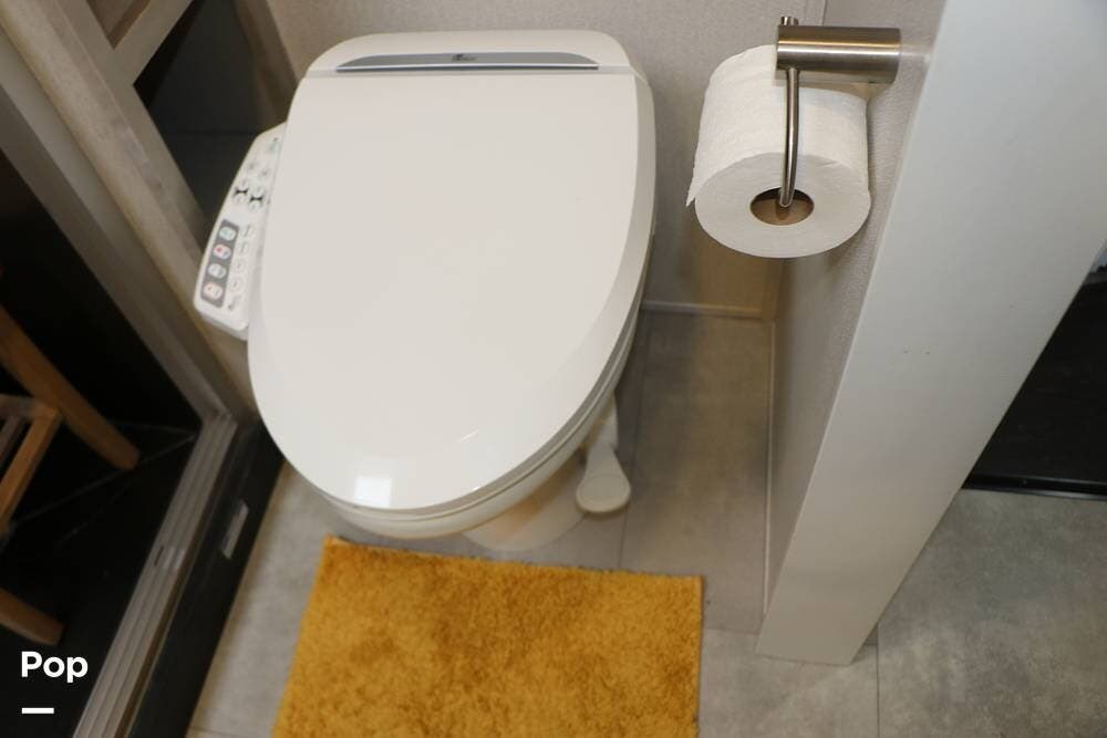 The steps leading up to the hallway take you to the full bathroom, featuring a step-in shower with a wooden seat and a large skylight overhead, providing ample natural light. The sink, with cabinet space below, and an electronic BioBidet Toilet opposite, complete the bathroom. The unit is equipped with a Truma On Demand Tankless Water Heater, so you never have to worry about running out of hot water!