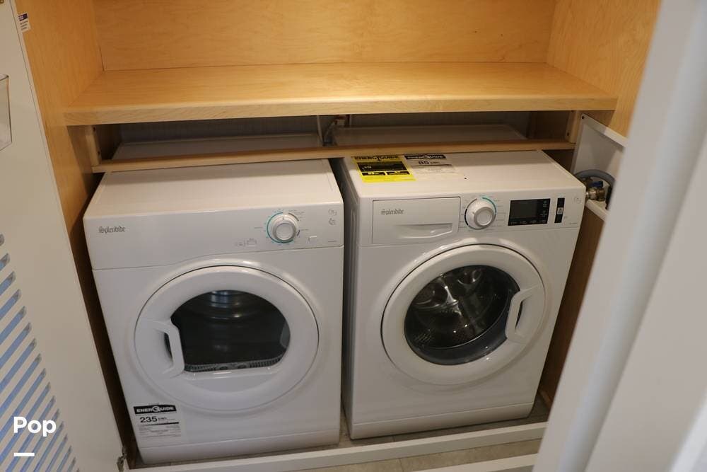 The storage space directly opposite the bathroom houses the full-sized clothes washer and dryer units with additional storage space on the shelf above.