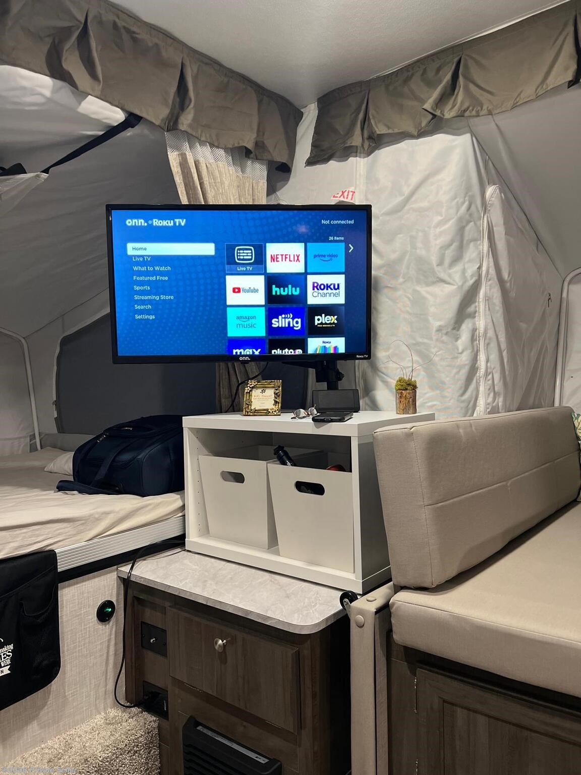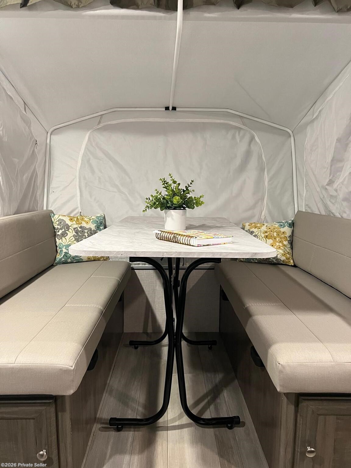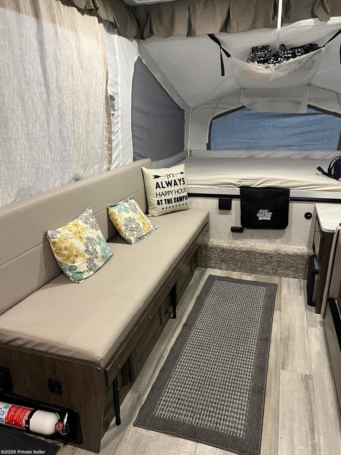 The Forest River Rockwood Freedom 2318G is a compact and versatile pop-up camper that offers the perfect combination of convenience and comfort for your outdoor adventures. This lightweight camper is designed to be easy to tow and maneuver, making it ideal for weekend getaways or extended road trips. The Rockwood Freedom 2318G features a spacious interior with plenty of room to sleep up to six people comfortably. The clever design includes fold-out beds on either end of the camper, as well as a dinette that can be converted into an additional sleeping area. Inside, you'll find all the amenities you need to stay comfortable on the road, including a kitchenette with a sink, stove, and refrigerator. The camper also includes plenty of storage space for all your gear and supplies. Outside, the Rockwood Freedom 2318G boasts a durable and weather-resistant exterior that is built to withstand the elements. The camper is equipped with a manual awning for shade and protection from the sun, as well as stabilizer jacks for a secure and stable setup. Whether you're exploring the great outdoors or just looking for a cozy retreat on your next camping trip, the Forest River Rockwood Freedom 2318G is a reliable and versatile choice. With its compact size, easy towing capabilities, and comfortable interior, this pop-up camper is sure to enhance your camping experience. Upgraded Electric roof lift and tongue jack lift. Blue LED lighting under camper