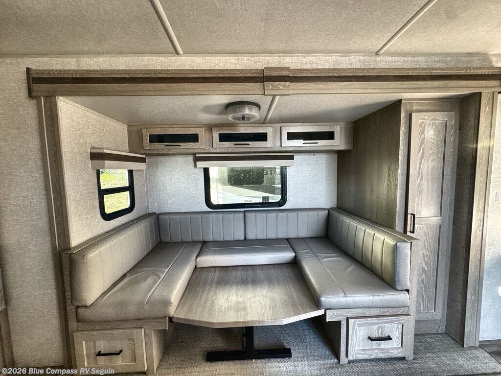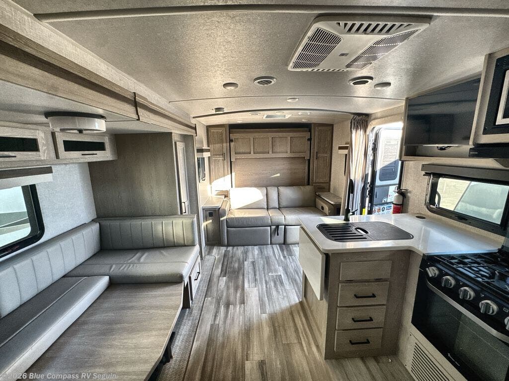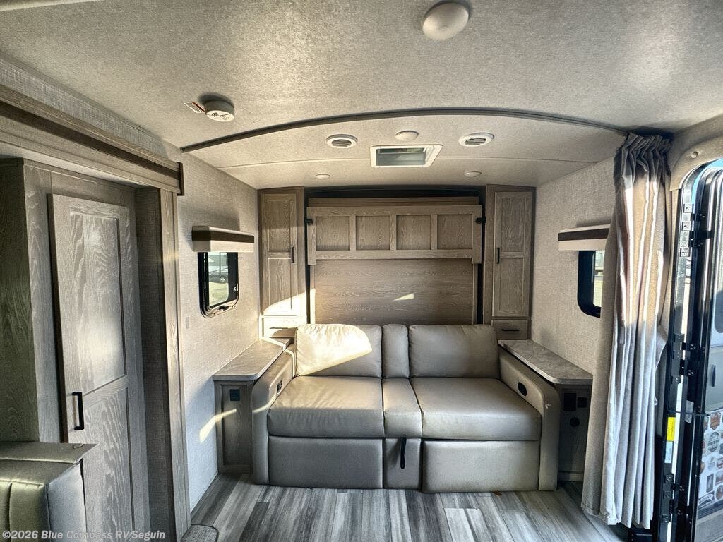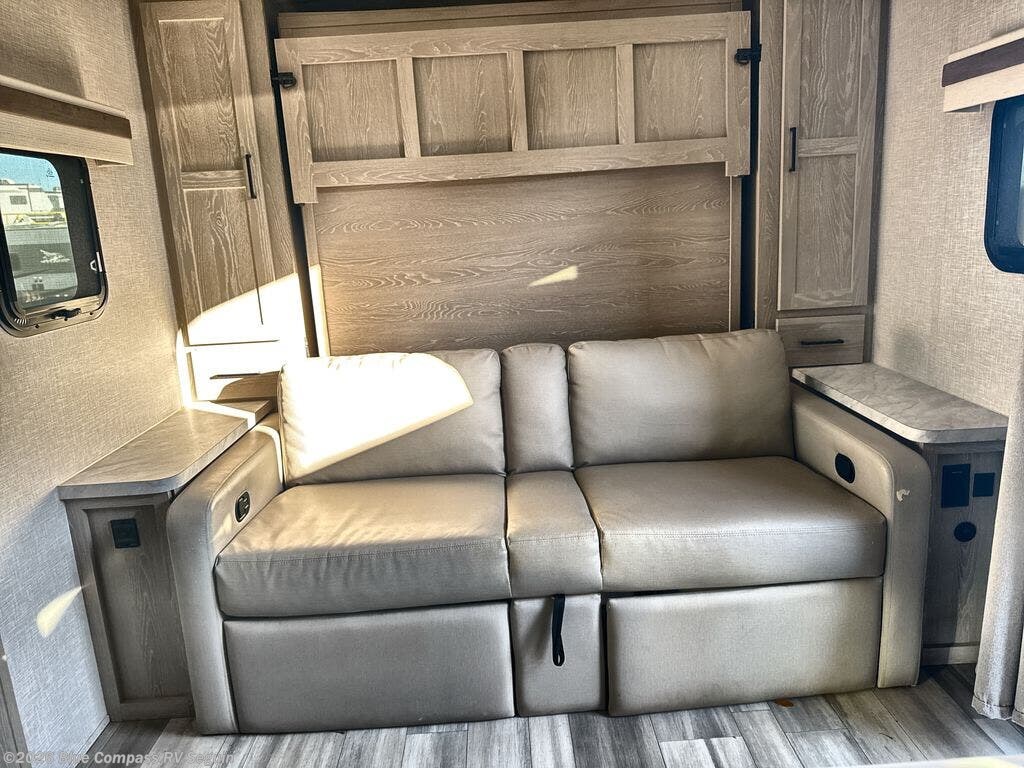 Versatile, cozy, and spacious are just a few ways to describe this travel trailer! Once you arrive at the campsite, unload your gear from the pass-through storage and additional exterior storage, then set up the 15' power awning with LED lights. You may want to visit in your camp chairs, or head inside to prepare lunch on the three burner cooktop. There is a U-shaped dinette within the slide out, plus a wardrobe here for jackets or your guests' clothes. You will also find the 72" sofa is a comfy spot to relax, and at night, you can fold down the RV queen-size Murphy bed!