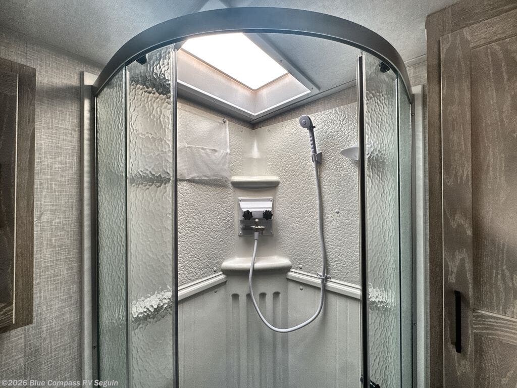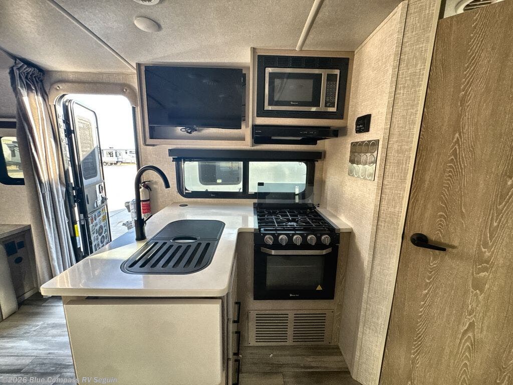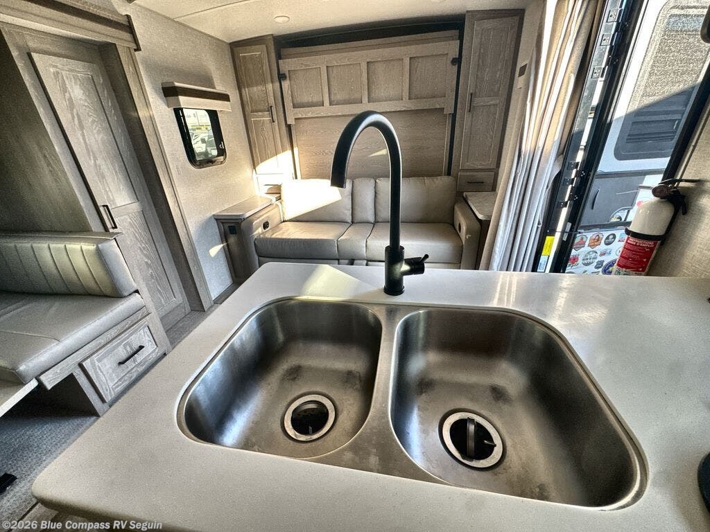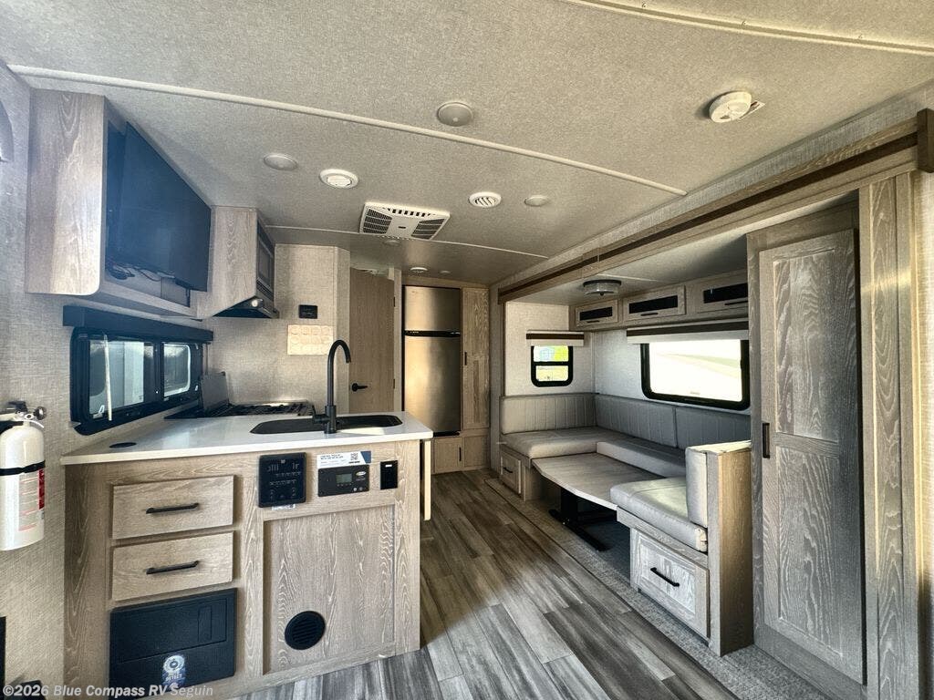 Versatile, cozy, and spacious are just a few ways to describe this travel trailer! Once you arrive at the campsite, unload your gear from the pass-through storage and additional exterior storage, then set up the 15' power awning with LED lights. You may want to visit in your camp chairs, or head inside to prepare lunch on the three burner cooktop. There is a U-shaped dinette within the slide out, plus a wardrobe here for jackets or your guests' clothes. You will also find the 72" sofa is a comfy spot to relax, and at night, you can fold down the RV queen-size Murphy bed!