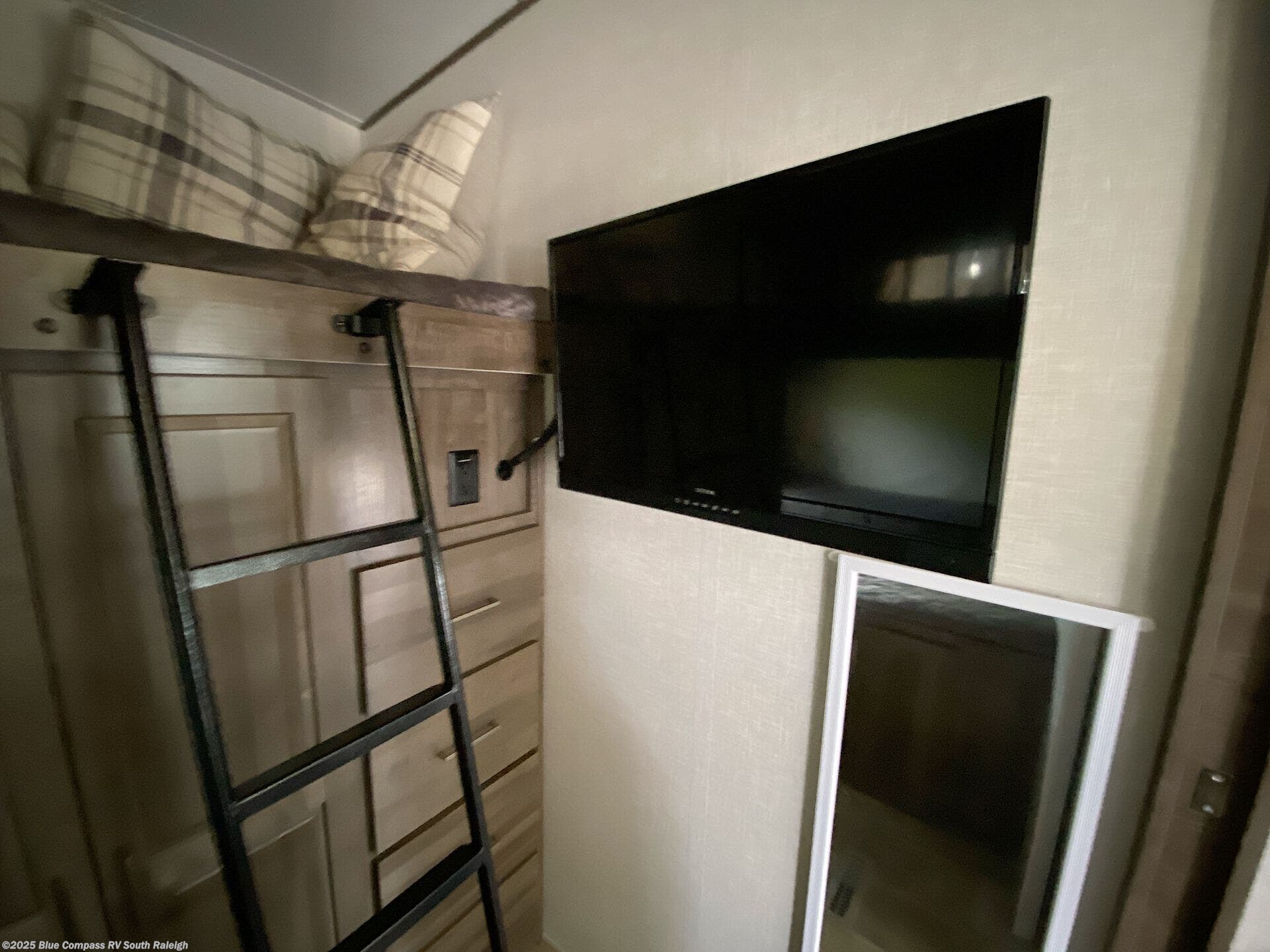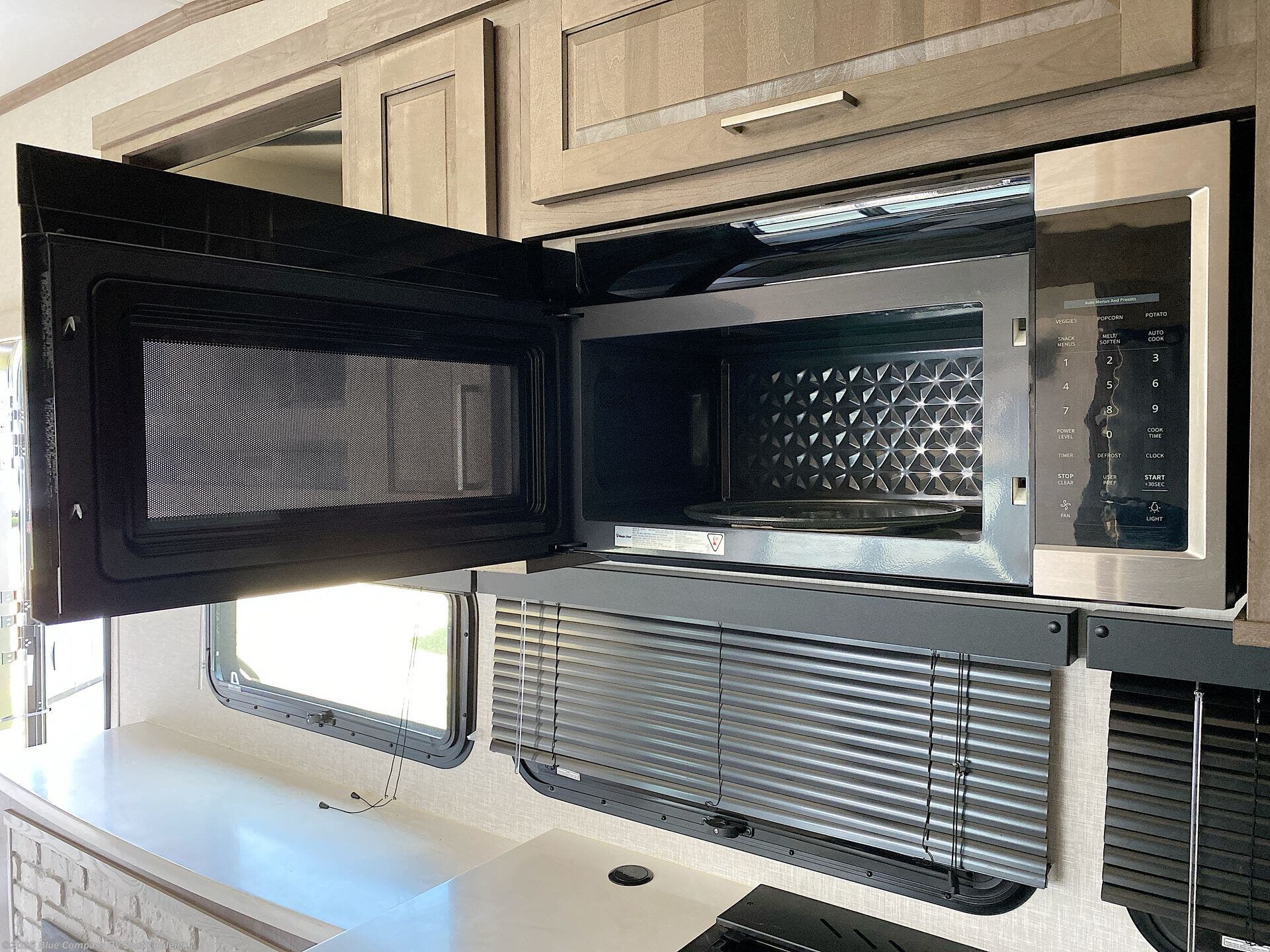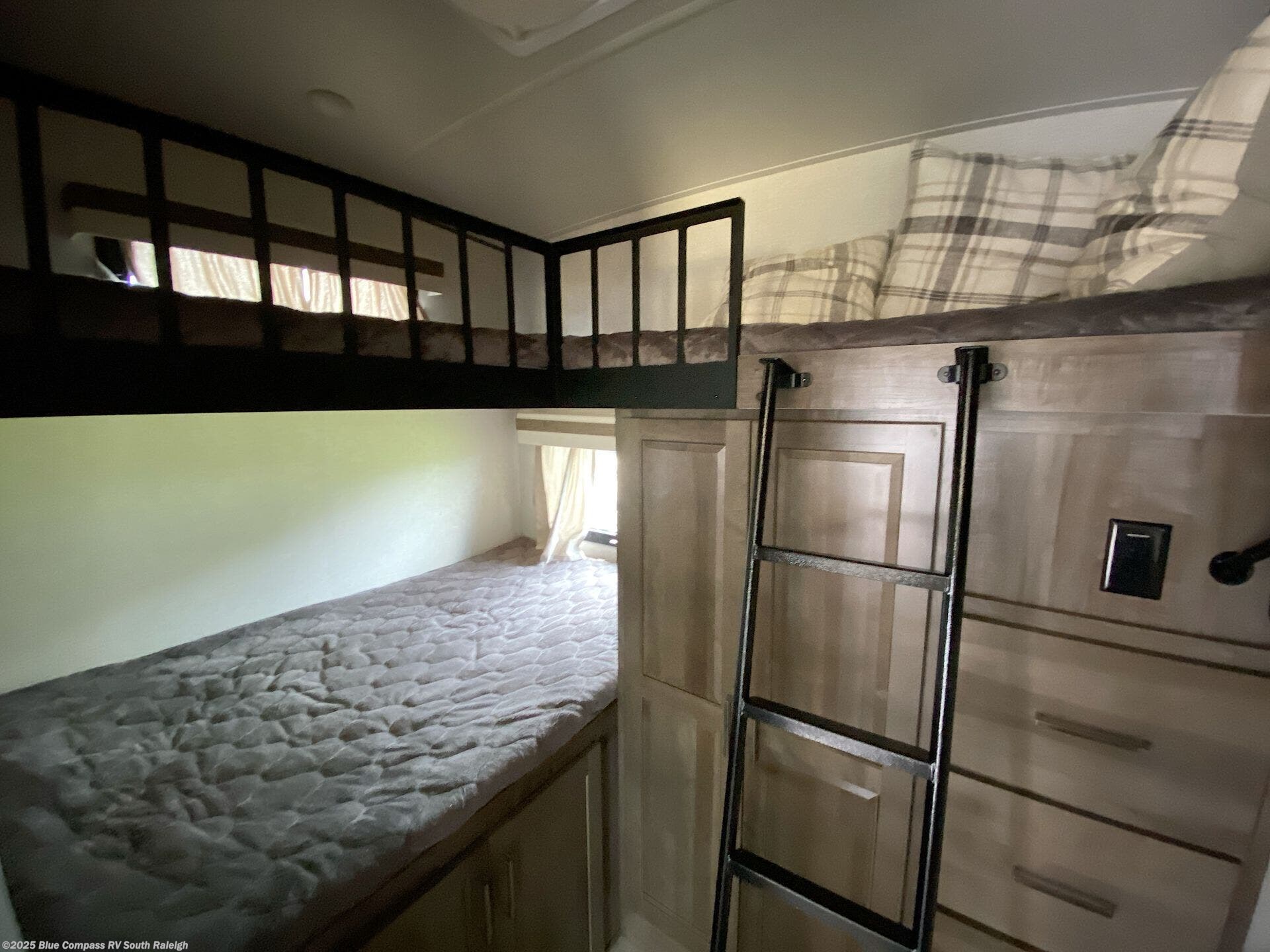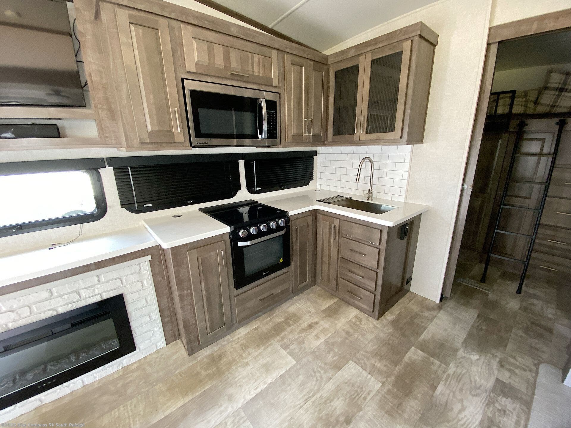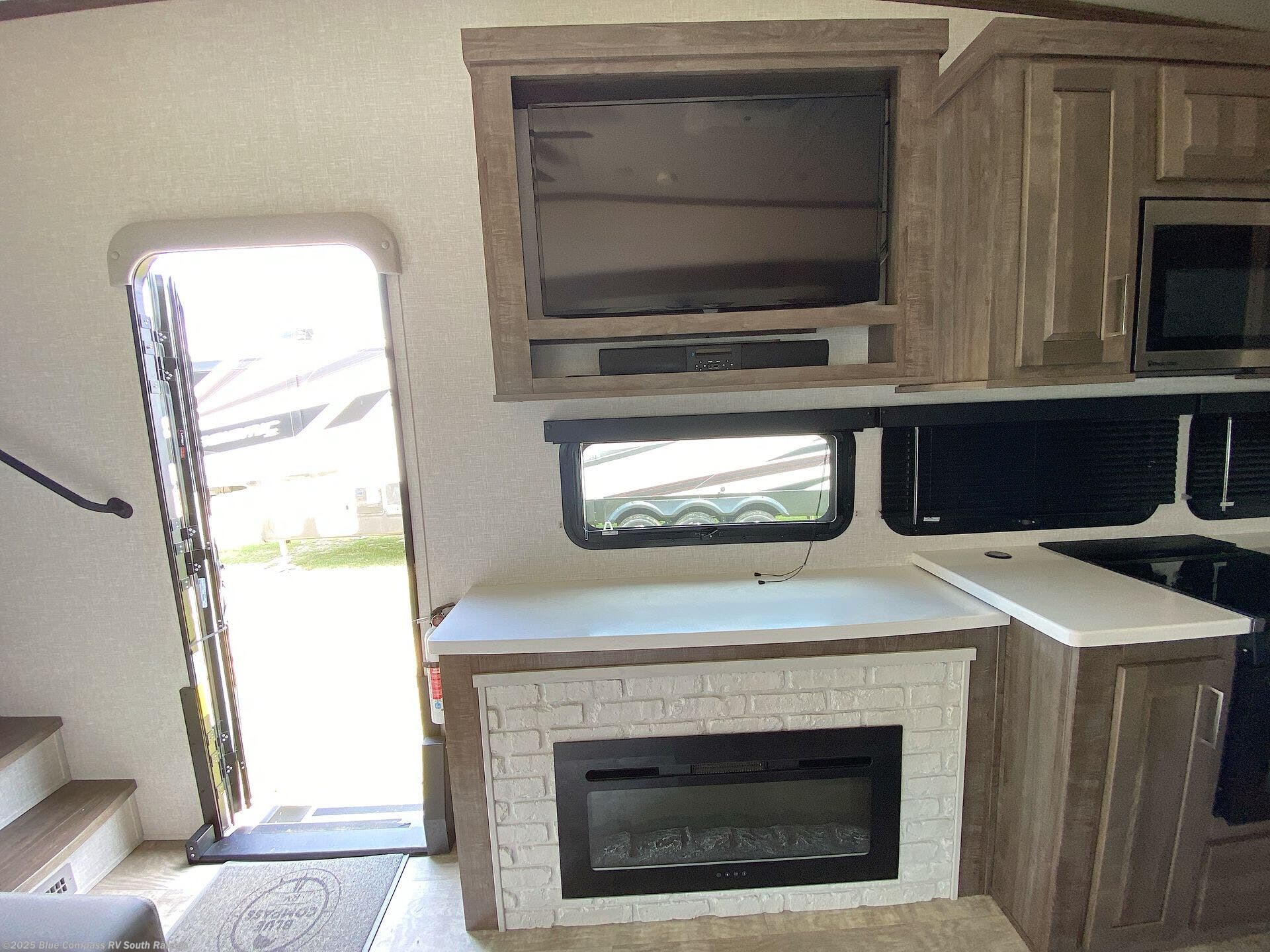 Looking to travel with your family and friends and need lots of space for everyone? This fifth wheel offers a master suite with a queen bed, a wardrobe slide that stretches into the double entry bathroom, plus more storage. On the opposite side of the fifth wheel there is a private bunkhouse with triple bunks, and storage. The main living and kitchen area includes a slide out which offers a king U-shaped dinette to dine at, play games with friends, and provides sleeping if needed, plus an 11 cu. ft. refrigerator and a pantry. There is a hide-a-bed sofa as well, and an LED TV with a fireplace below to enjoy when inside. The cook will have full amenities indoors plus an outside kitchen and a griddle to make more meals while enjoying the outdoors and the 20' power awning.