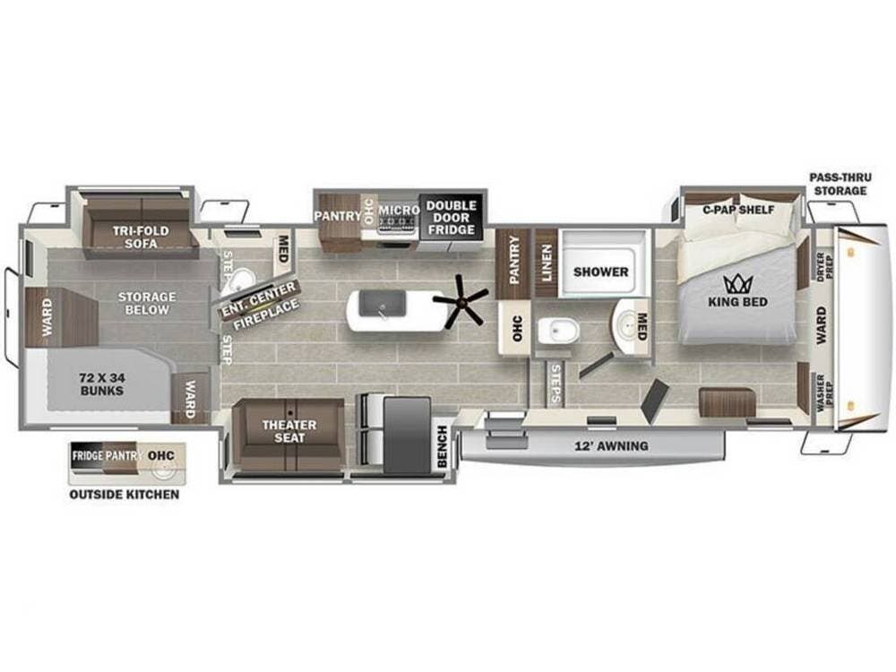 Setup is easy, and the exterior includes an outdoor kitchen for added convenience. Keyless entry and rekeyed storage compartments from RVLocks add security and peace of mind.
