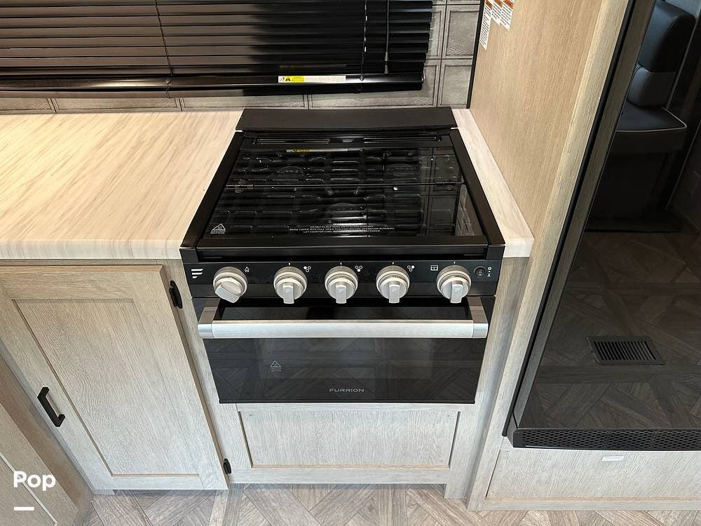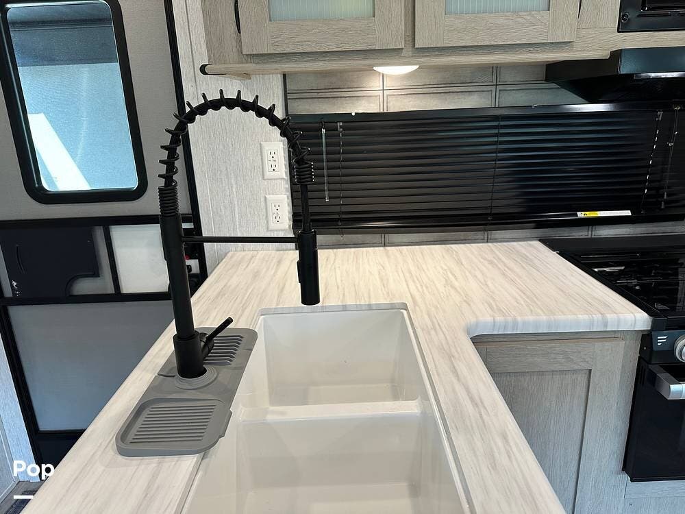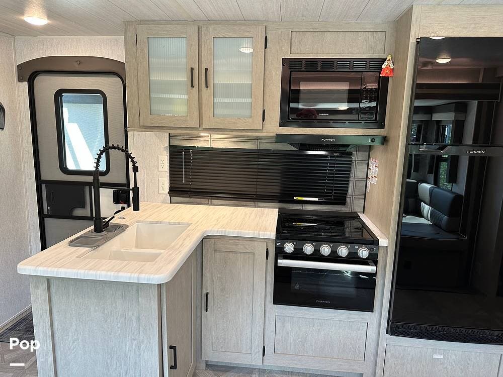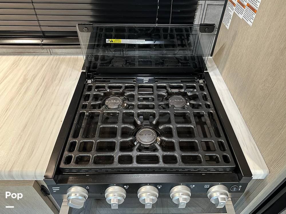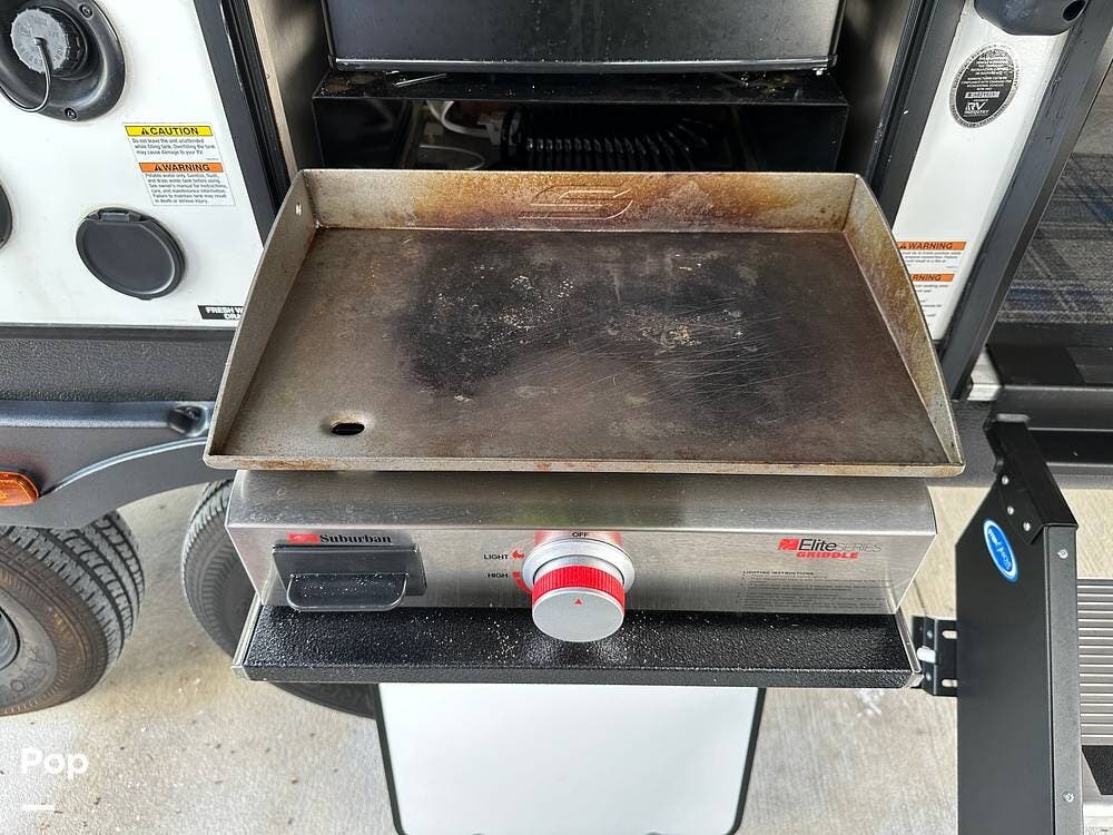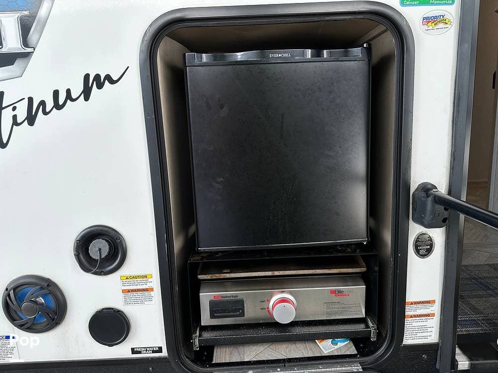 The RV features an outside griddle and refrigerator for outdoor cooking and entertainment, making it easy to enjoy meals while soaking up the great outdoors.