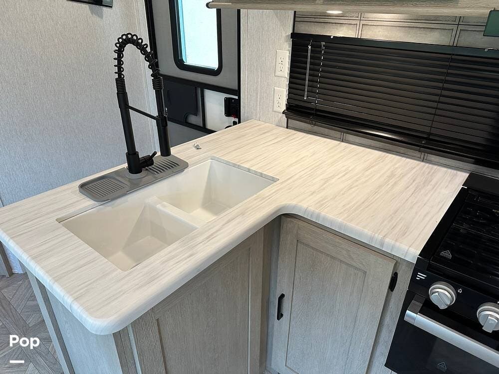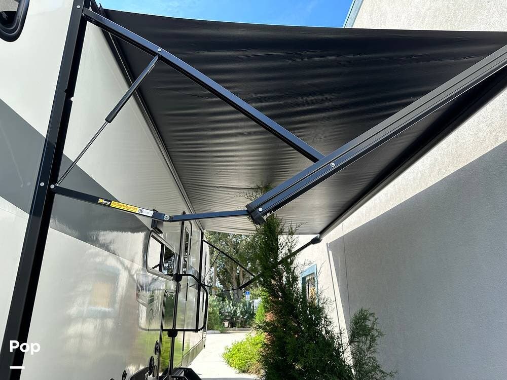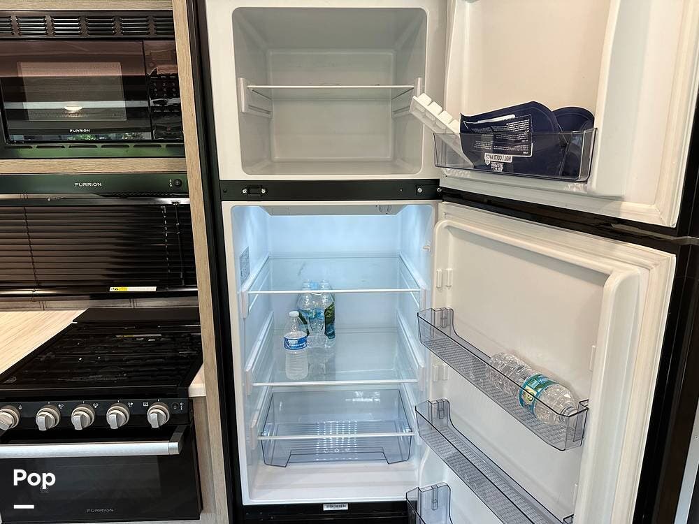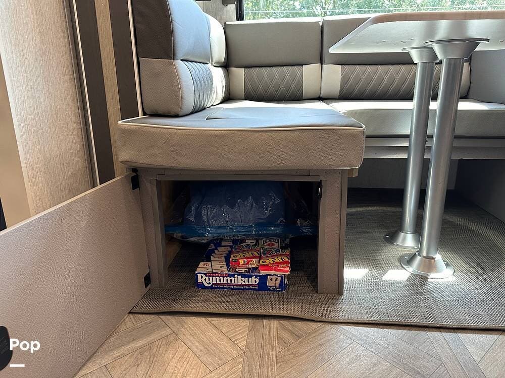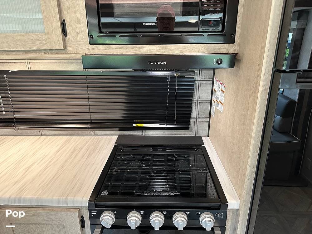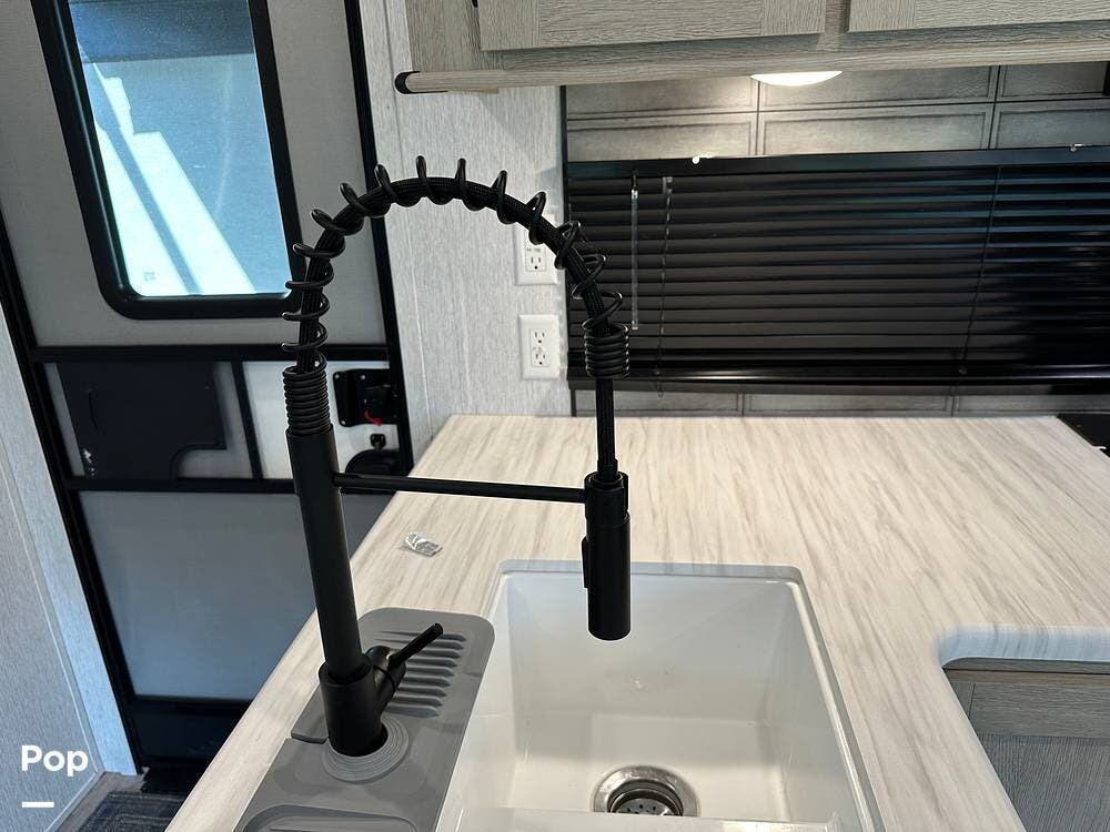 The RV features an outside griddle and refrigerator for outdoor cooking and entertainment, making it easy to enjoy meals while soaking up the great outdoors.