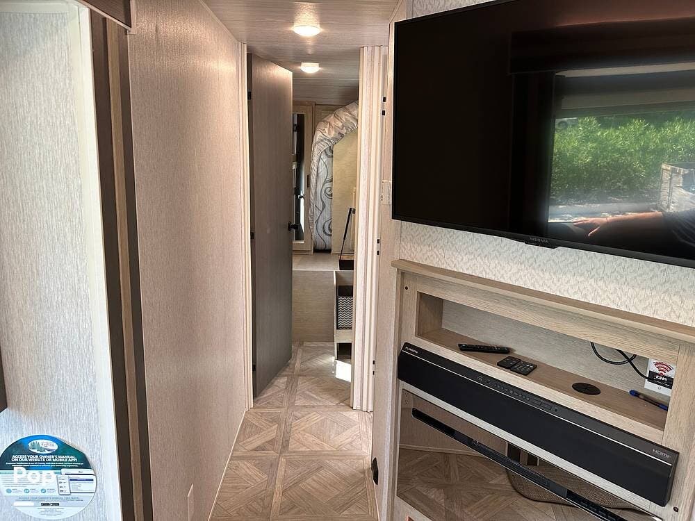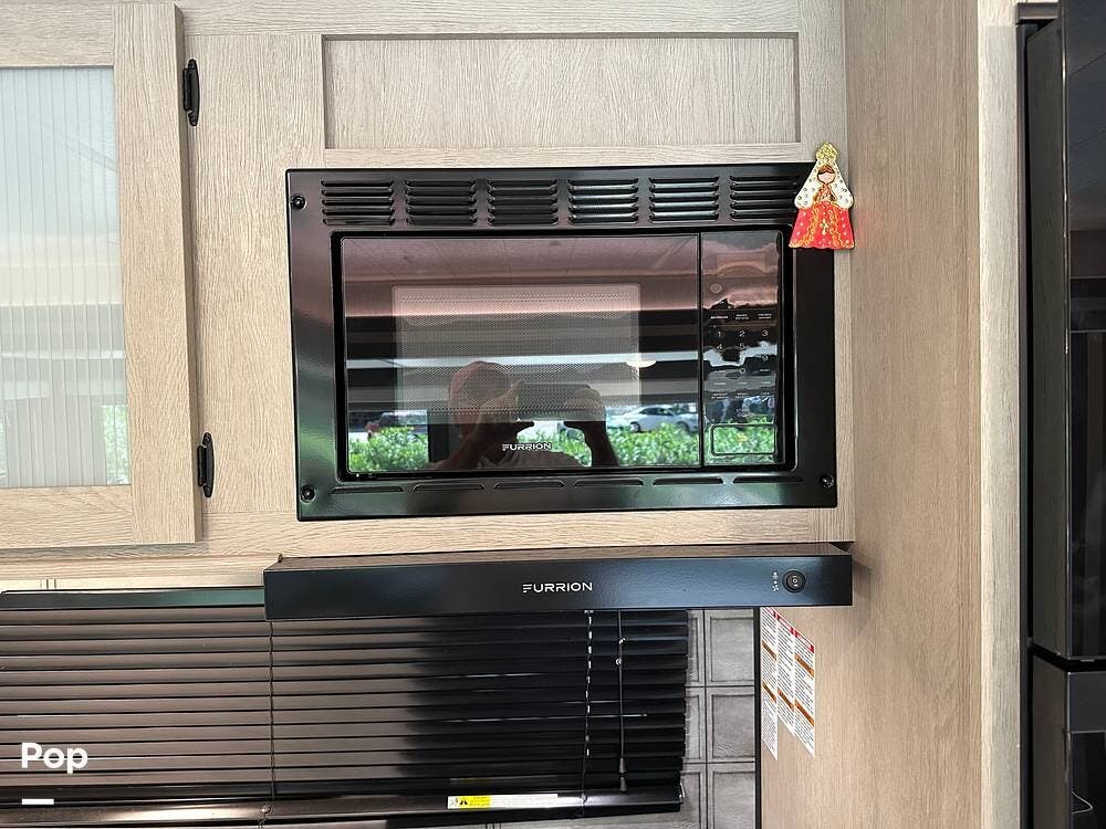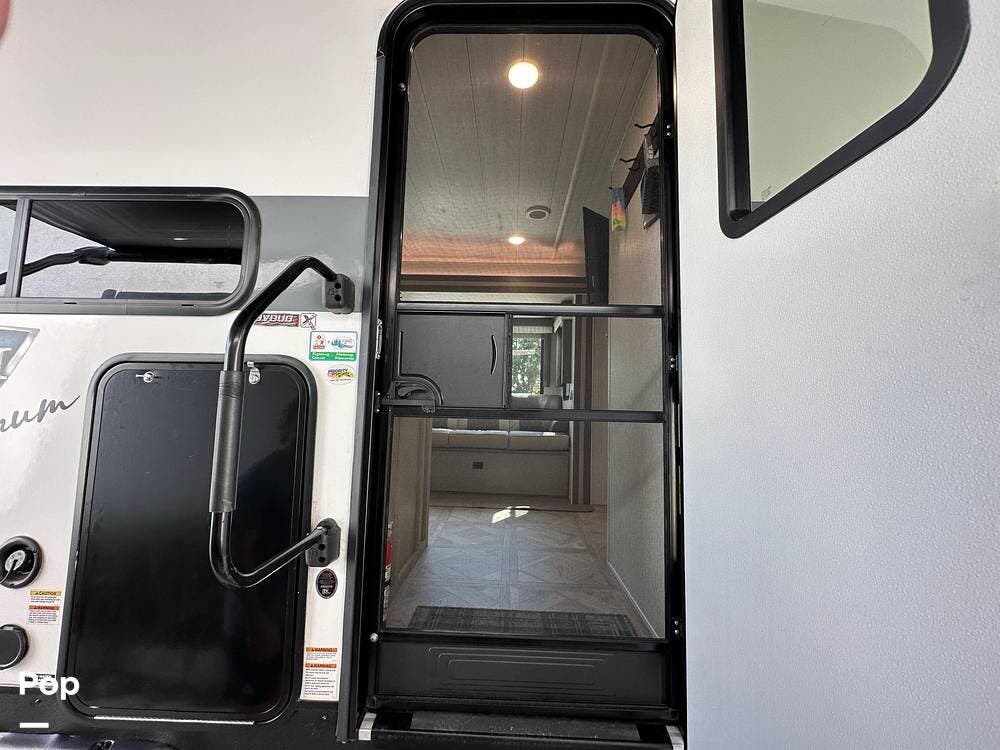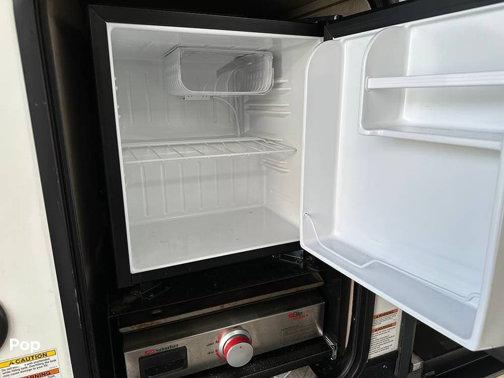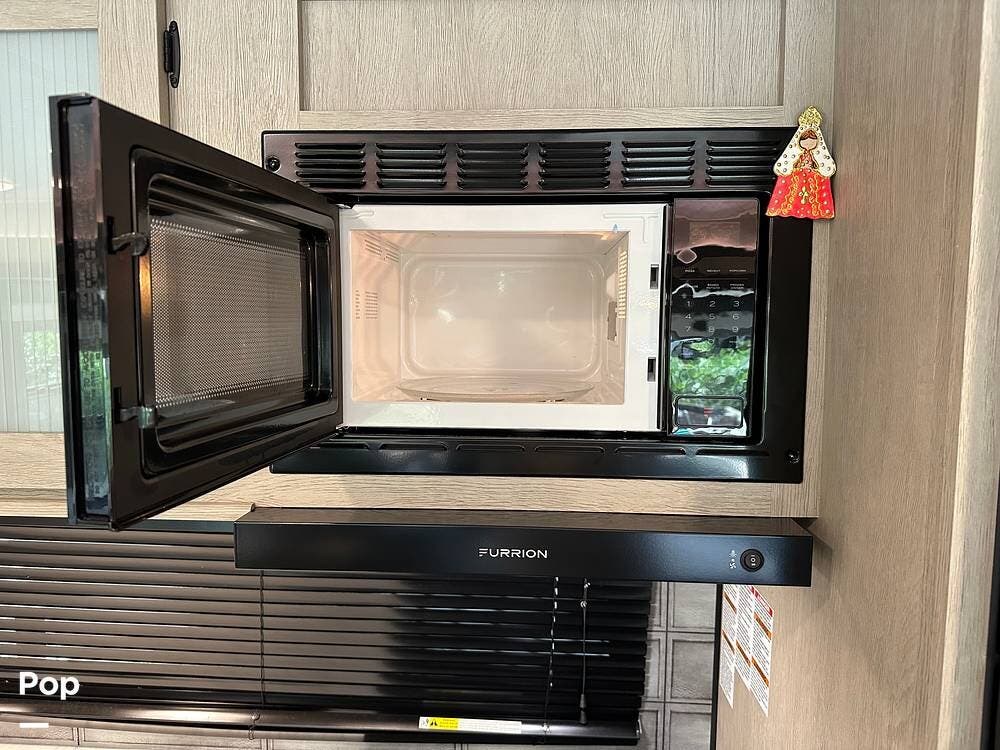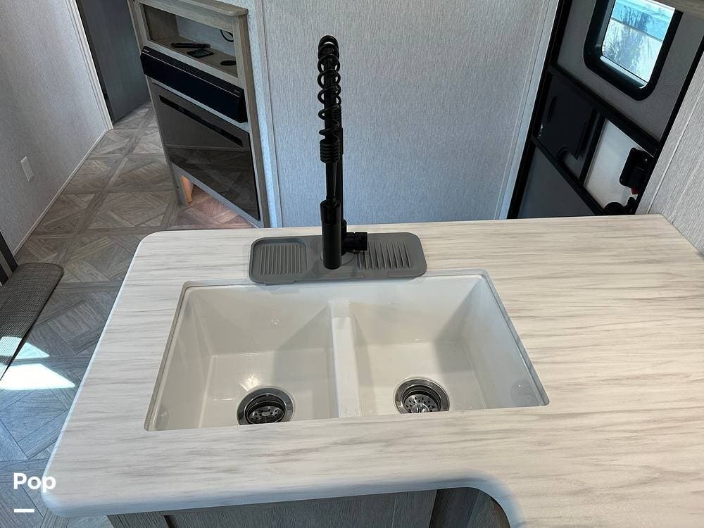 The RV features an outside griddle and refrigerator for outdoor cooking and entertainment, making it easy to enjoy meals while soaking up the great outdoors.