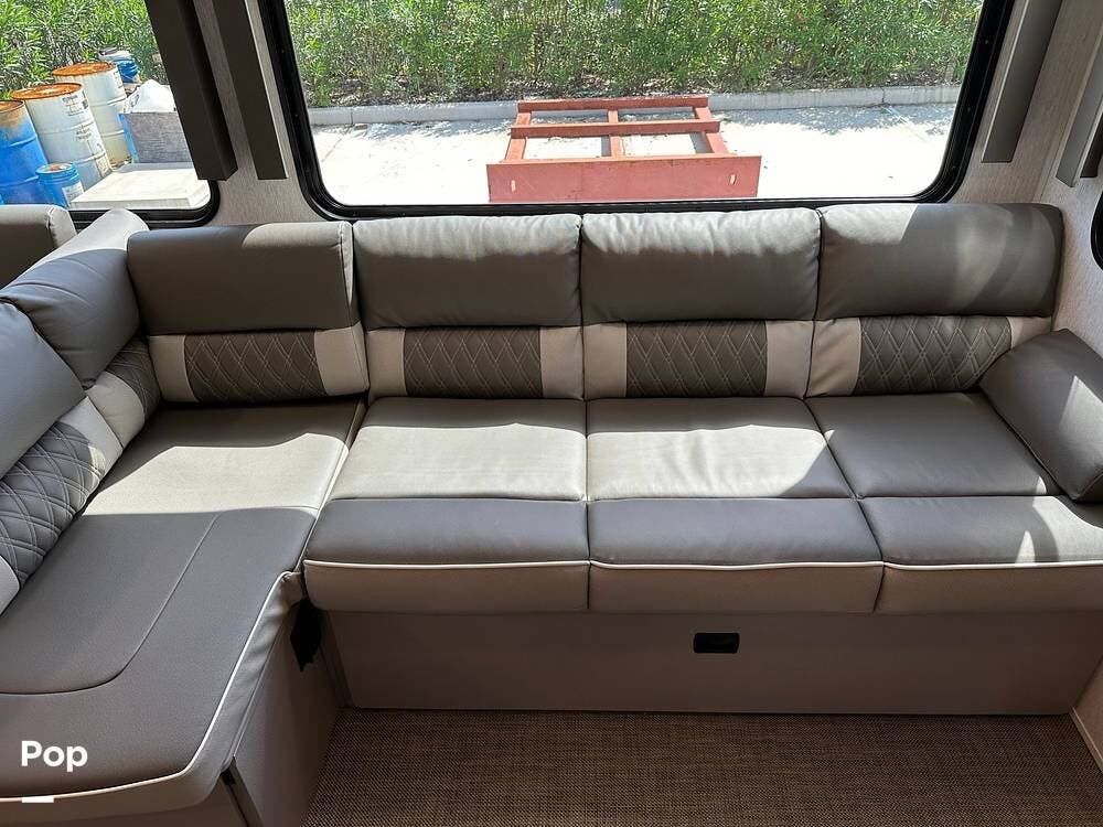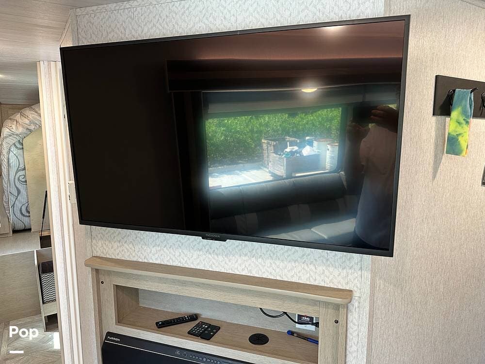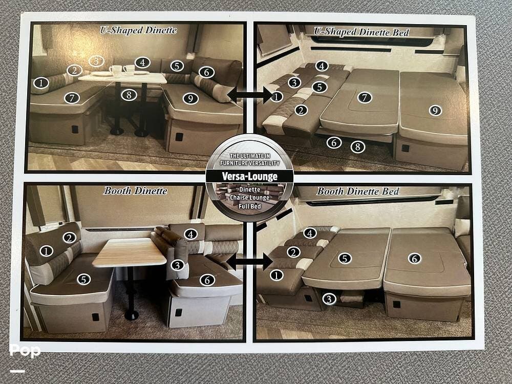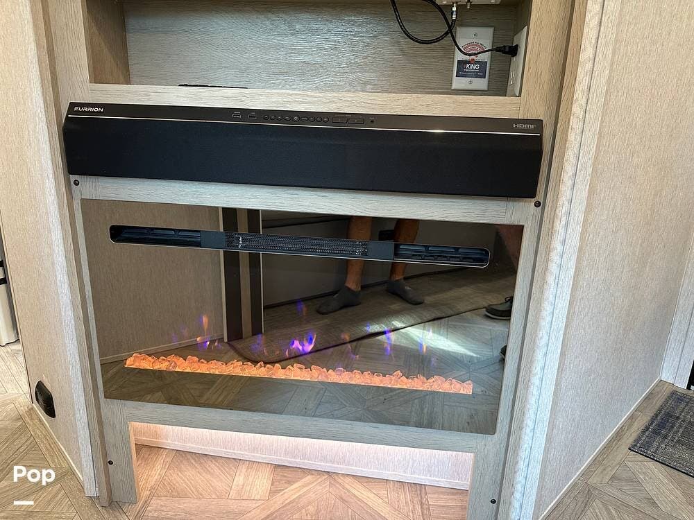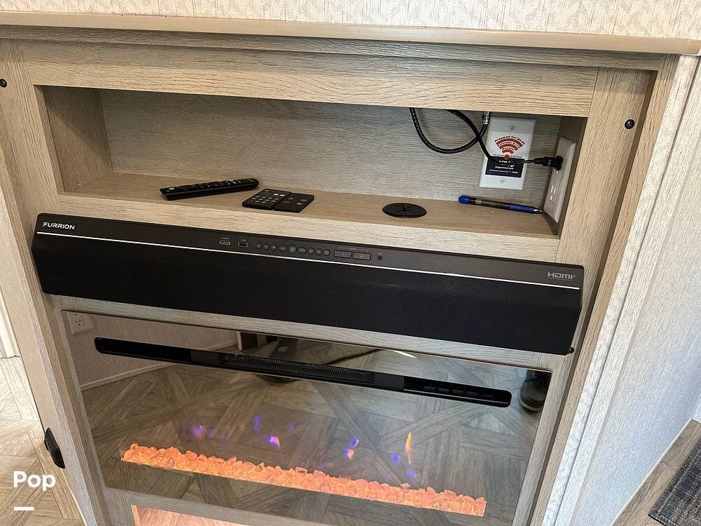 The full kitchen has a large pantry, offering ample storage space for all your cooking essentials. The customized dinette and couch can be easily configured to your liking, allowing you to create a cozy and functional living space. The entertainment center with a fireplace adds a touch of luxury and warmth to the RV, creating the perfect ambiance for relaxation.