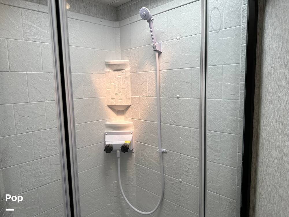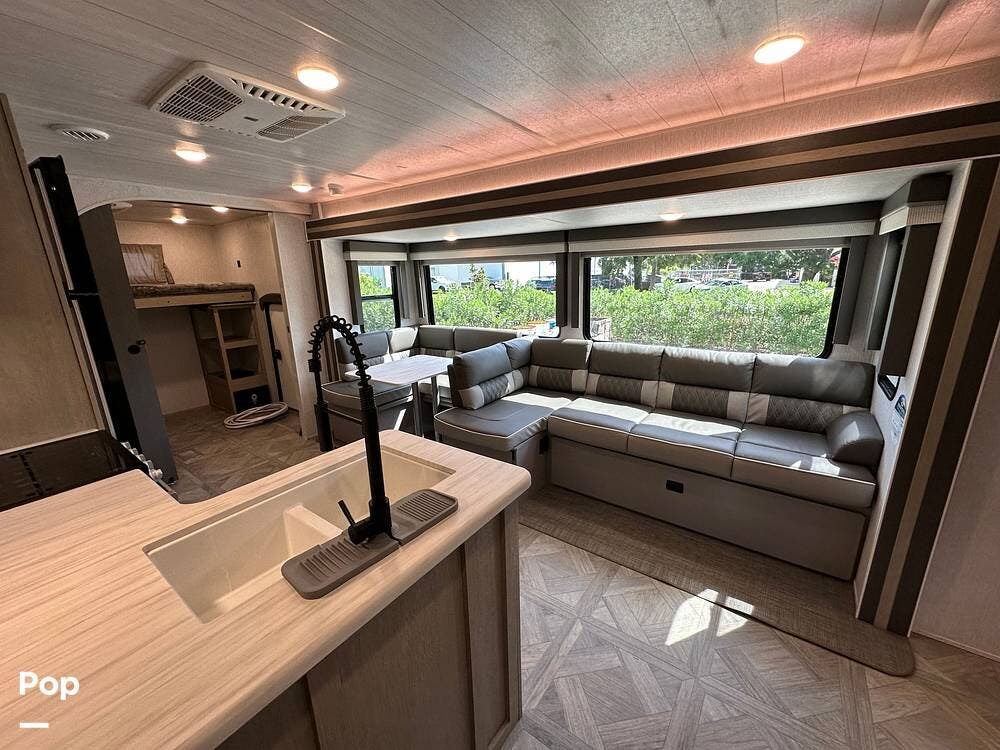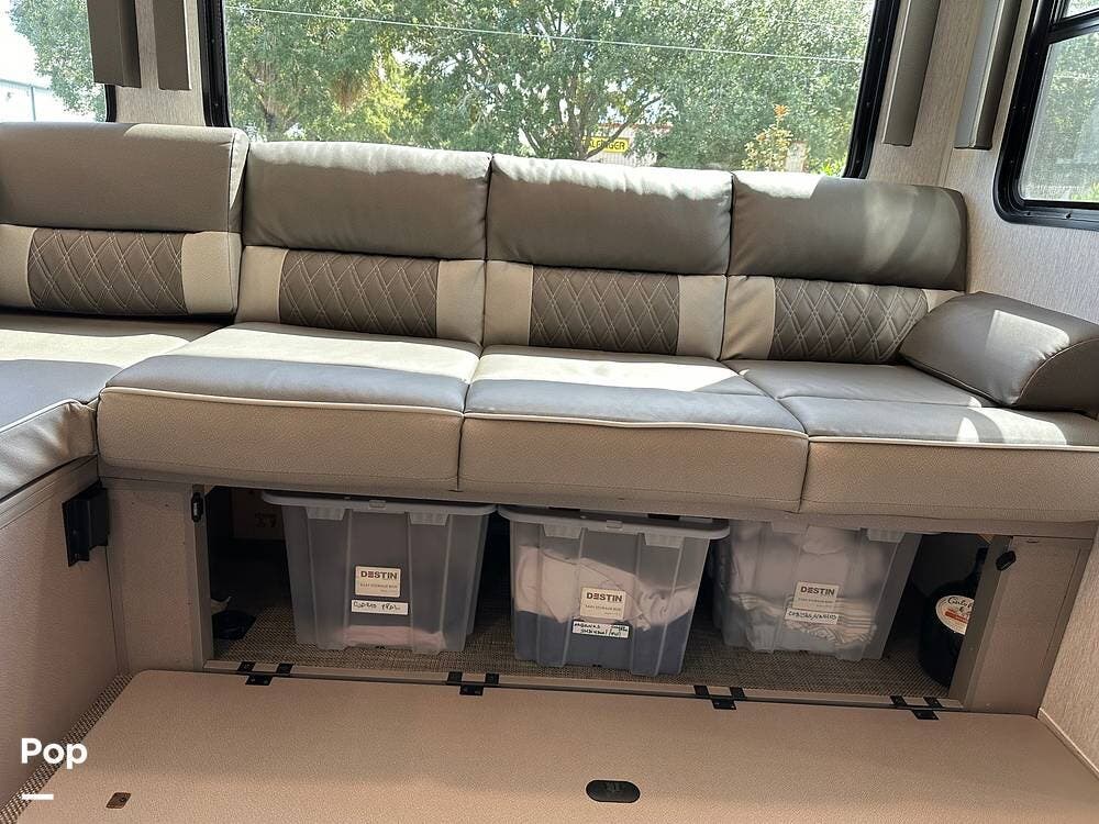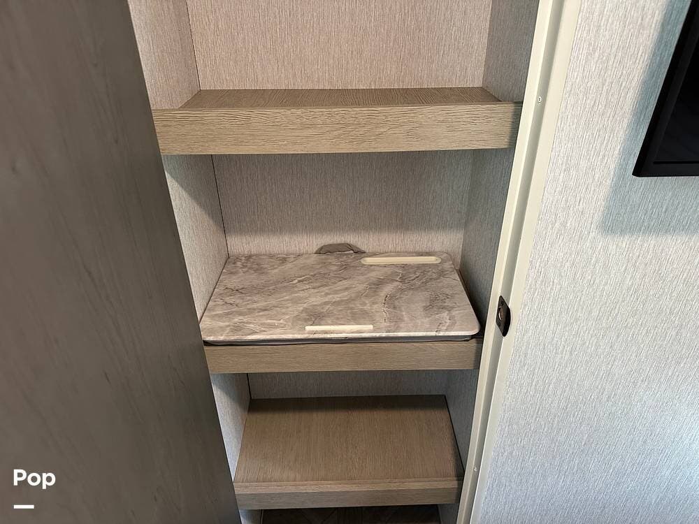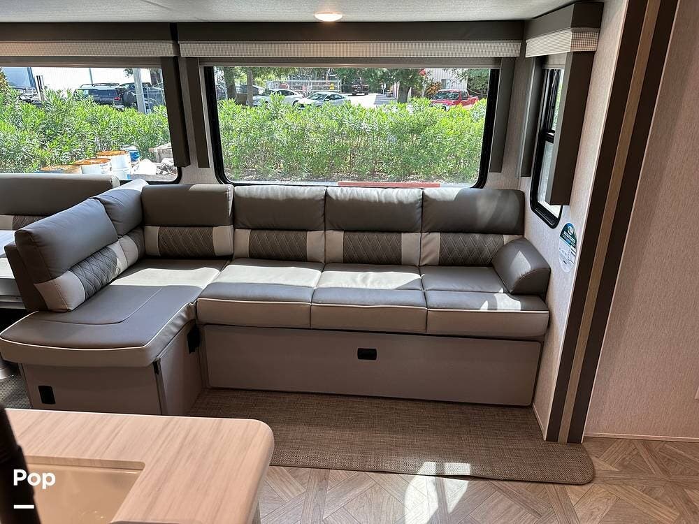 The full kitchen has a large pantry, offering ample storage space for all your cooking essentials. The customized dinette and couch can be easily configured to your liking, allowing you to create a cozy and functional living space. The entertainment center with a fireplace adds a touch of luxury and warmth to the RV, creating the perfect ambiance for relaxation.
