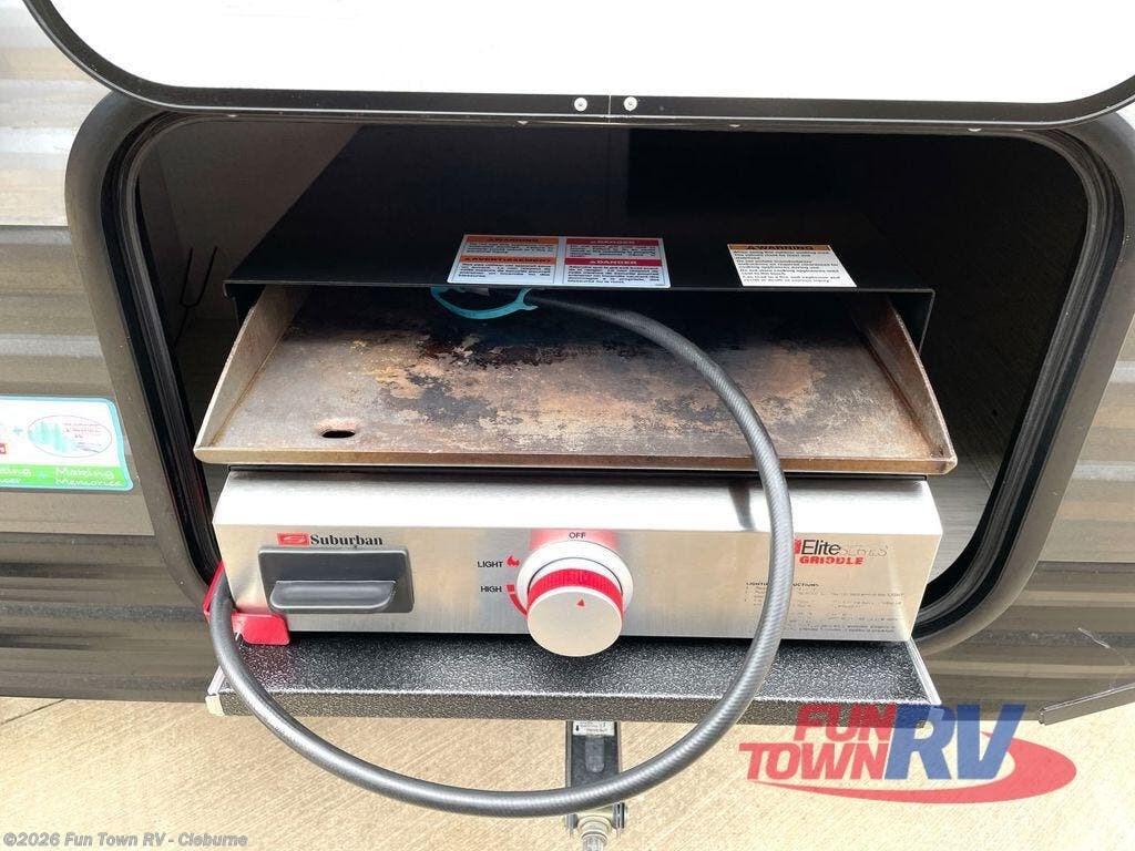 This travel trailer is perfect for couples who want to explore the great outdoors together! There is a rear private bedroom with a queen bed slide for more interior space, a dresser and wardrobes on either side of it for your clothes. Plus, it enters right into the split style bathroom which will come in handy when one person wants to freshen up in the shower while another uses the private toilet and sink. You can prepare your best home cooked meals with the two burner cooktop then enjoy it at the front U-shaped dinette which can also transform into an extra sleeping space. Enjoy making pancakes on the outdoor kitchen under the 15' power awning!