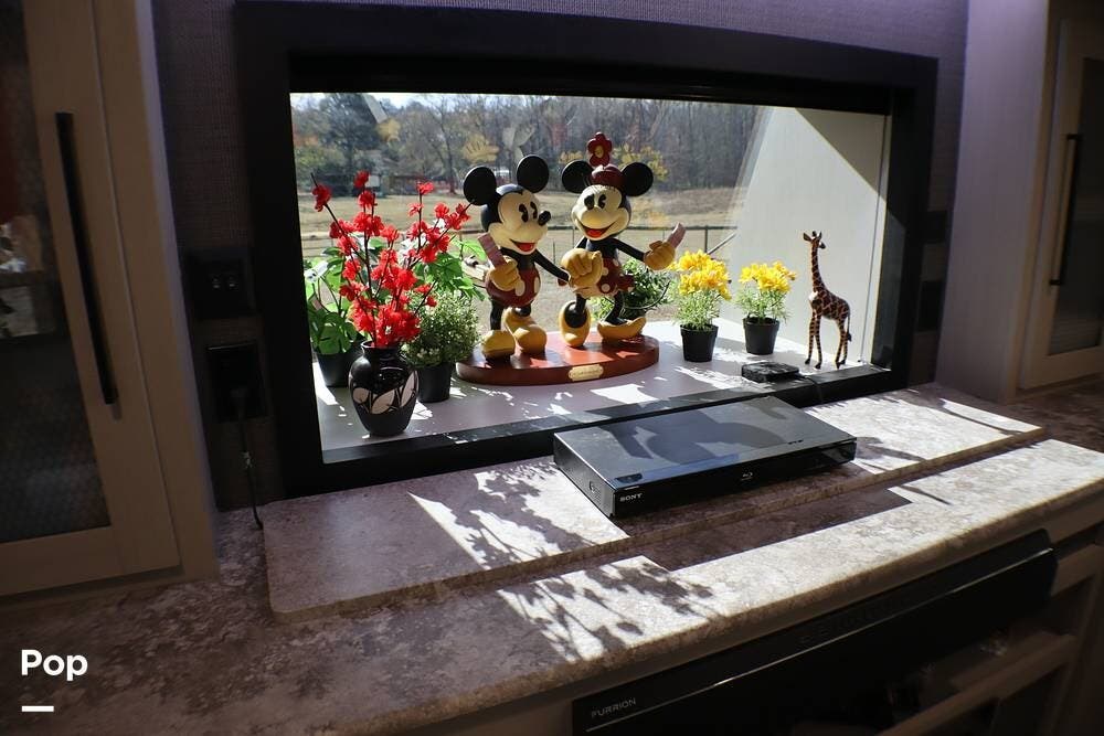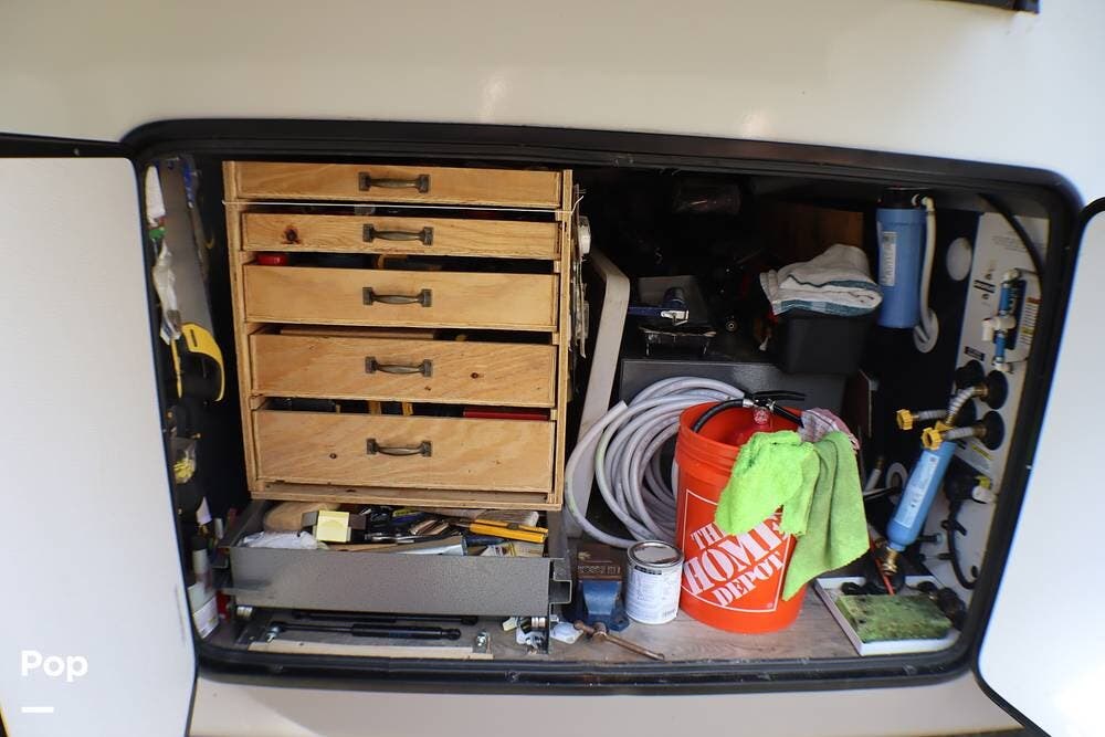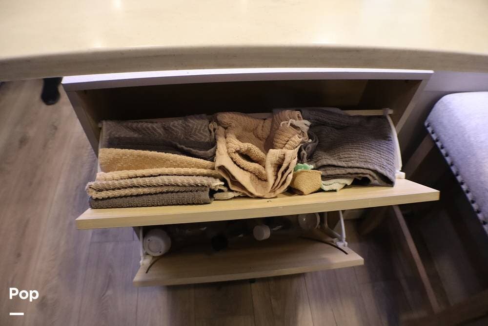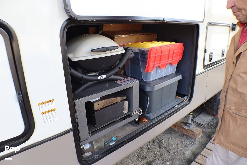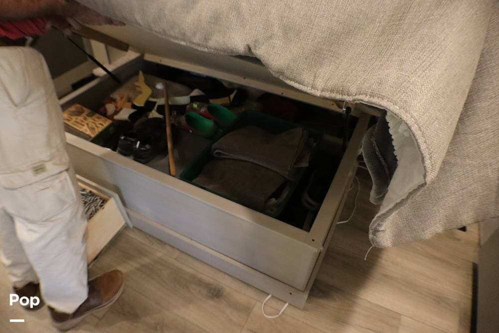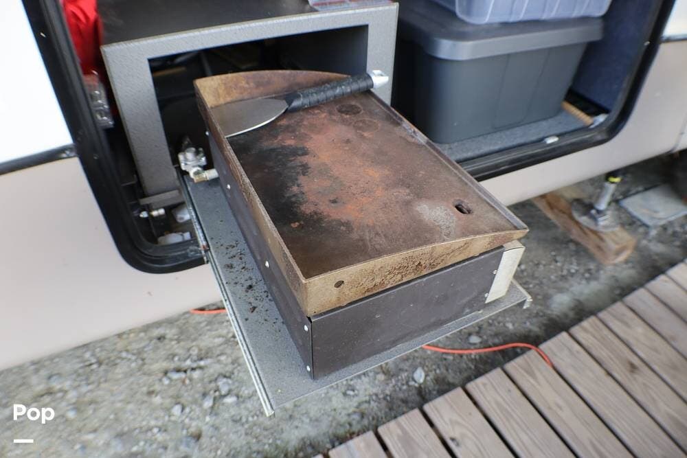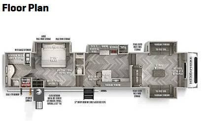 It has an exterior TV, sink, and flat-top griddle for your outdoor entertainment. There are many exterior storage opportunities.
