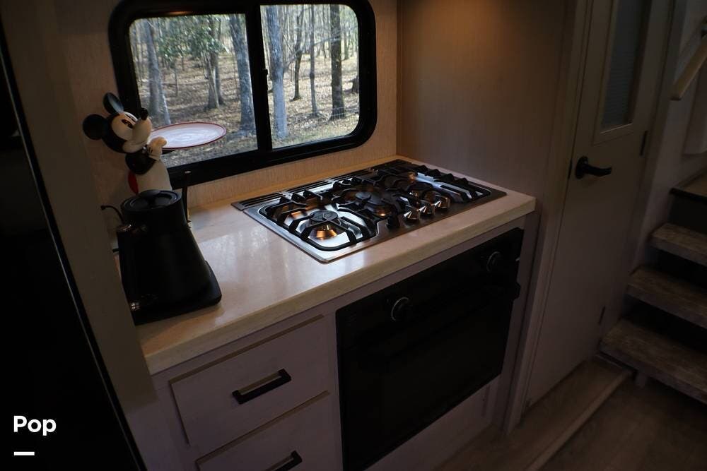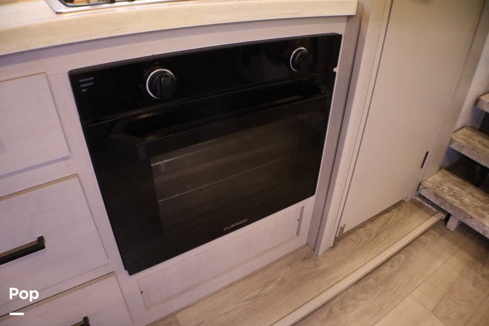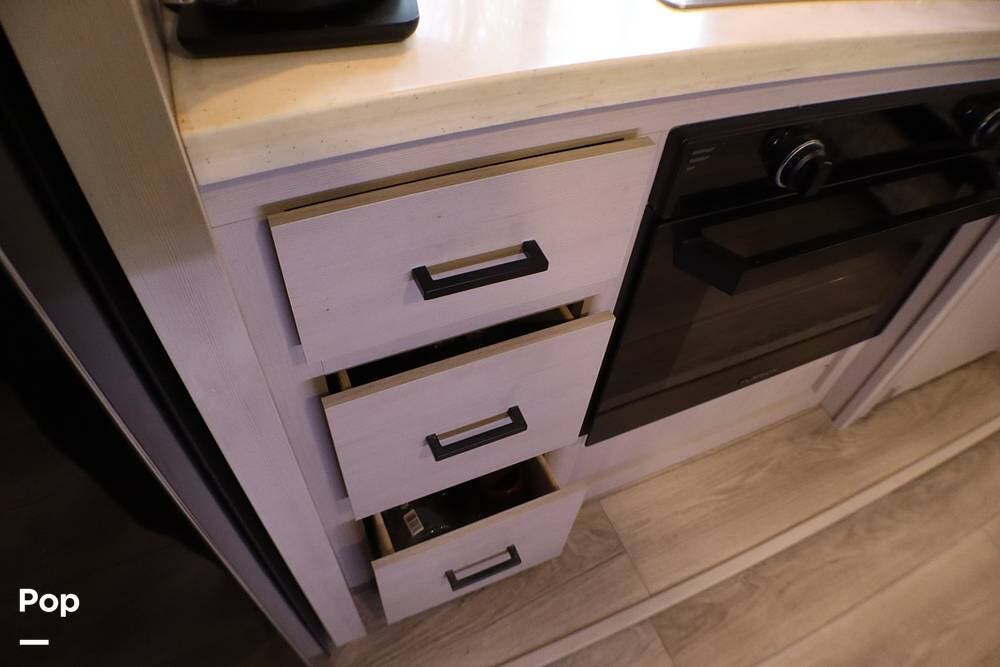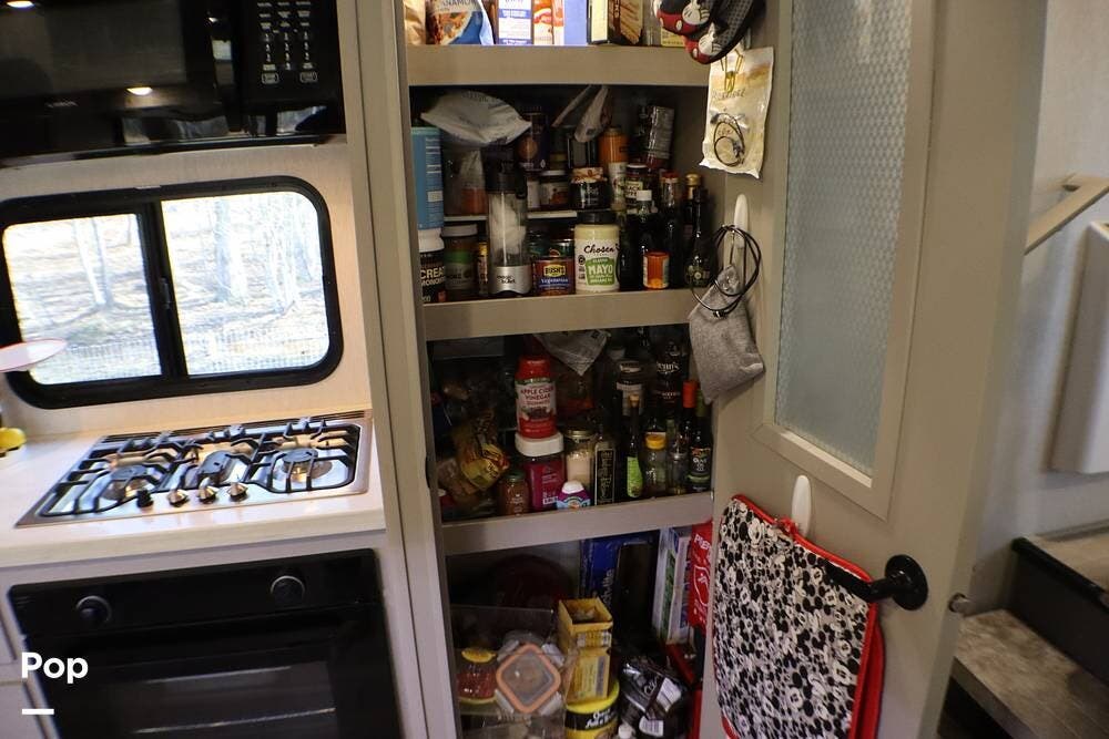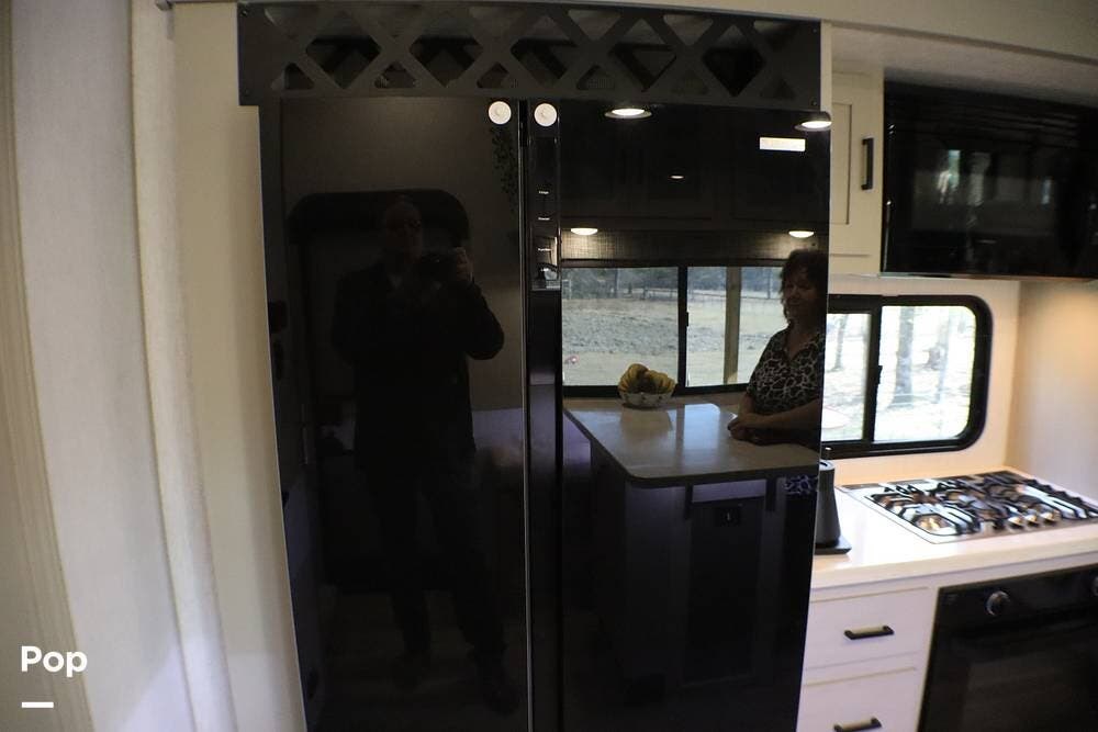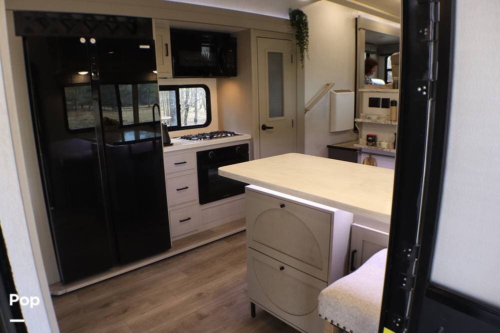 When you enter the RV, you are greeted with a Chef-style kitchen with bench-style seating. It has a full-size refrigerator, 3-burner cooktop, and oven. Above the cooktop is a microwave. There is a large pantry with ample storage.