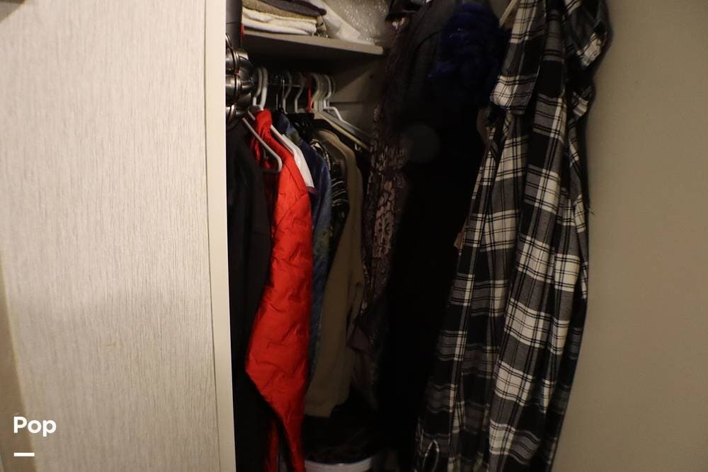 The master bedroom has a residential King-size bed with ample storage under the bed. There is a dresser with multiple drawers for your wardrobe. There is a closet for hanging clothes. Inside the closet, there are washer/dryer prepped hookups.