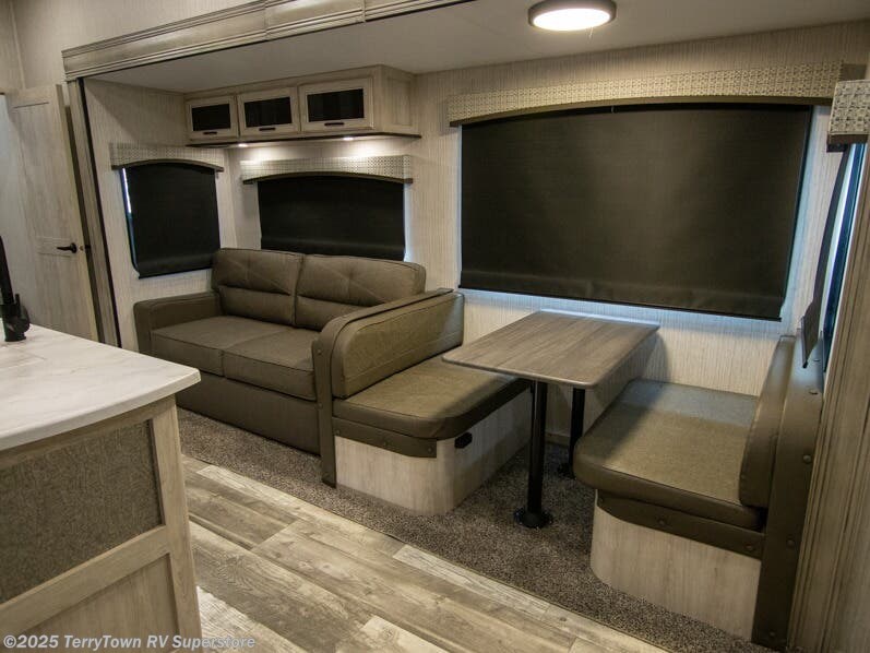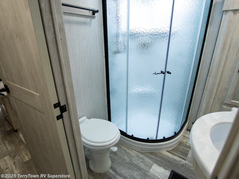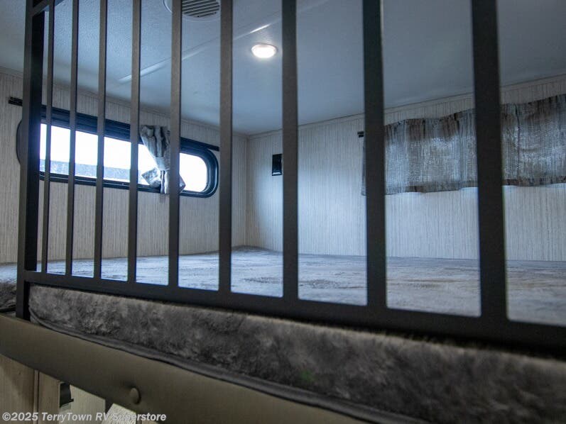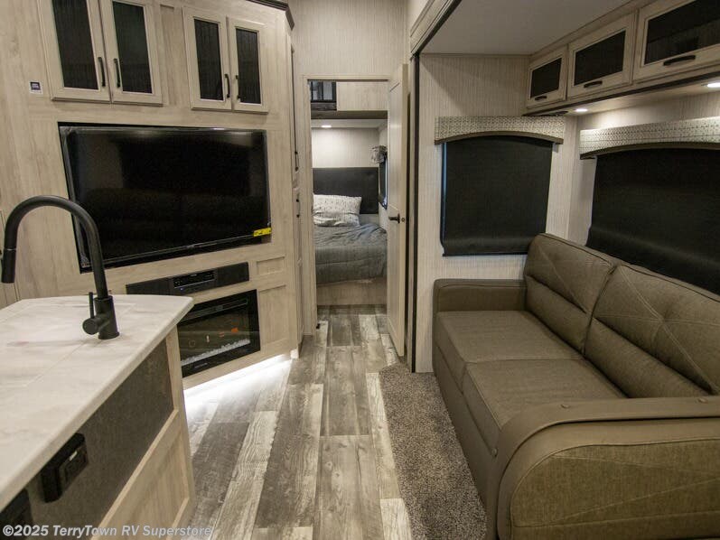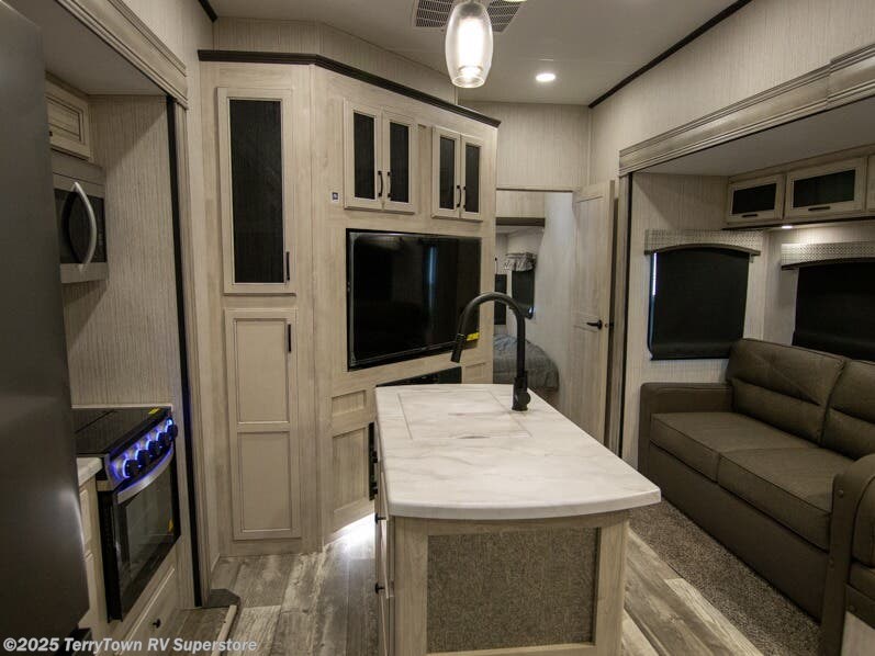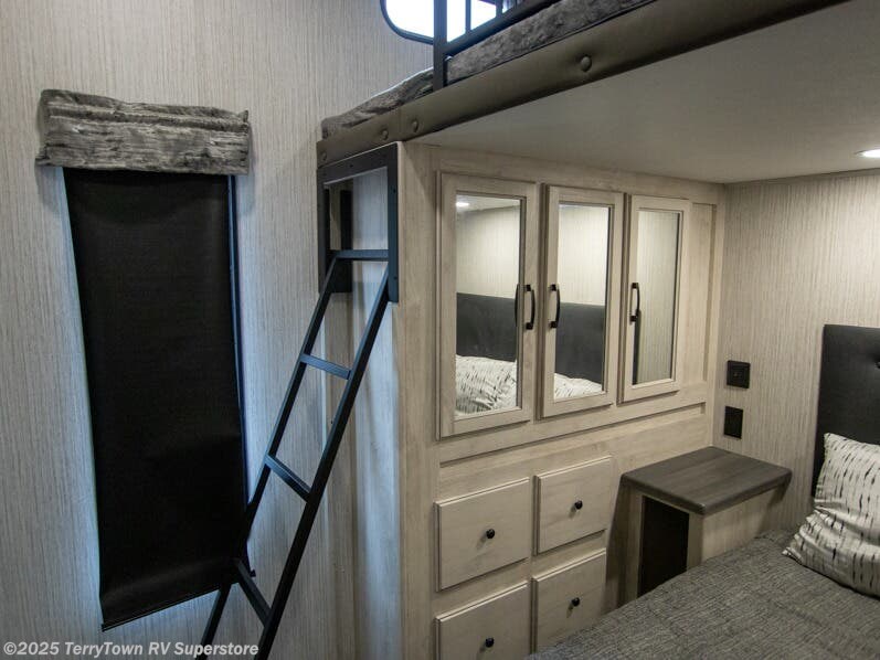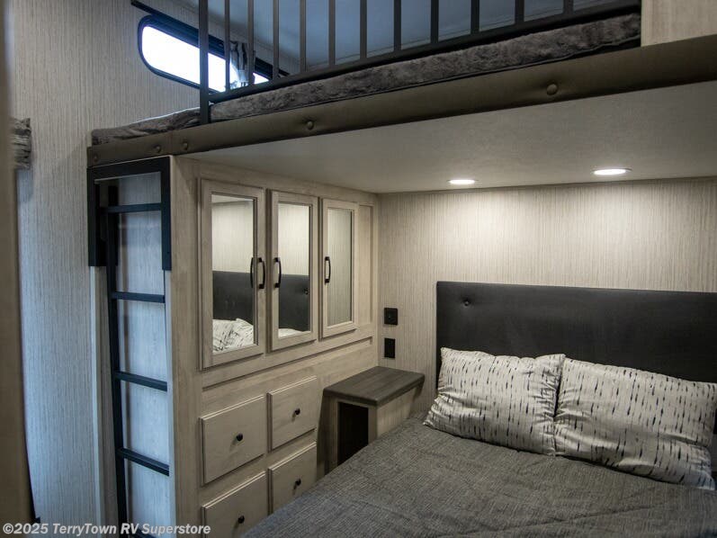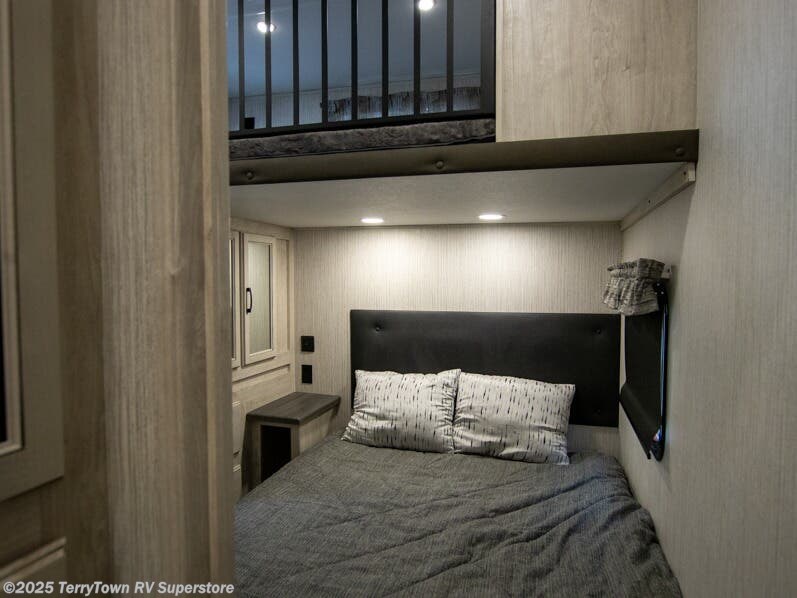 If you want the perfect blend of entertainment, usability, and sleeping space then check out this fifth wheel! One of the dual entry doors leads directly into the half bathroom located in the rear private bedroom. Inside this bedroom is a 60" x 74" bed with a 54" x 74" loft bed above it. There is also a second private bedroom up front with a queen bed, a wardrobe/linen slide, and an entrance into the dual entry bathroom. A couple more guests can tag along and sleep on the tri-fold hide-a-bed sofa and booth dinette once converted. A few exterior features you will enjoy include a bumper mount swivel gas grill next to an outside refrigerator, MORryde steps with strut assist, and an unobstructed pass-through storage area for your gear!