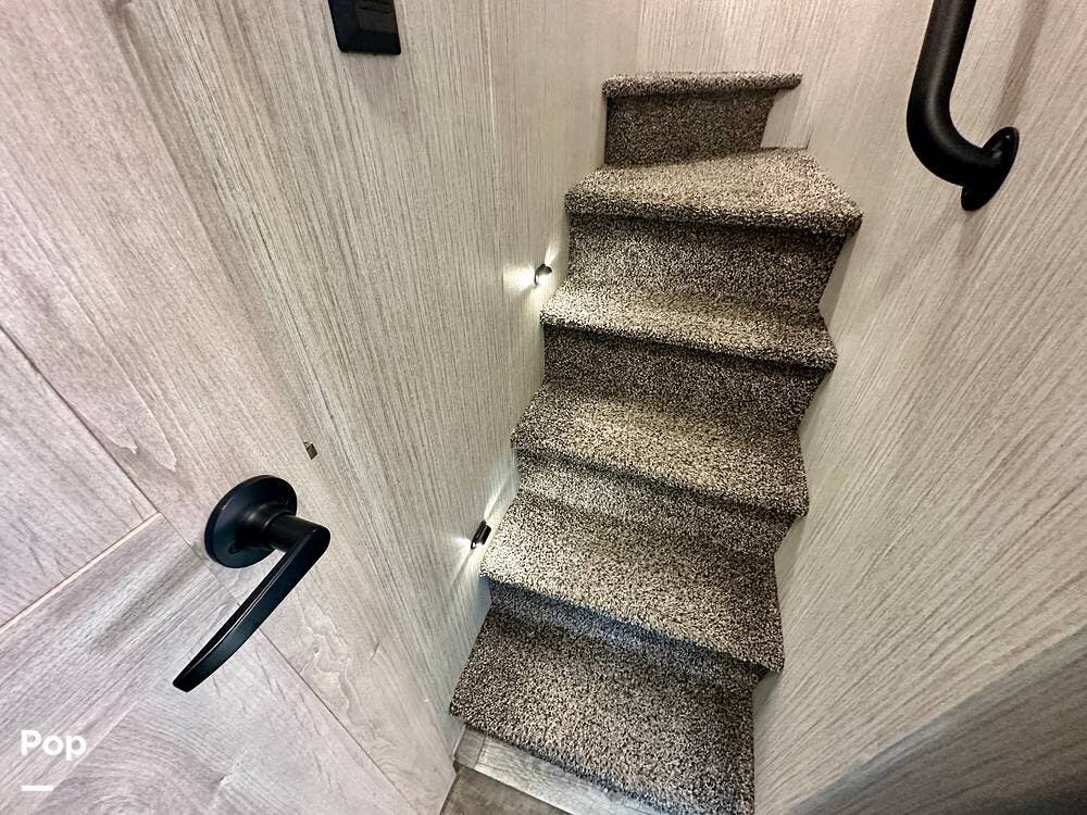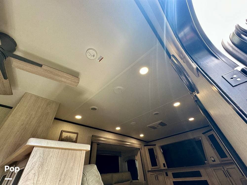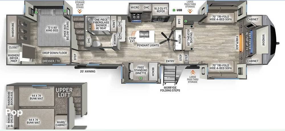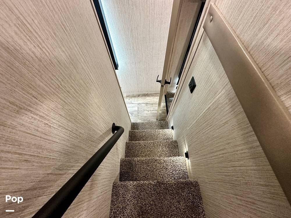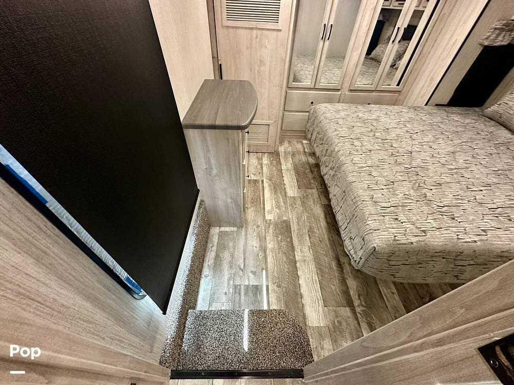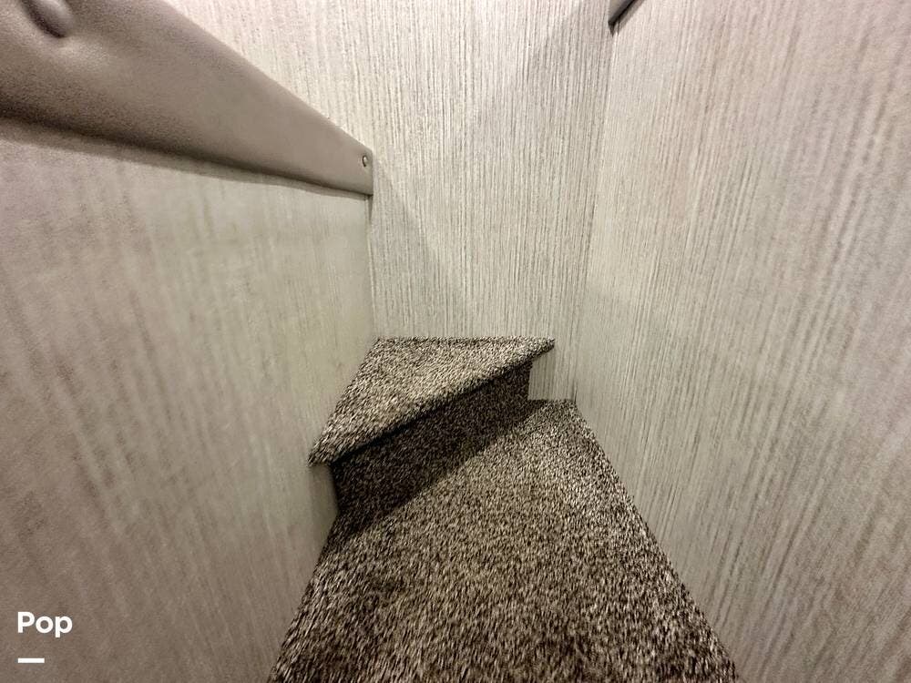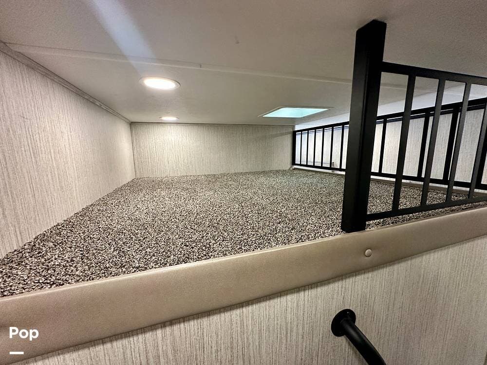 Up front, the elevated living area creates a true gathering space, with opposing seating, large panoramic windows, and an entertainment center anchored by a fireplace that adds both warmth and ambiance on cool evenings. It's a space designed for relaxing after a long day, whether that means watching a movie, enjoying a quiet morning coffee, or simply taking in the view from wherever you've decided to park. Nice loft area with two sides outside the primary bedroom. Televator TV over the fireplace hides away when not in use.