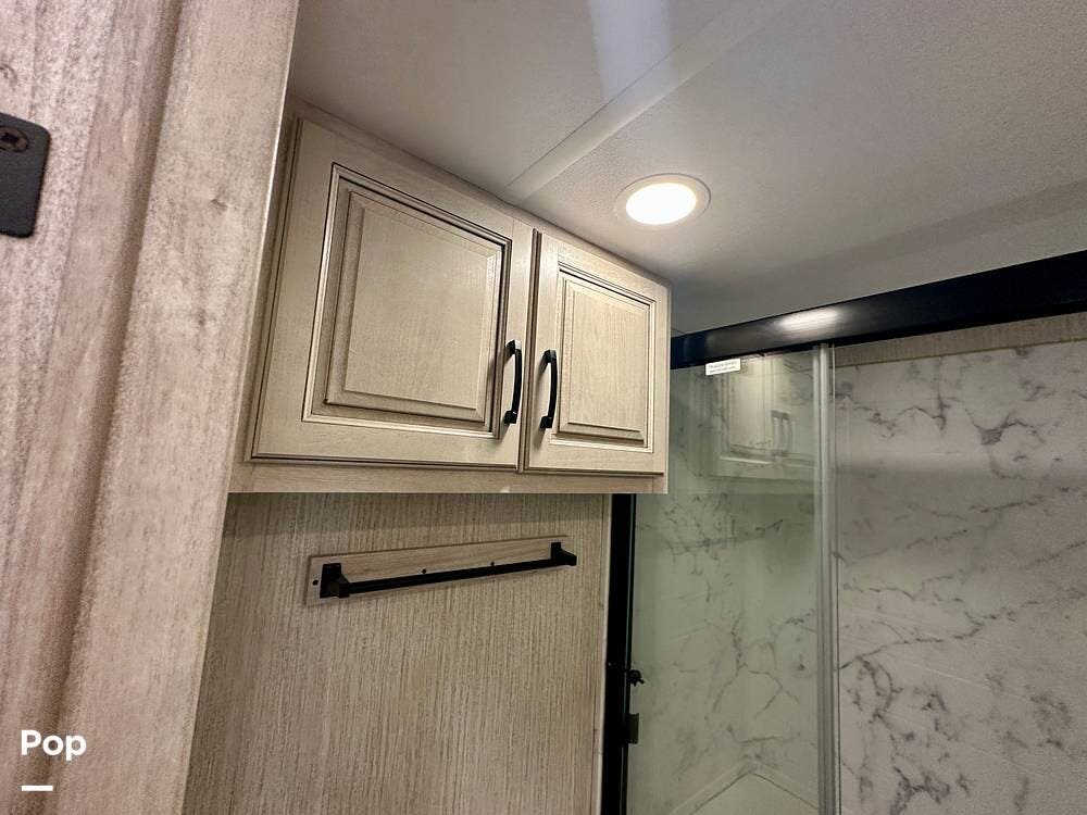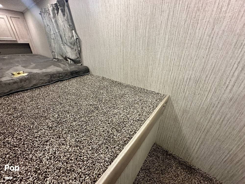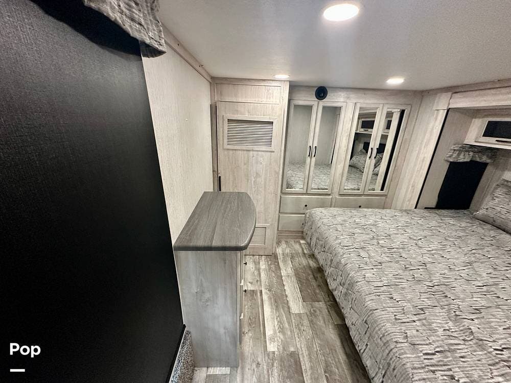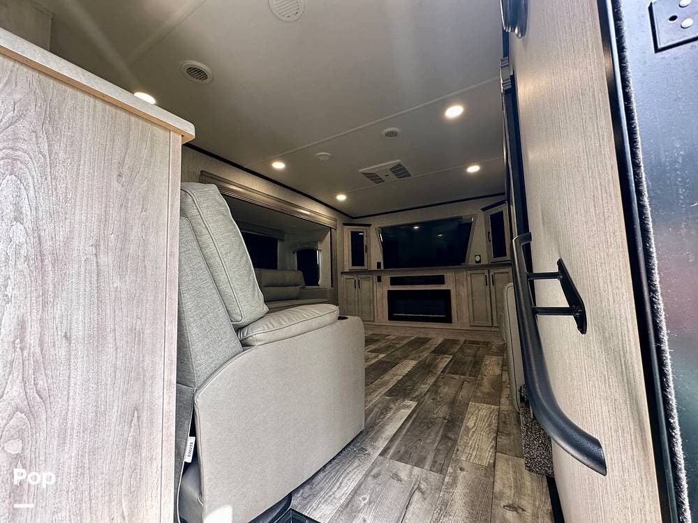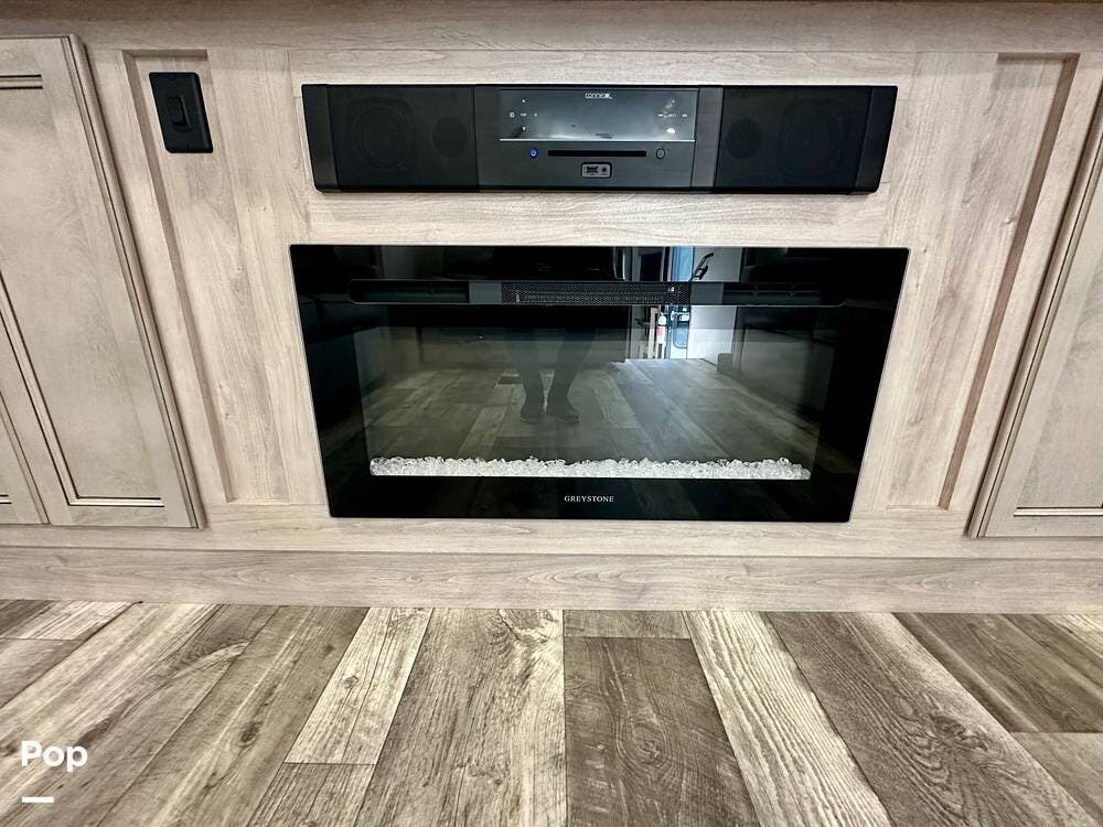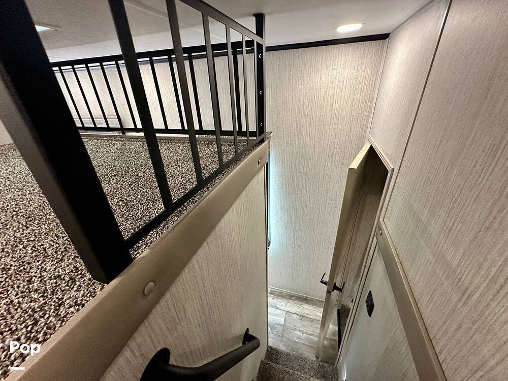 Up front, the elevated living area creates a true gathering space, with opposing seating, large panoramic windows, and an entertainment center anchored by a fireplace that adds both warmth and ambiance on cool evenings. It's a space designed for relaxing after a long day, whether that means watching a movie, enjoying a quiet morning coffee, or simply taking in the view from wherever you've decided to park. Nice loft area with two sides outside the primary bedroom. Televator TV over the fireplace hides away when not in use.
