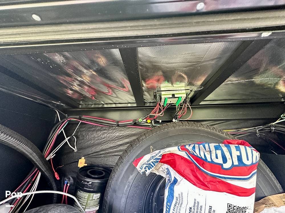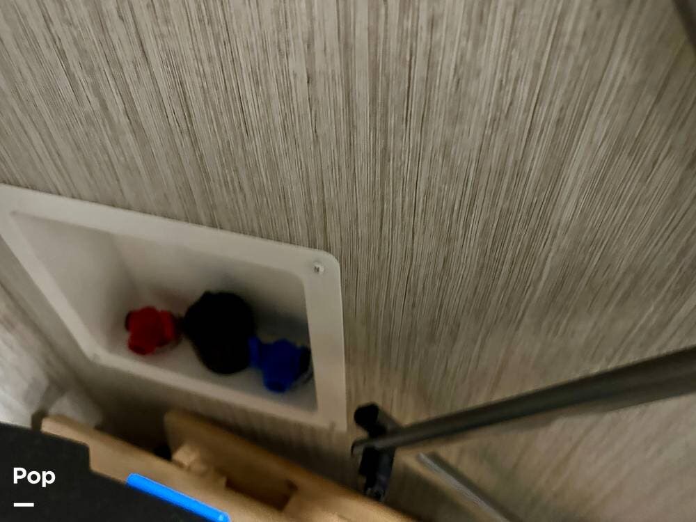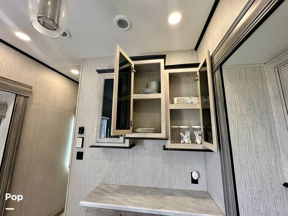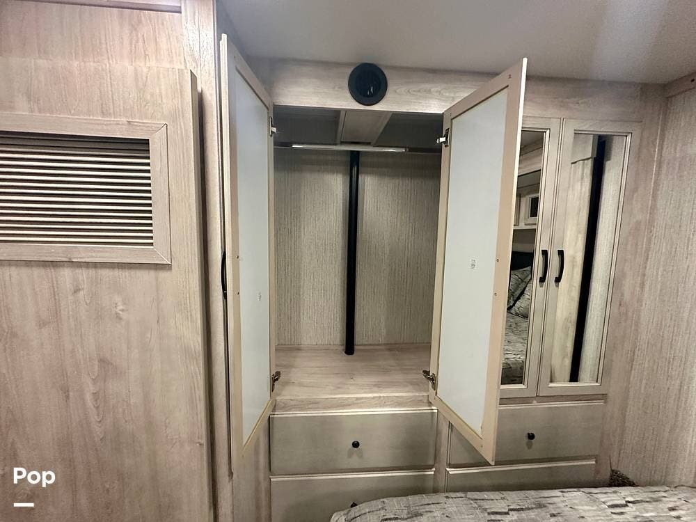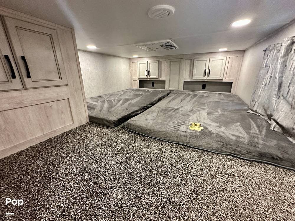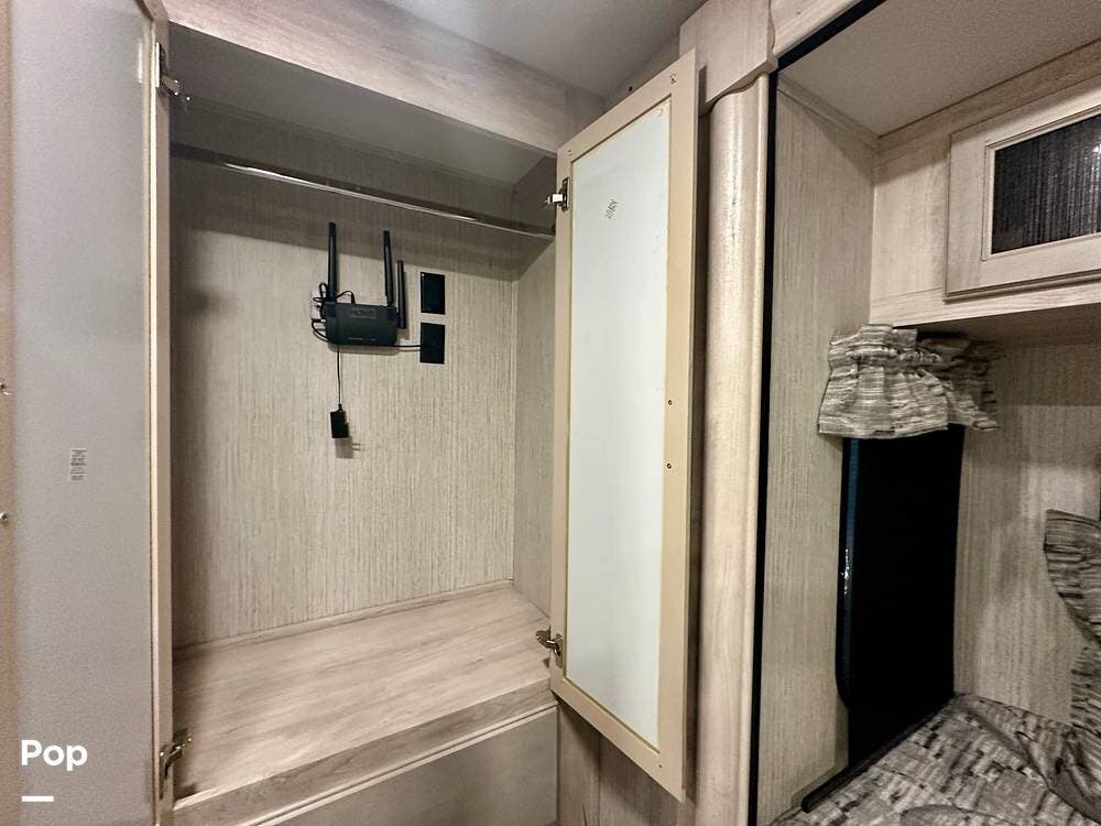 Up front, the elevated living area creates a true gathering space, with opposing seating, large panoramic windows, and an entertainment center anchored by a fireplace that adds both warmth and ambiance on cool evenings. It's a space designed for relaxing after a long day, whether that means watching a movie, enjoying a quiet morning coffee, or simply taking in the view from wherever you've decided to park. Nice loft area with two sides outside the primary bedroom. Televator TV over the fireplace hides away when not in use.