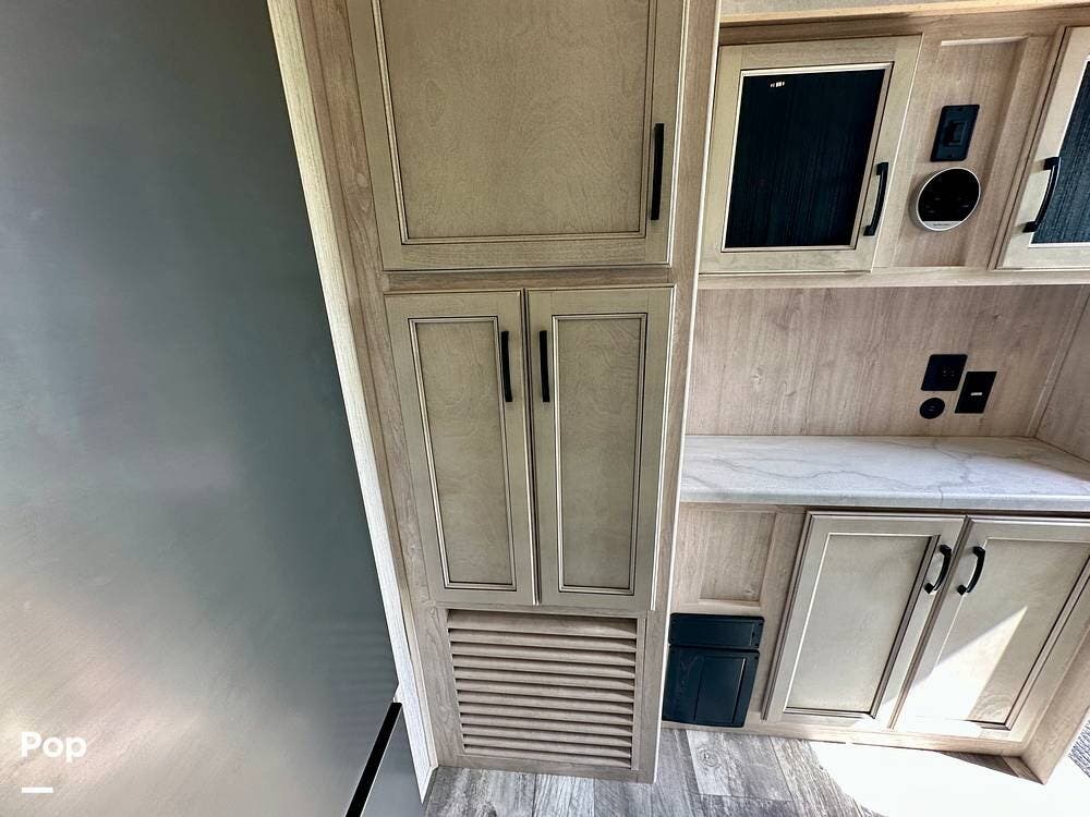 Moving into the heart of the coach, the kitchen feels less like an RV and more like a modern home. Solid-surface countertops, a large kitchen island, and a residential refrigerator with an ice maker make it easy to cook, host, and live comfortably. The pantry space and cabinetry provide more than enough storage for extended stays, making this unit ideal for full-time living or long seasonal trips.