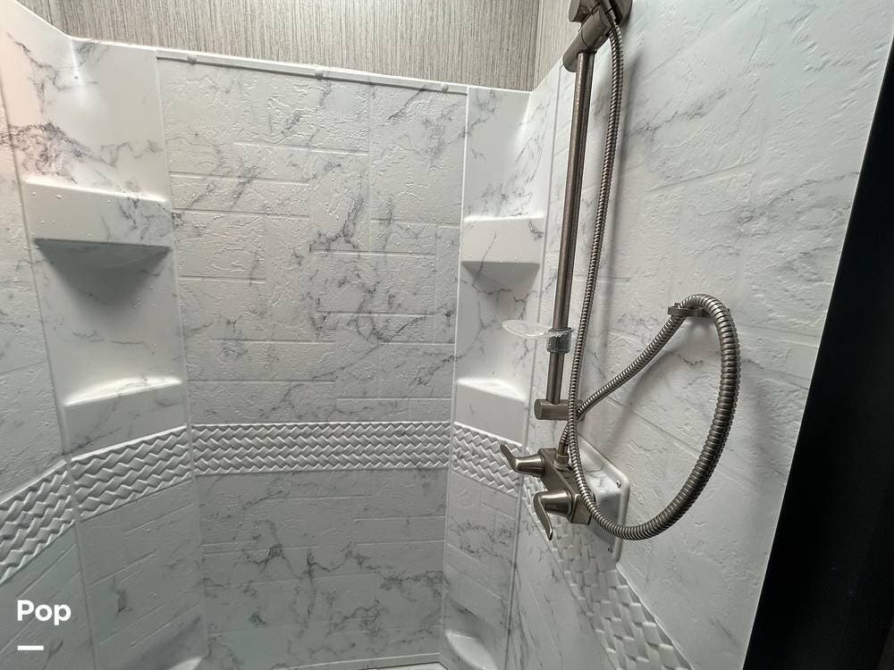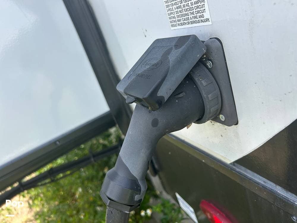 The outside has two ACs with a 50-amp power hookup. Two entrances with glass sliding doors. The 5 slides with slide toppers give you ample space inside. The awning is electric.