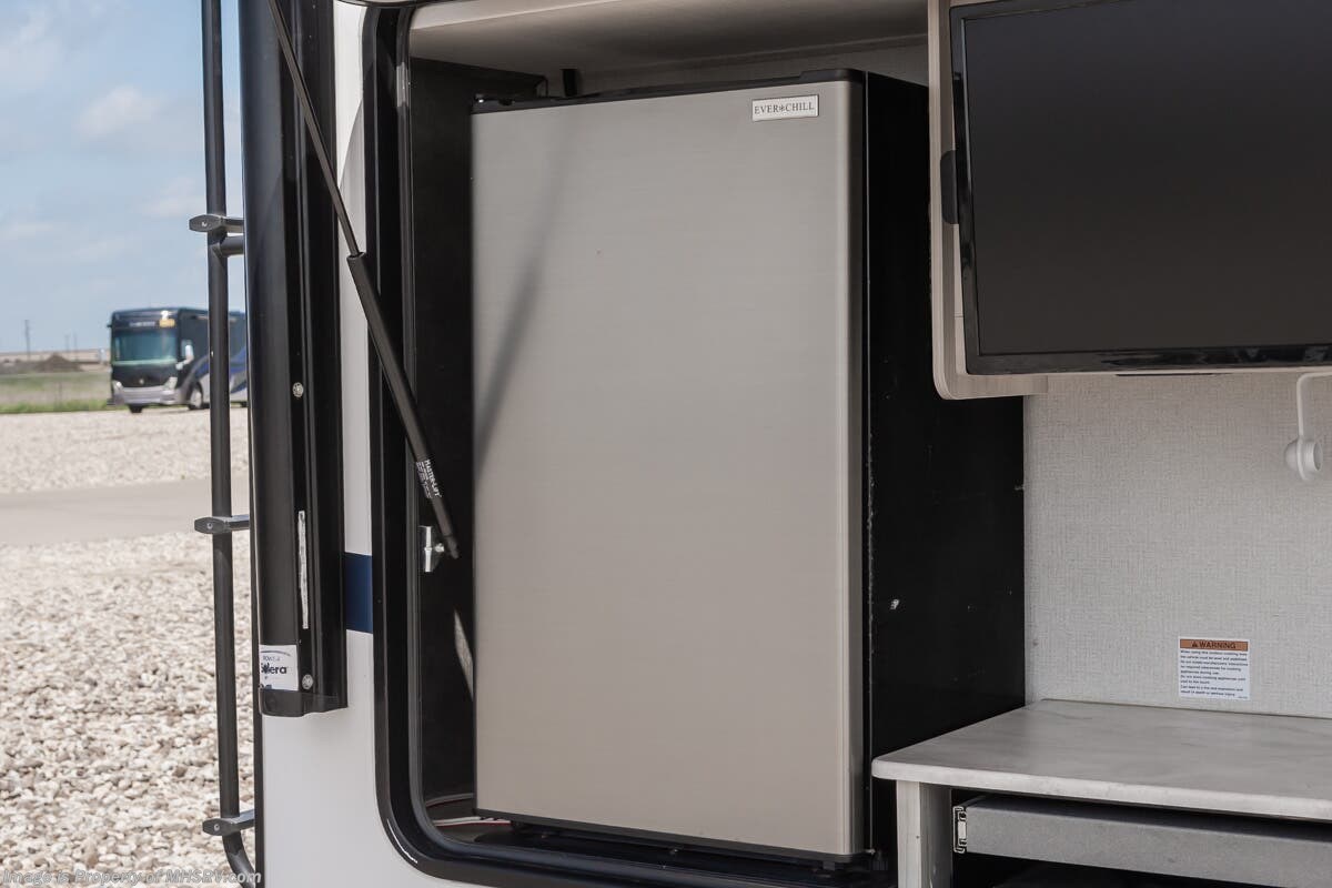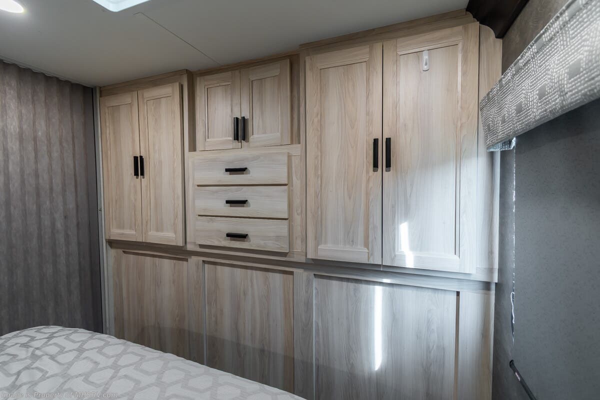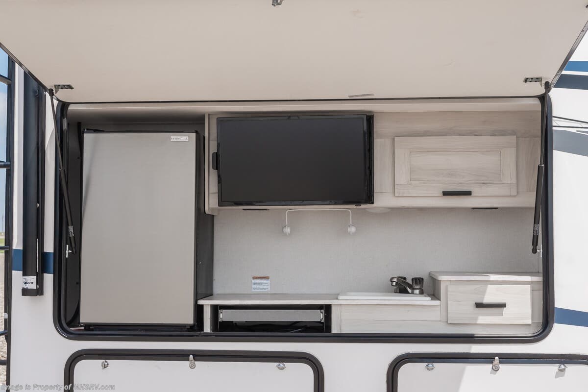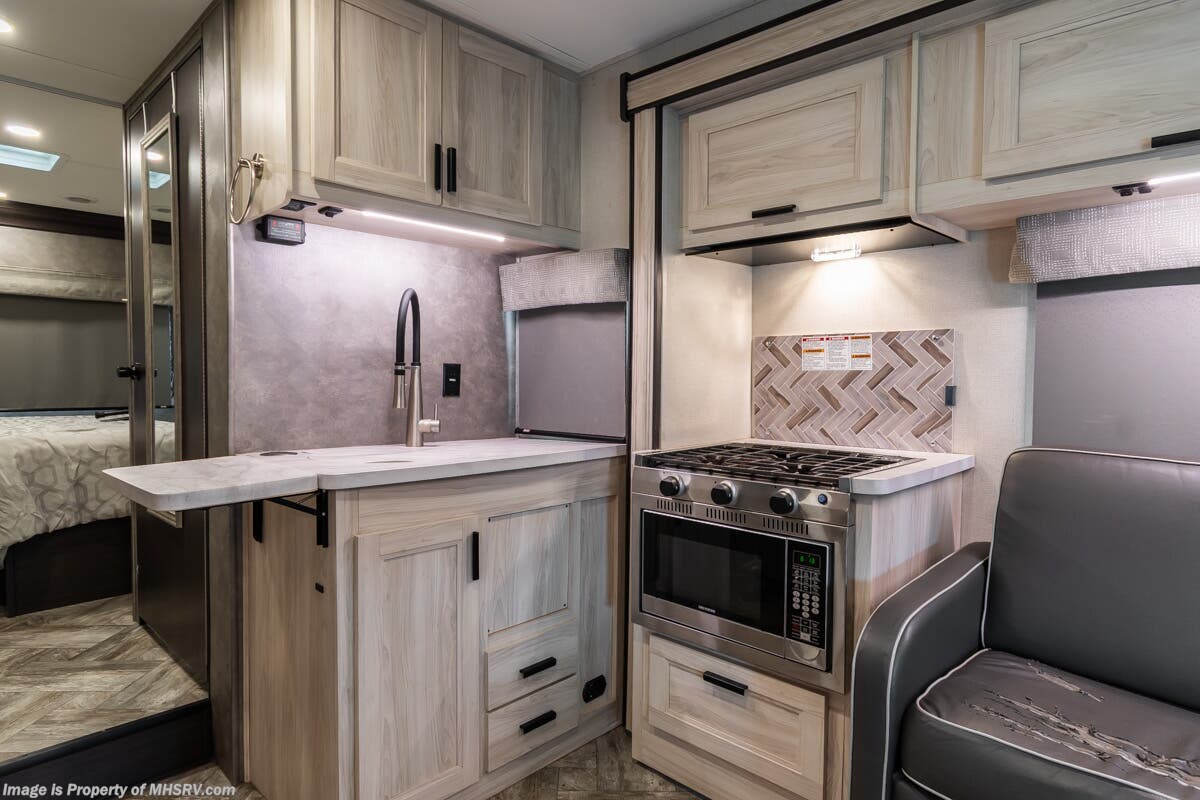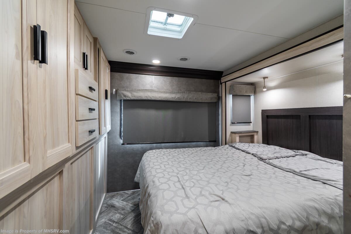More About This RV This RV features gas generator, Ford 7.3L gas engine, ford chassis, tire monitoring system, keyless entry, power windows, power door locks, cruise control, paito awning, pass through storage, LED running lights, black tank flush, exterior kitchen, exterior TV, fiberglass roof, ladder, solar, leather seating, 7 foot ceiling, convection microwave, 3 burner gas range, overhead loft, solid surface counter and much more