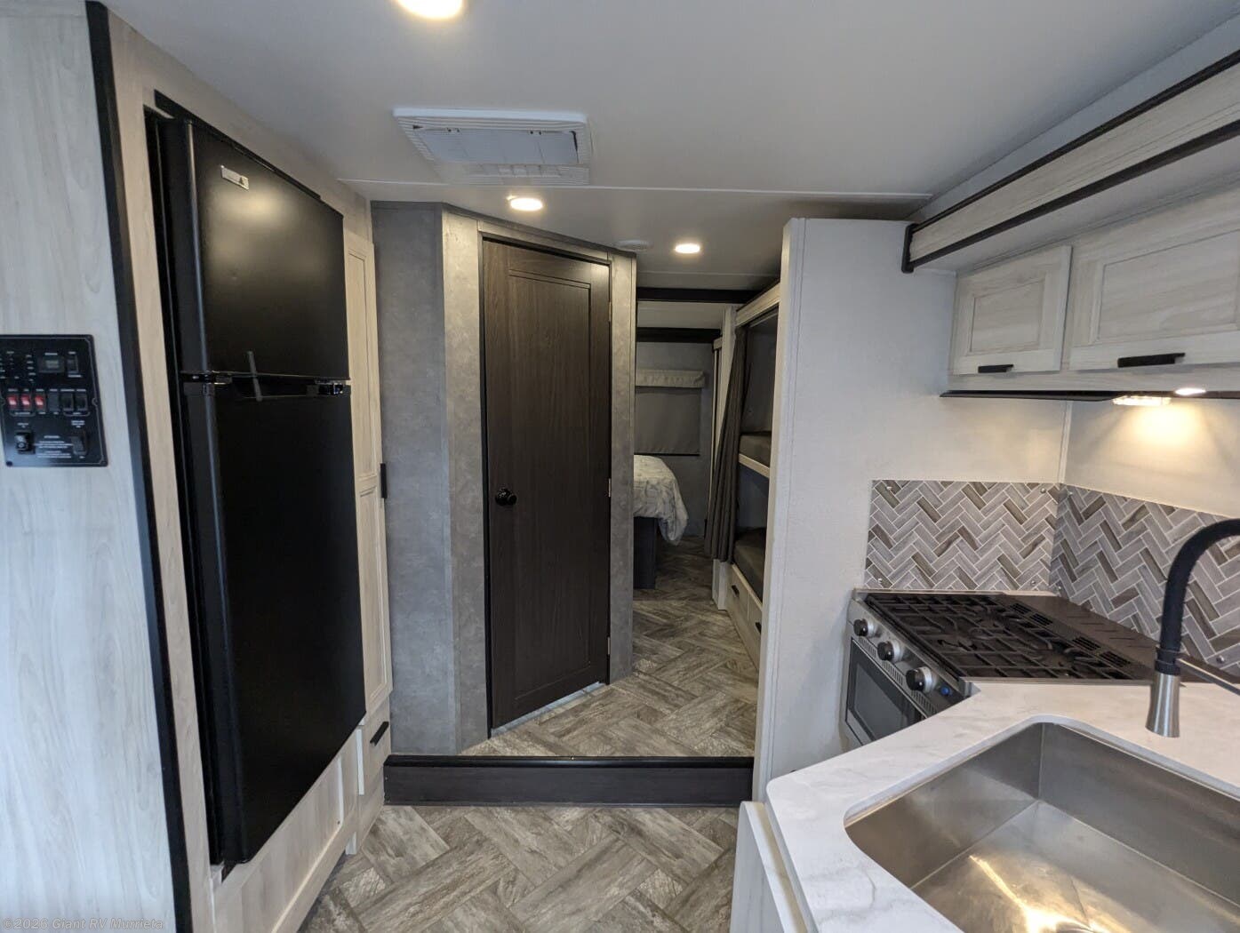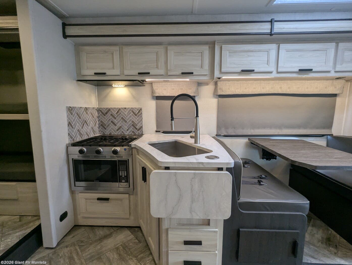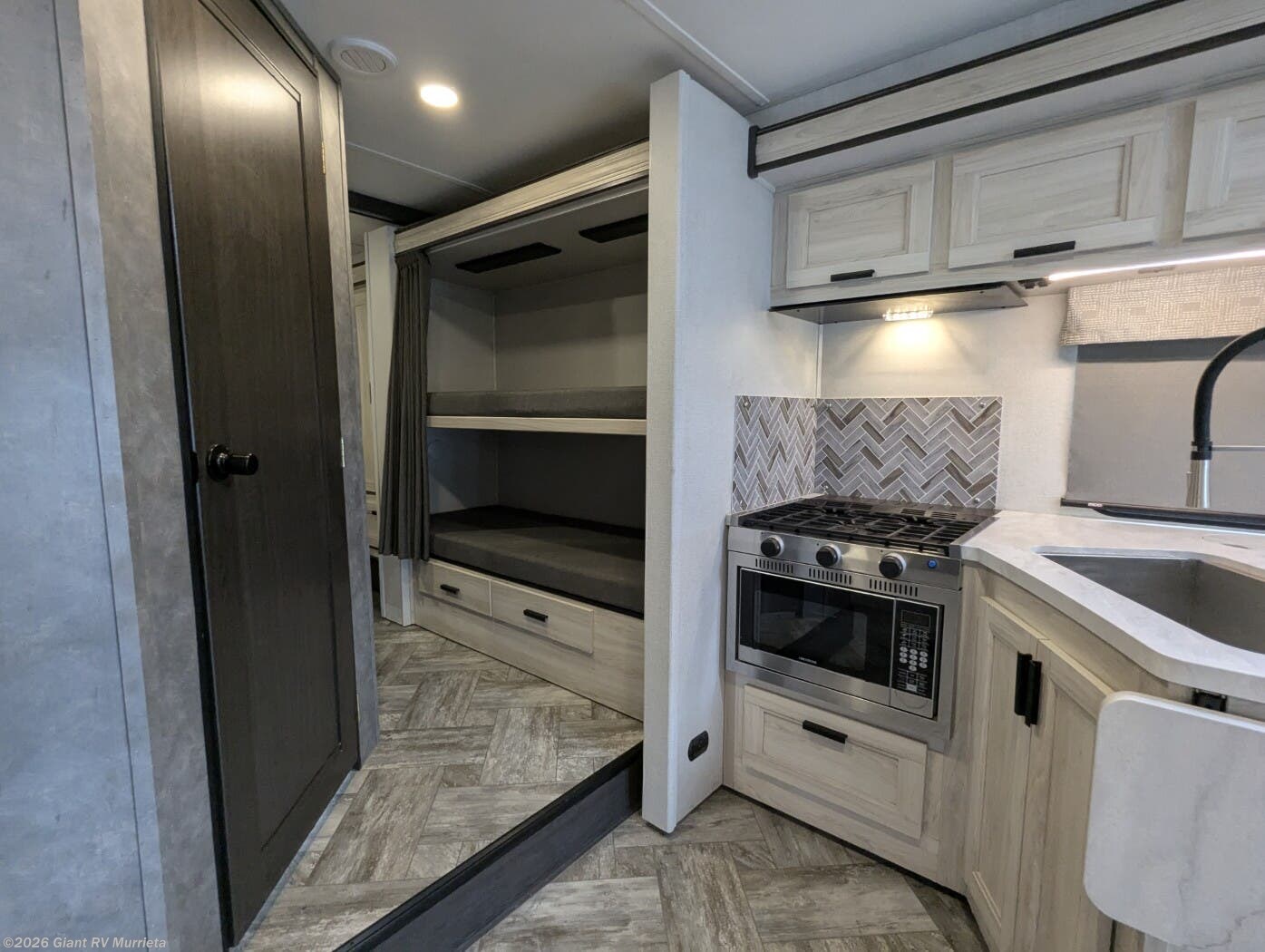 - Modern Kitchen: Equipped with a 10.7 cu. ft. 12V refrigerator, 1.3 cu. ft. convection microwave, and recessed 3-burner range for gourmet meals.