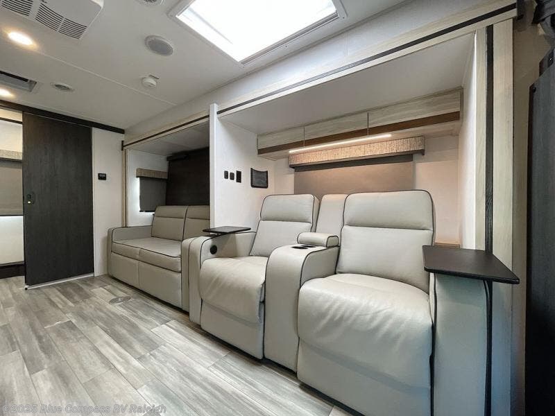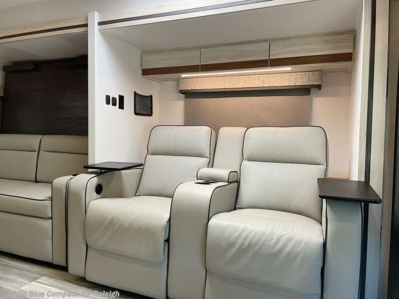 This versatile coach is perfect for the couple ready for adventure. The overhead bunk will allow one to two people tag along, or you can choose the optional Trekker cap to replace the overhead bunk. After you park for the day, relax on the power theater seat with a good book, or enjoy a meal on the sofa with a removable table. And the queen Murphy bed can be folded down when you're ready for bed. You will find drawers with hidden storage behind the TV for your valuables, plus plenty of overhead compartments. This model also features a spacious full rear bath, allowing you to stay clean throughout your whole trip!