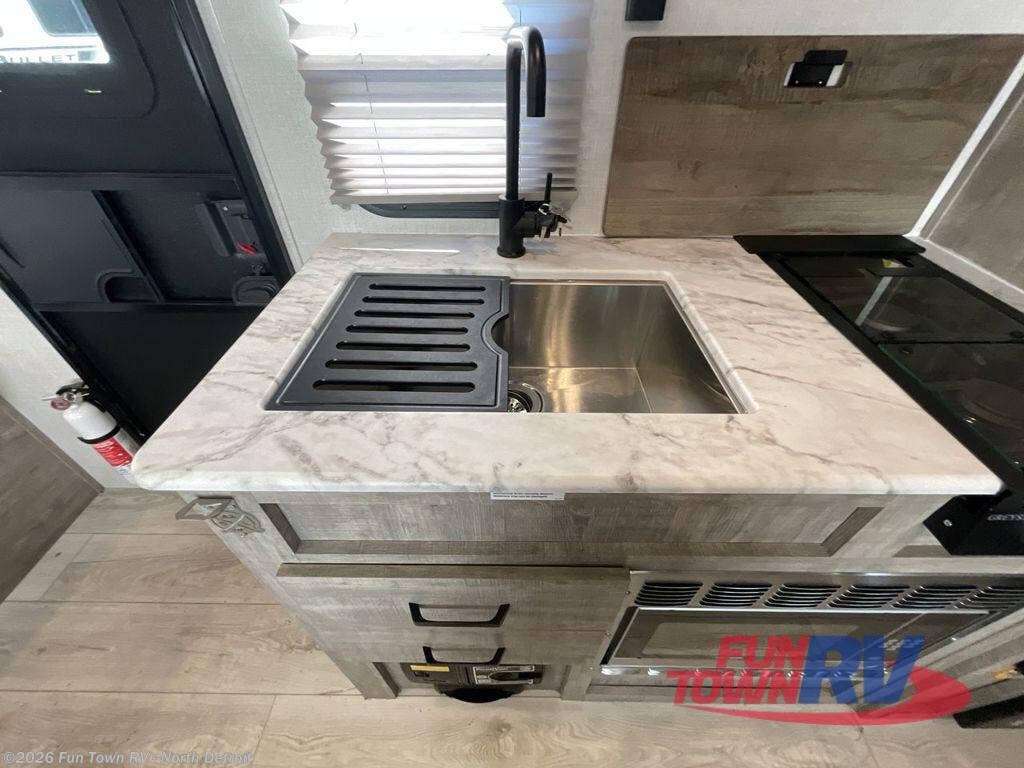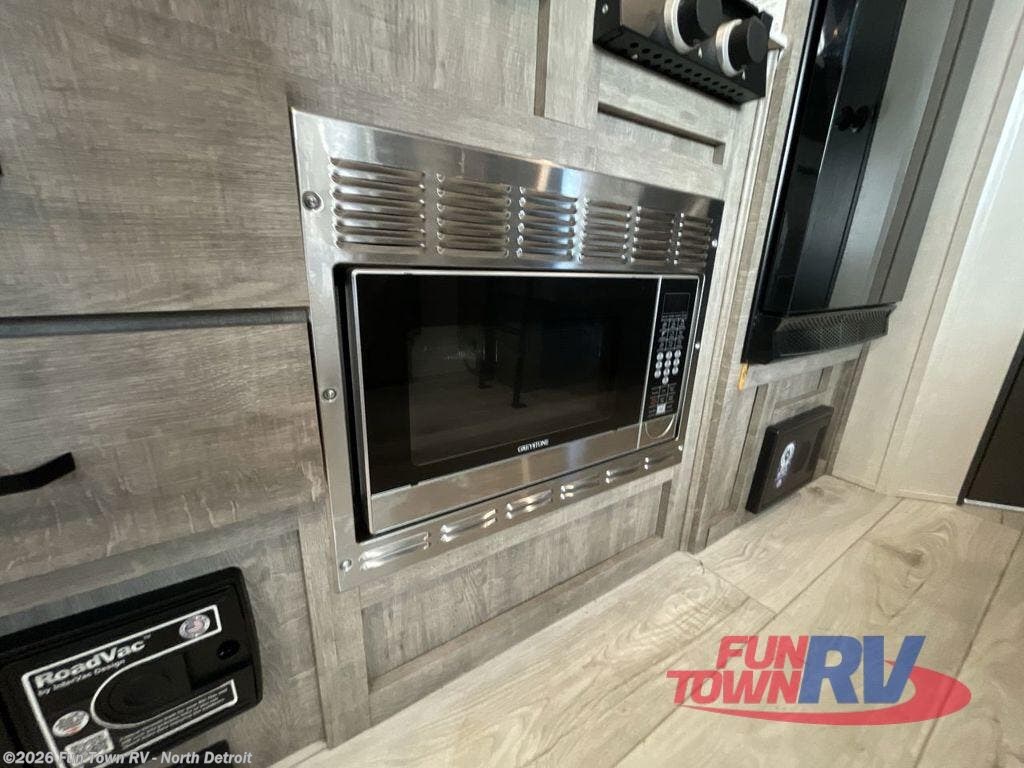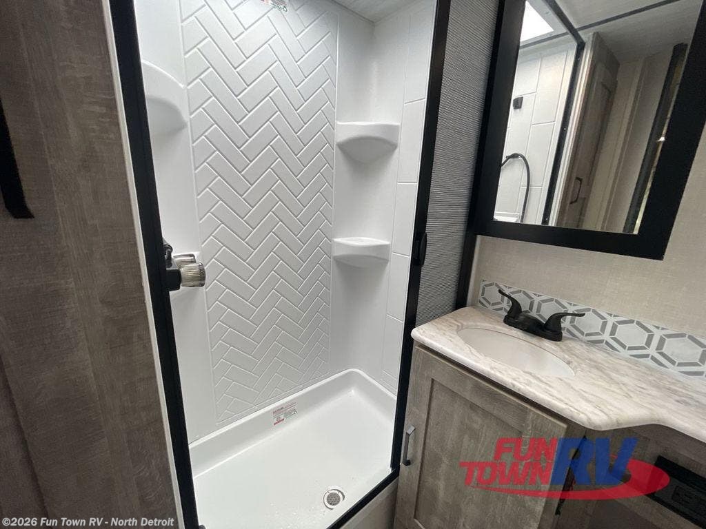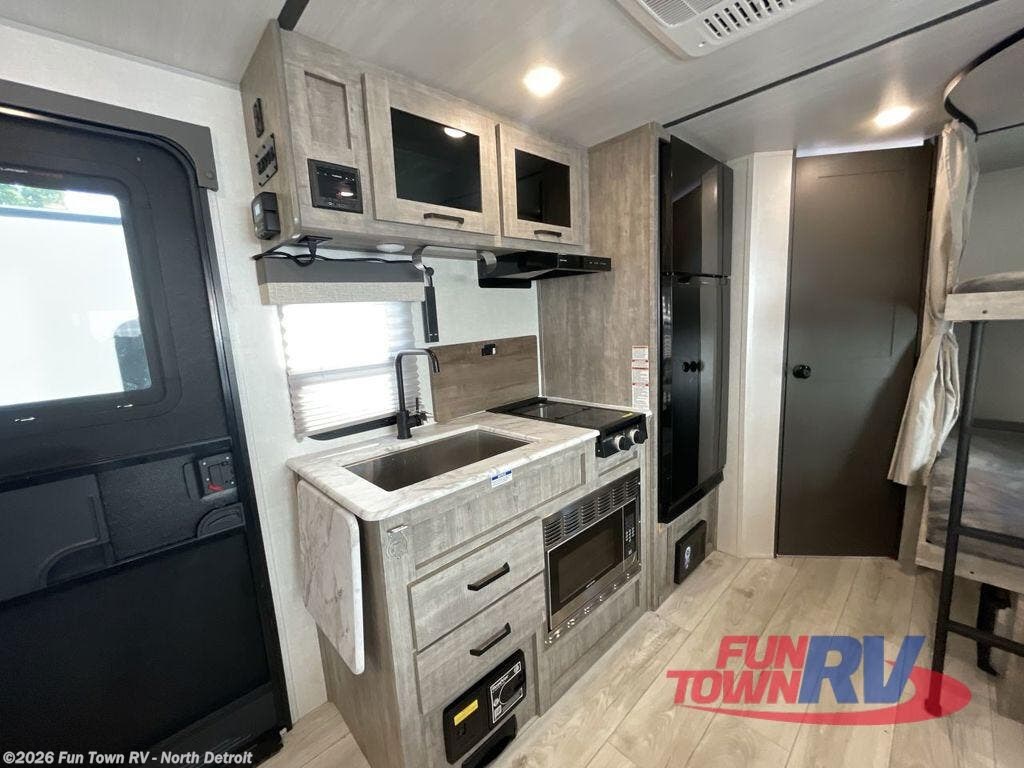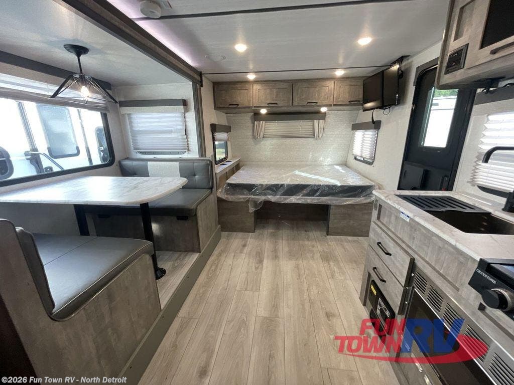Bring along family or friends in this travel trailer that can sleep up to six people each night. The dinette slide will provide the chef space to cook on the two burner cooktop, or they may just head outdoors to cook on the outside kitchen. There is also an outdoor shelf here and a spray port for your convenience. The true queen-size bed up front is sure to provide a great night's rest, plus there is a "Stargazer" front window that will allow natural light in and beautiful starry nights.