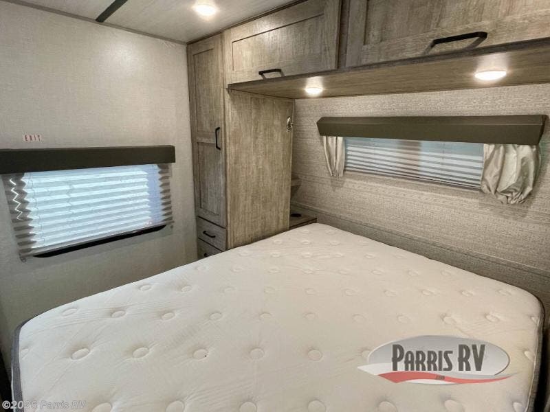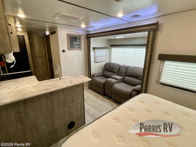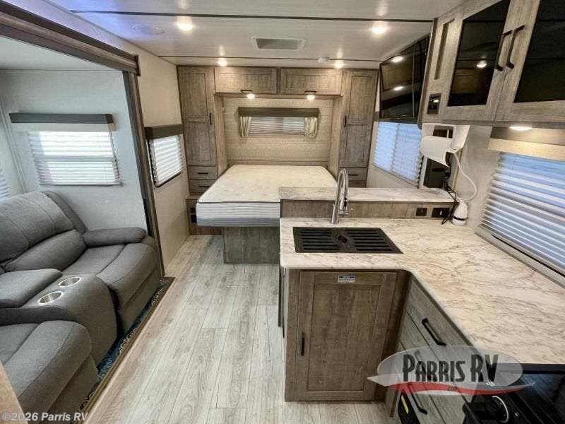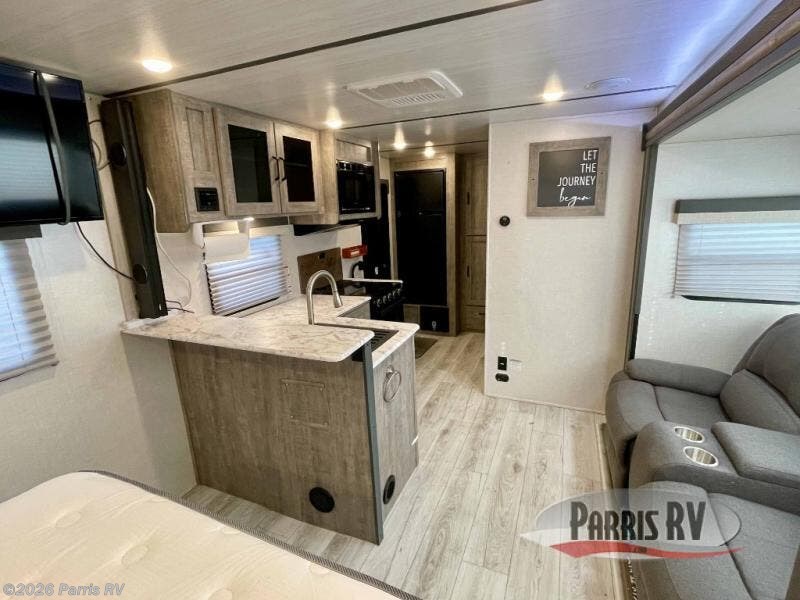 You're going to love every minute spent in this 25' travel trailer! The counter with stools will be the perfect place to enjoy your morning coffee at, plus there is a dinette slide for more seating space. You will get a great night's rest on the queen bed in the front bedroom, and the two wardrobes allow you to keep your clothes tidy. Further customize this trailer by adding the theater seating option or tri-fold sofa option in place of the dinette, and you'll enjoy the standard HD LED TV for late-night movies!