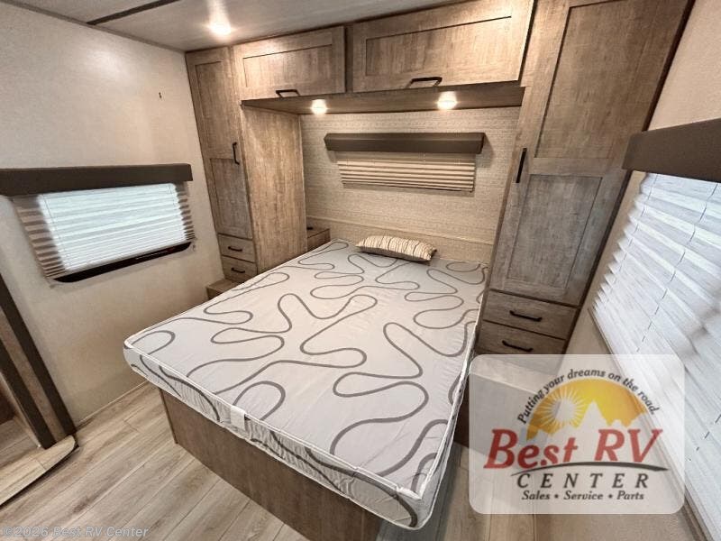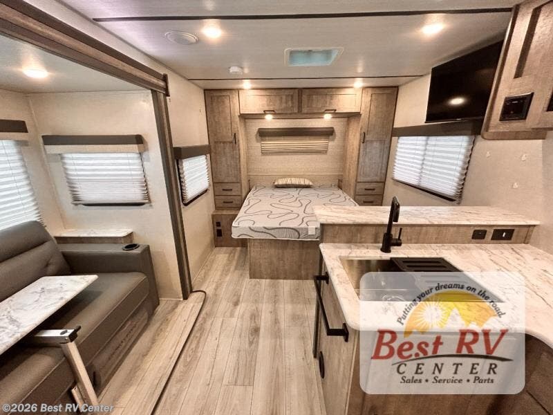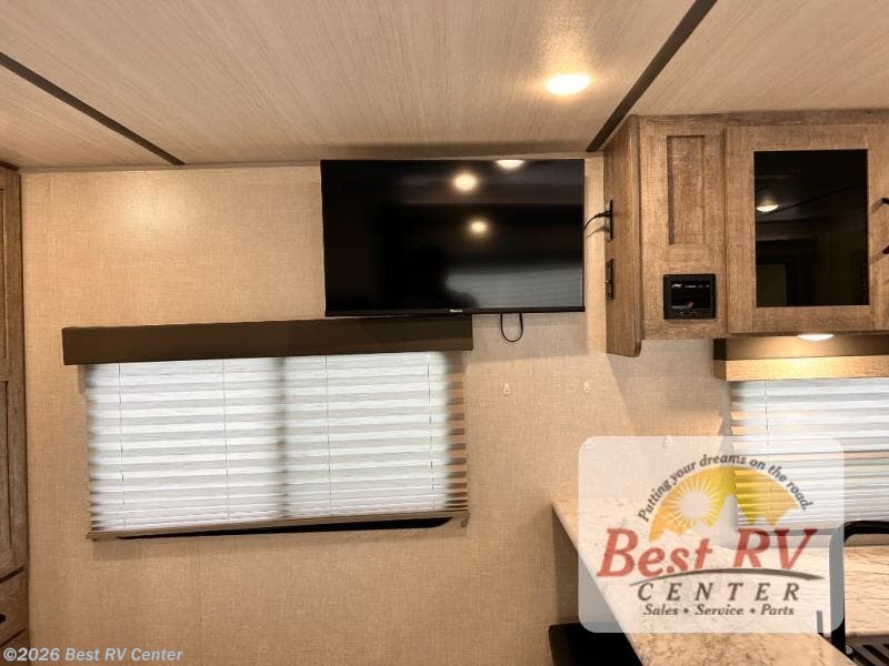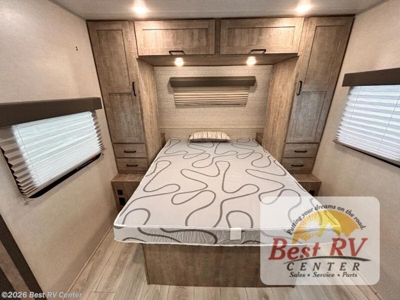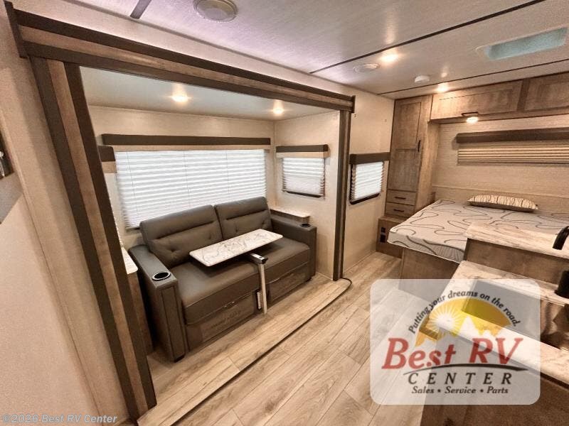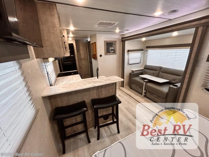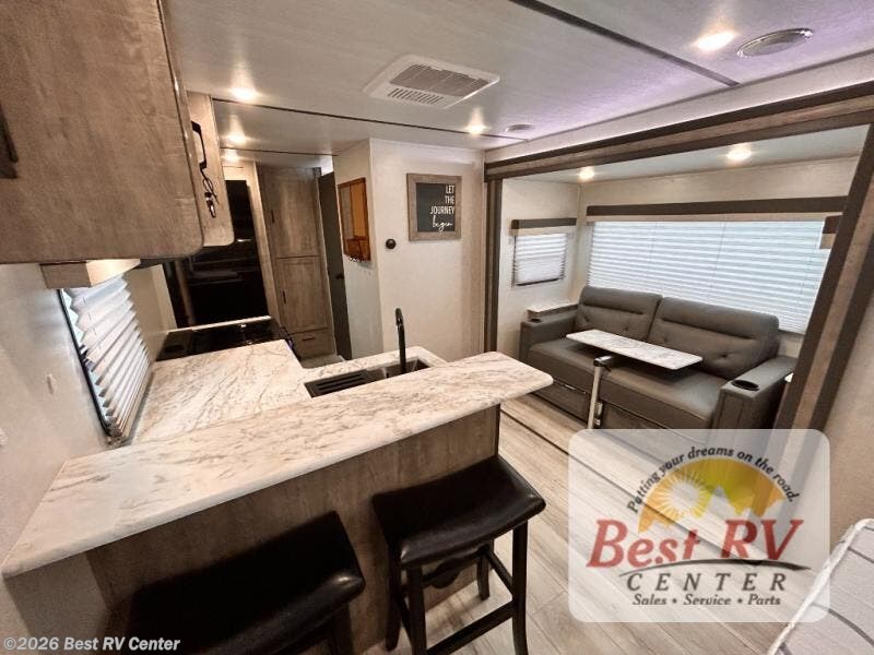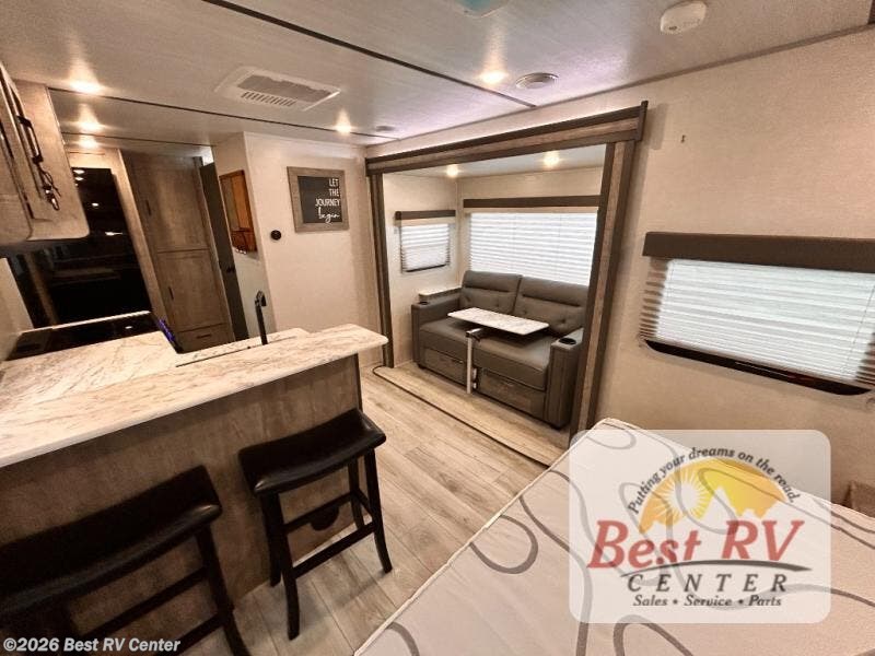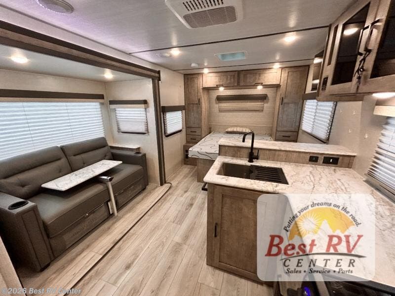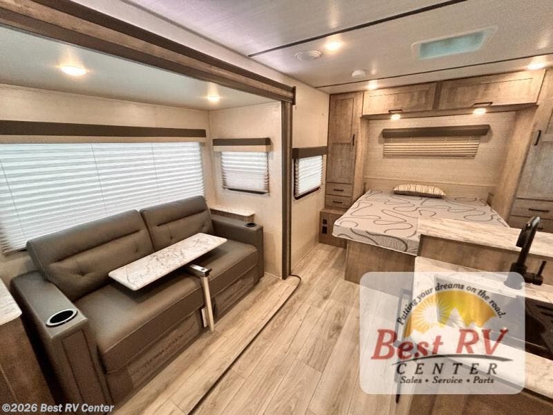 You're going to love every minute spent in this 25' travel trailer! The counter with stools will be the perfect place to enjoy your morning coffee at, plus there is a dinette slide for more seating space. You will get a great night's rest on the queen bed in the front bedroom, and the two wardrobes allow you to keep your clothes tidy. Further customize this trailer by adding the theater seating option or tri-fold sofa option in place of the dinette, and you'll enjoy the standard HD LED TV for late-night movies!