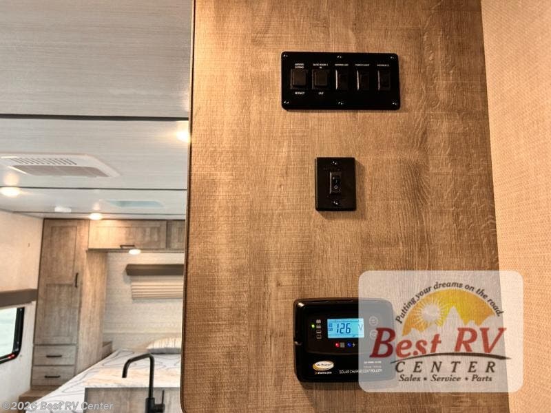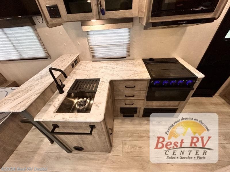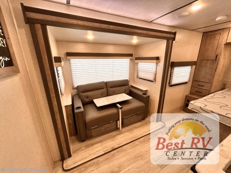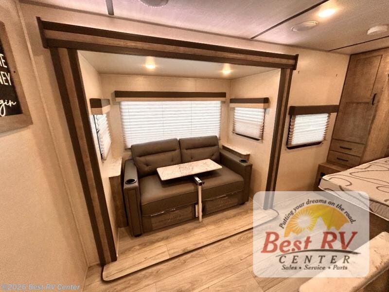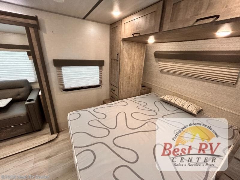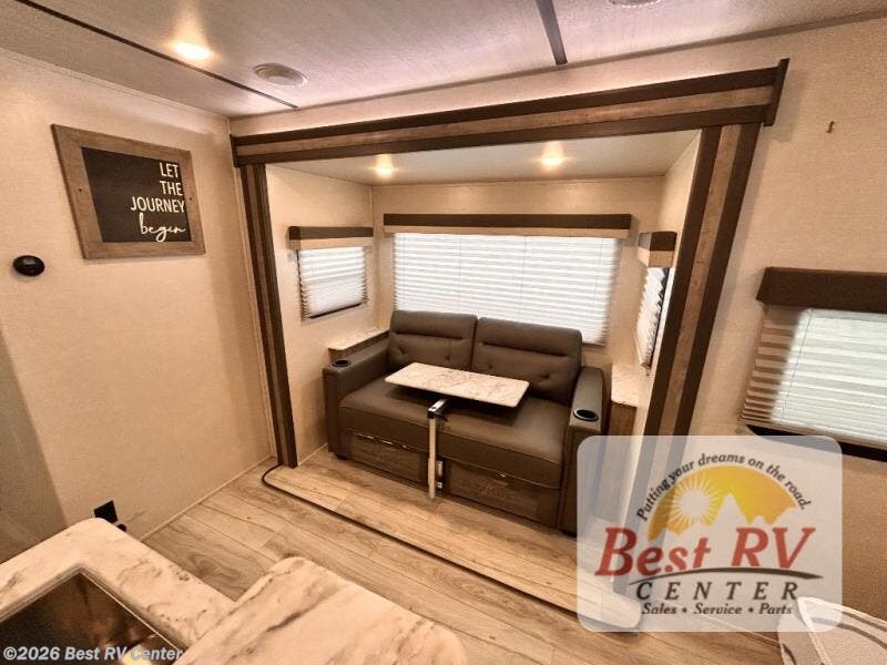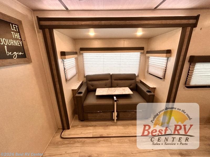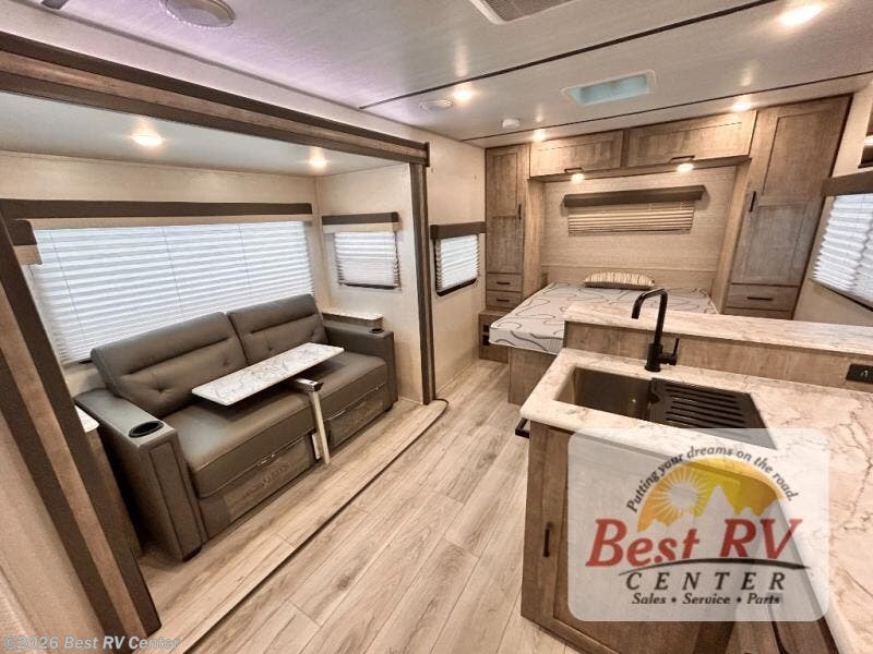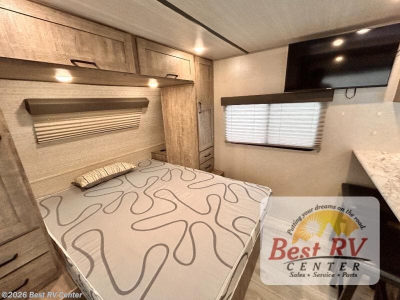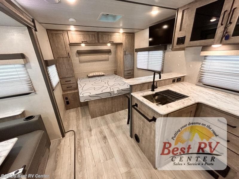 You're going to love every minute spent in this 25' travel trailer! The counter with stools will be the perfect place to enjoy your morning coffee at, plus there is a dinette slide for more seating space. You will get a great night's rest on the queen bed in the front bedroom, and the two wardrobes allow you to keep your clothes tidy. Further customize this trailer by adding the theater seating option or tri-fold sofa option in place of the dinette, and you'll enjoy the standard HD LED TV for late-night movies!