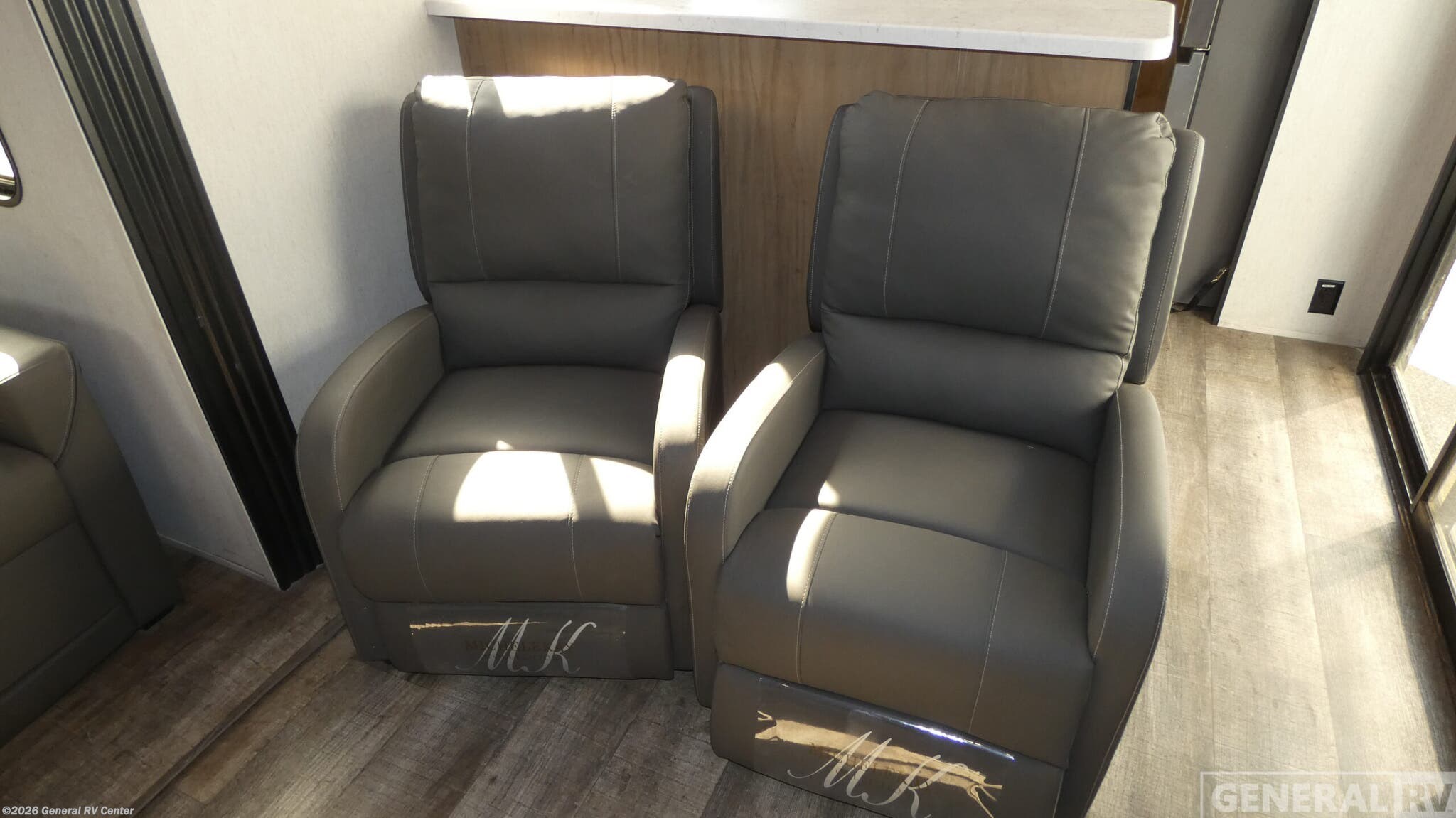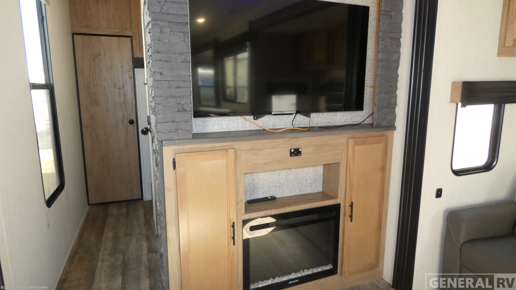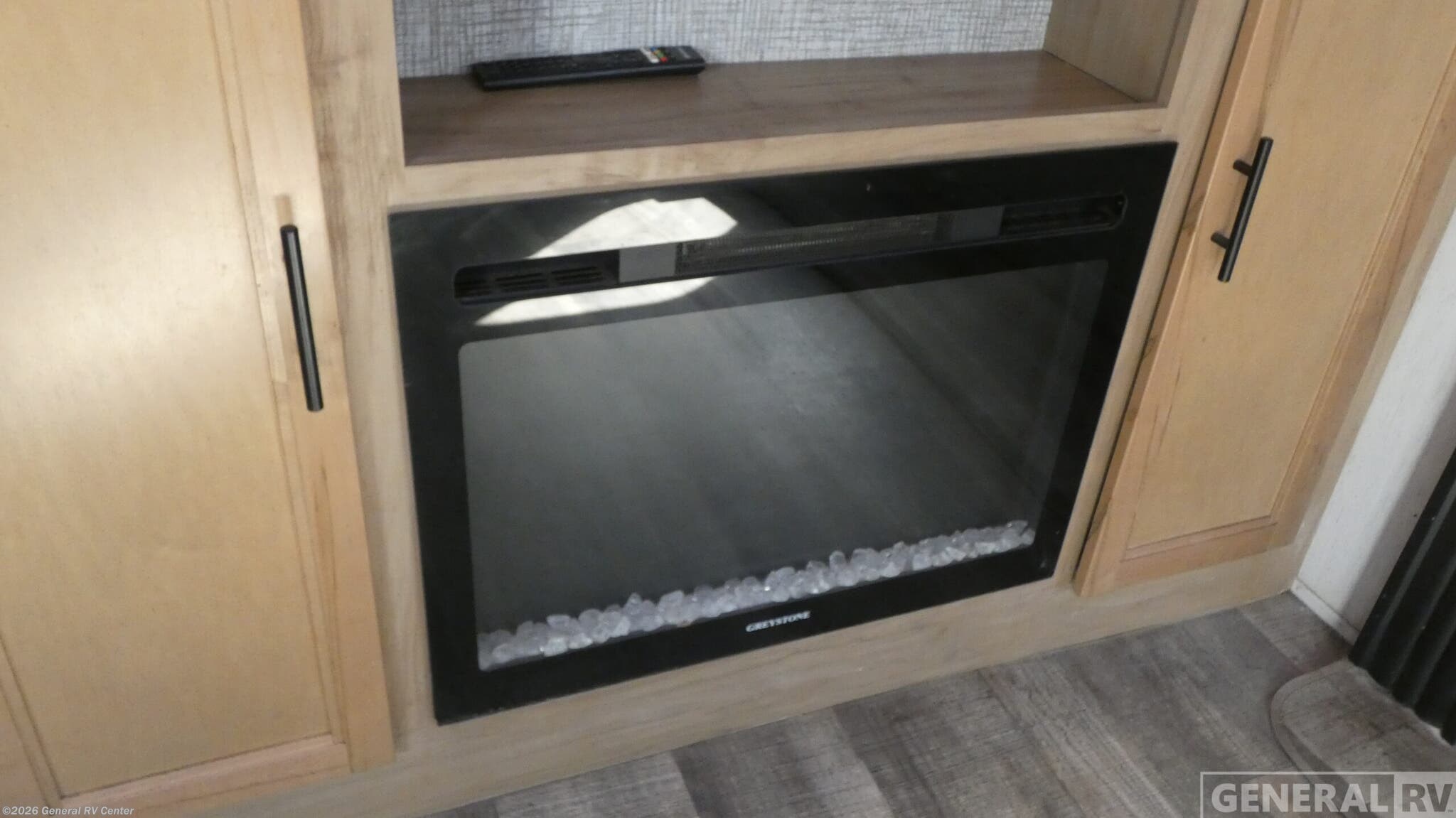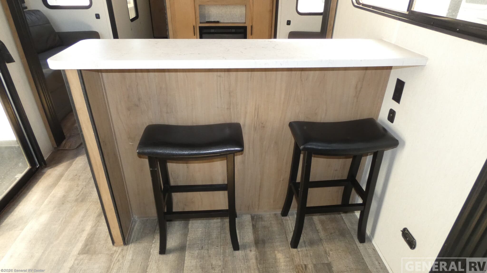 Forest River Timberwolf destination trailer 39SR highlights: Front Kitchen Opposing Sofa Slides Two Lounge Chairs Bar Top with Stools Loft with Stairs Rear Private Bedroom This Timberwolf destination trailer is very residential, and it includes almost everything your home offers you! You'll be able to get in and out easily with the two entry doors, and the front entry door leads into the large front kitchen. This kitchen is perfect for any chef because it has an 18-cubic foot refrigerator, two pantries, a microwave, range with oven, and residential farm-style sink. The free-standing dinette with chairs is also included in this space for socializing while cooking, but it won't be in your way while you cook because it sits within a slide out. There is more space to sit and enjoy a meal at the bar top with stools, and if you just want to eat while you watch the entertainment center, you can sit in one of the two lounge chairs or on one of the two sofas. If you want to warm it up and create a bit of ambiance, add the optional fireplace for a cozy evening. You're going to want to take a closer look at the Forest River Timberwolf destination trailer! These trailers have a backup camera system which will be extremely helpful as you maneuver these large units into the right spot. Some of the construction features include a seamless roofing membrane with heat reflectivity, a premium wheel package, power gear frame technology with space-saver rail design, and an armored underbelly tank enclosure. Use the USB charging stations to keep your phones ready to go, and stay in control of your trailer's electrical functions with the total control app and remote control system.