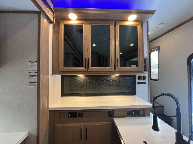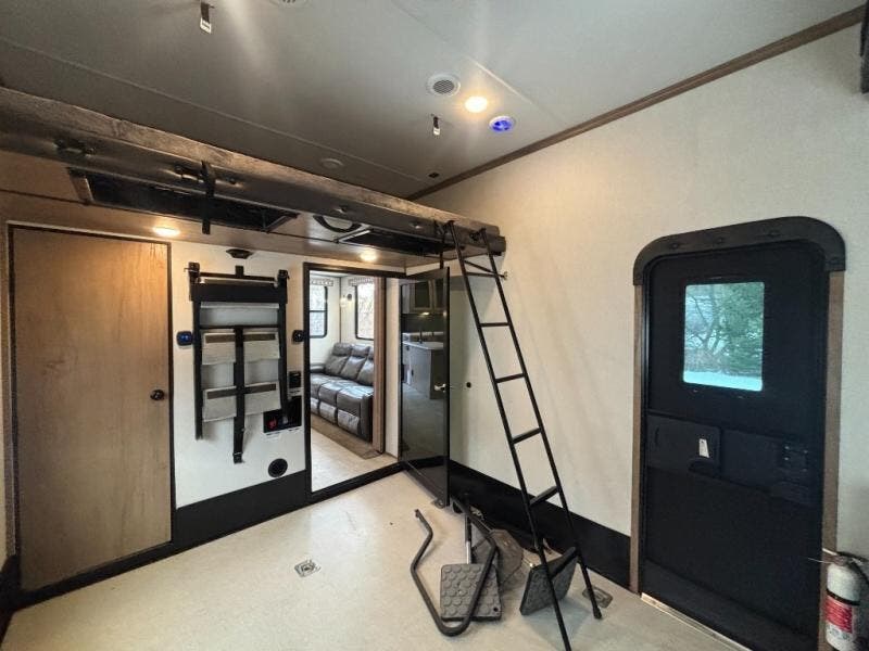 The 15' 6" garage area of this fifth wheel toy hauler has enough space for you to bring along your favorite off-road toys! The garage area also has opposing flip-up sofas with a table in between and a raised queen bed above, plus a loft, a half bathroom, and an area prepped for an optional washer and dryer. There is plenty of walking around space in the central combined living/kitchen area thanks to the large slide out sofa with recliners, as well as the refrigerator and three burner cooktop slide. The front dual entry bathroom has a radius shower for you to freshen up in each morning and an entrance into a private bedroom with king bed and lots of storage!