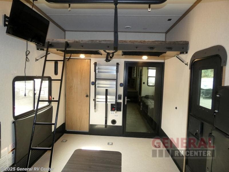 Everyone will stay clean with a bath and a half in this fifth wheel toy hauler! The front private bedroom has a 72" x 80" king bed slide to lay your head on at night, a front wall wardrobe, and a dresser to keep your clothes looking nice, plus an entrance into the bathroom. The kitchen has plenty of countertop space to prepare your meals, and a refrigerator to store any leftovers. The garage area has a loft, opposing flip-up sofas with a table in between and a raised queen bed above them, as well as a second entry door and an area prepped to add a washer and dryer!
