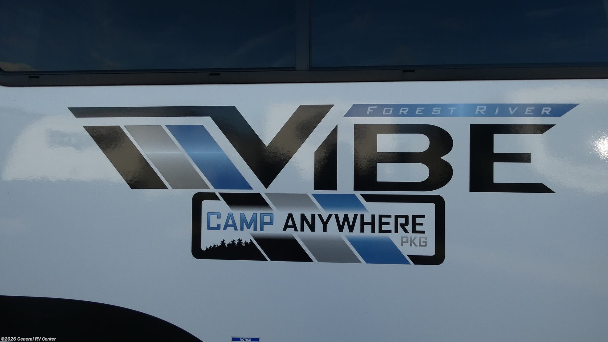 Escape to the Great Outdoors in this Vibe travel trailer. Once you arrive at your campsite, set up the 18' electric awning with LED lights, then grab the fishing poles from the large pass-through storage. You may want to make a quick lunch on the universal outside kitchen before heading out. If the weather isn't cooperating, you can cook on the three burner cooktop or in stainless steel 17' oven, and there is even a residential refrigerator to hold all your ingredients. The spacious full bath includes a 36" x 30" walk-in shower to clean up every day, and there is a linen closet to store clean towels and necessities. Each Vibe travel trailer by Forest River includes Hyper Lyte construction and a durable laminated "Aluma Frame" for years of use. The heated and enclosed underbelly allows you to extend your camping season, and the LED-lit exterior speakers will keep the party going as you grill outdoors and visit with family. Inside, you'll find LED lights to keep everything bright and open, a Bluetooth stereo, roller shades for your privacy, and many more amenities per region. These models also include cable and satellite prep and a digital TV antenna with a booster so you can stay connected to the outside world if you choose. Make the easy choice and choose a Vibe travel trailer today!