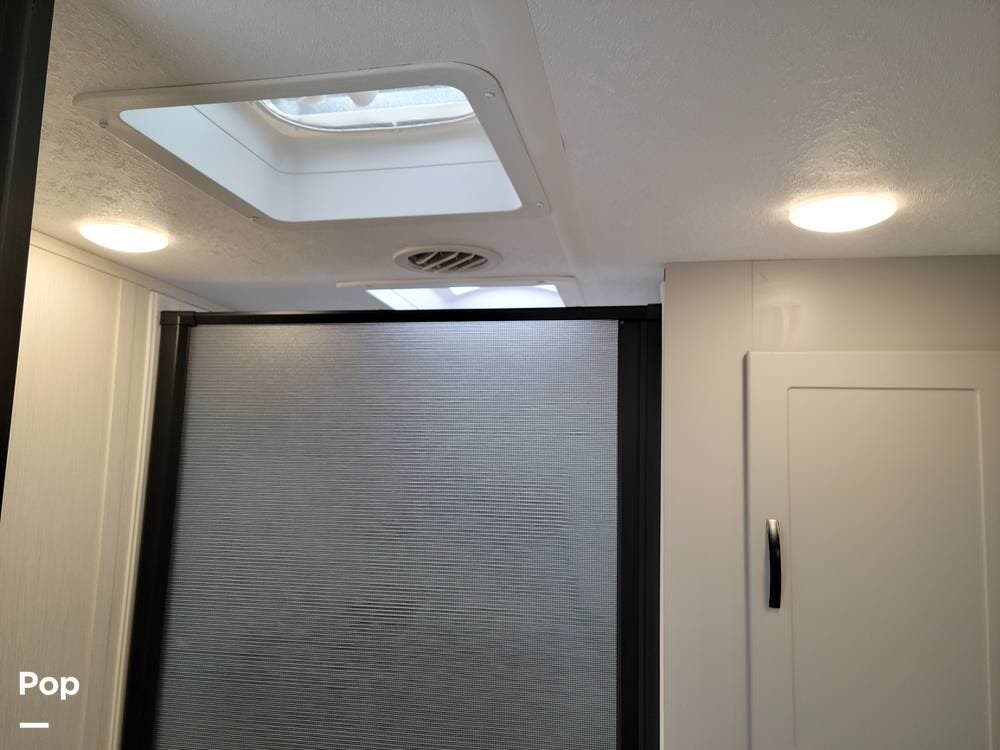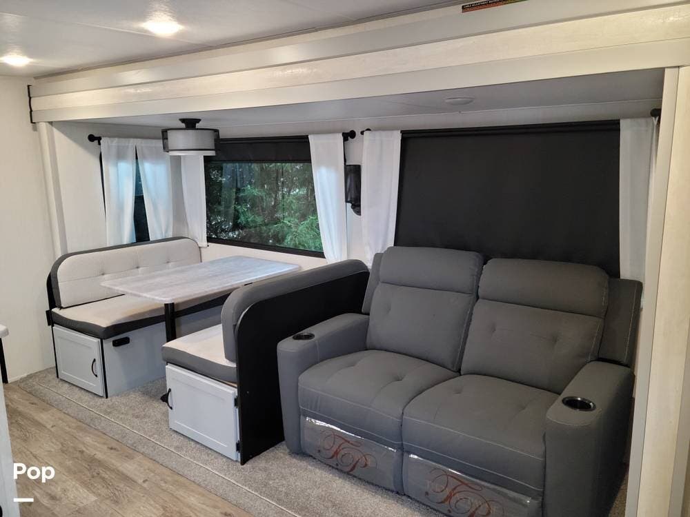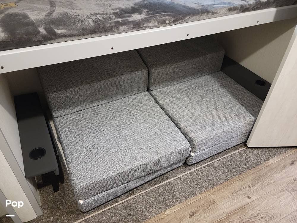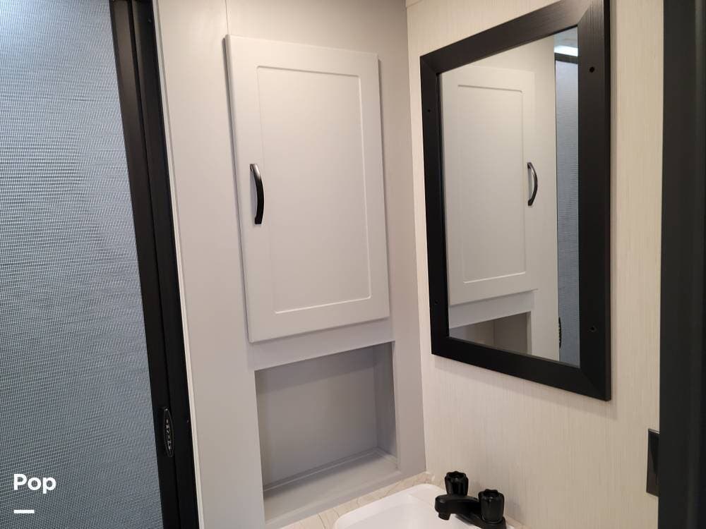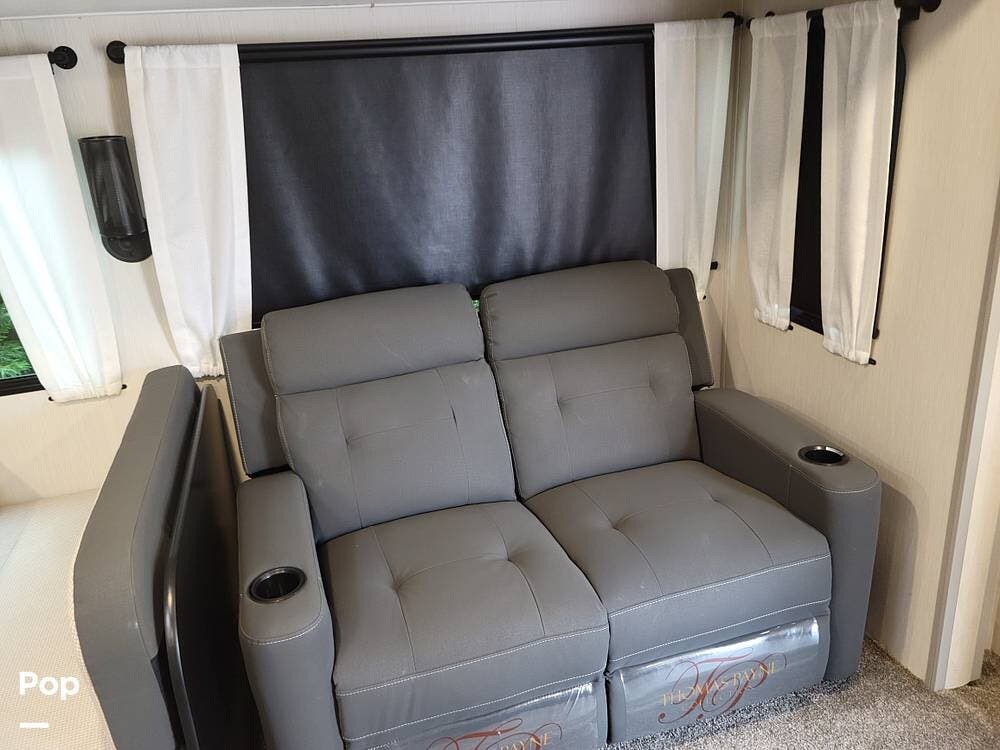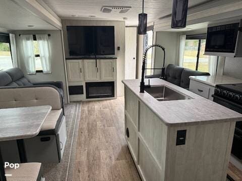 This 39-footer features a bunkhouse with a separate, private sleeping area for the kids or guests, while the bedroom suite offers a cozy retreat. Large windows throughout the RV let in plenty of natural light.