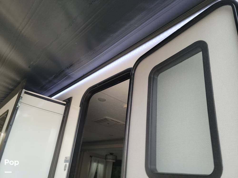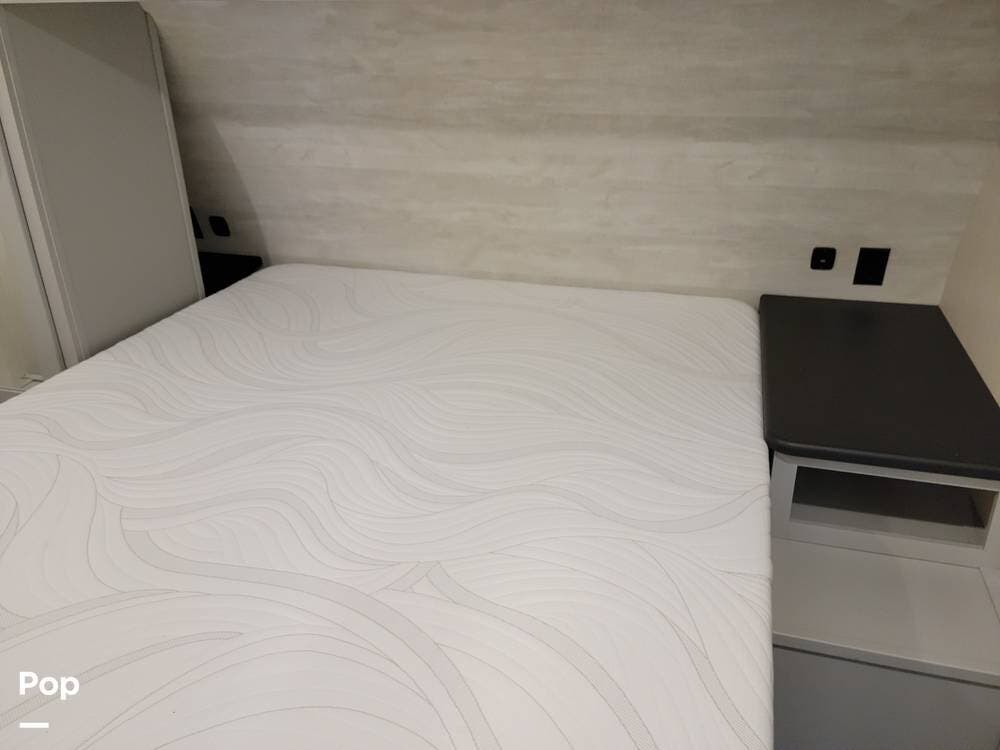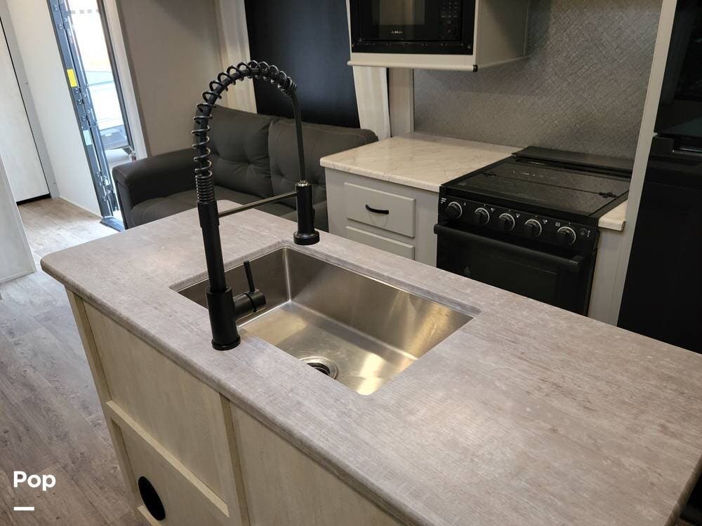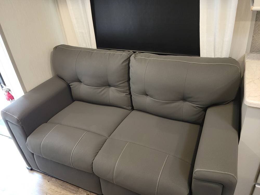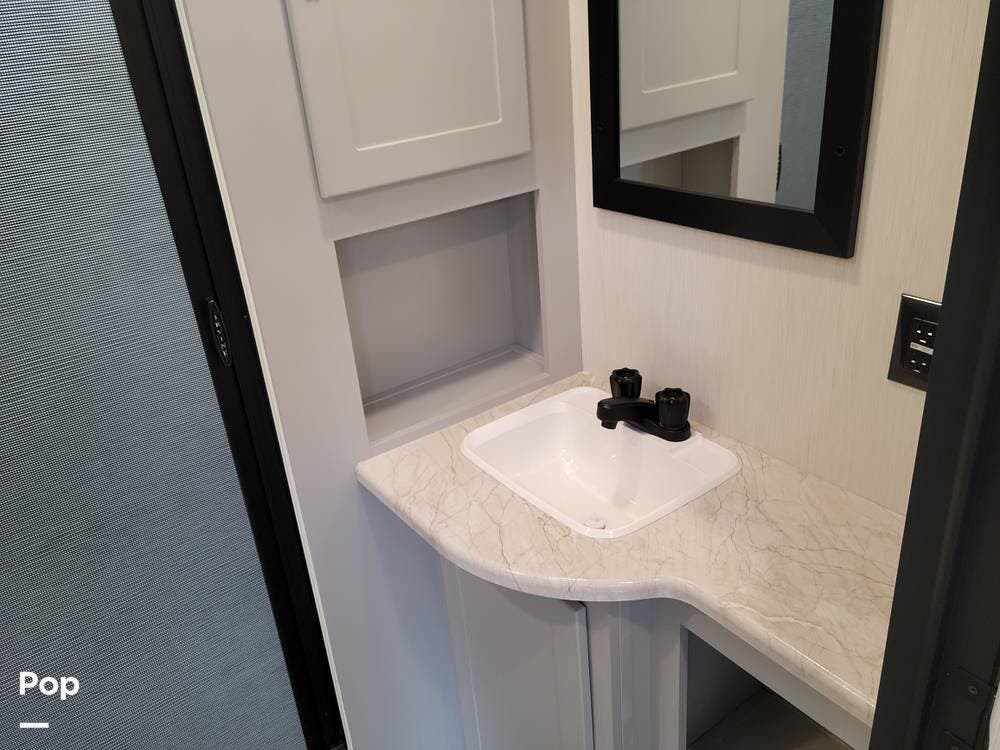 This 39-footer features a bunkhouse with a separate, private sleeping area for the kids or guests, while the bedroom suite offers a cozy retreat. Large windows throughout the RV let in plenty of natural light.