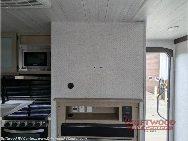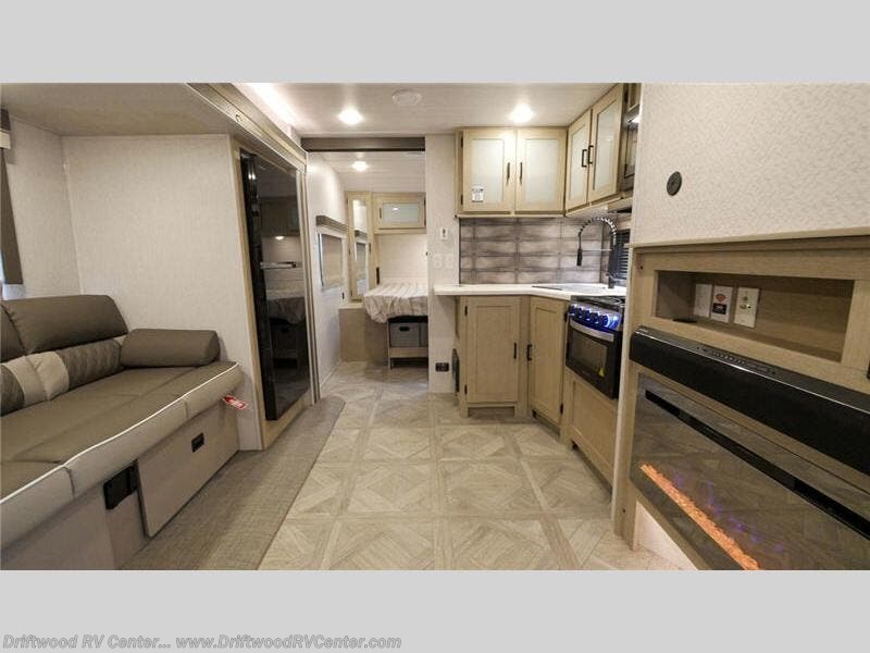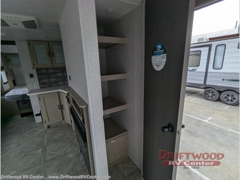 As you escape to the beautiful countryside, or embark across the country to visit family, you'll find that the modern amenities found in this Wildwood travel trailer will deliver the ultimate enjoyment all along the way! Relax on an 8' chaise lounge that includes a table in front so that you can enjoy your morning coffee. When you are ready to face the day ahead, you can grab a towel from the linen closet in the rear bathroom and enjoy the walk-in shower before heading out for a day full of adventure. At night, a custom king bed for a great night's rest. You will appreciate the pass-through storage, entertainment center with fireplace, and walk-in pantry for all the goodies!
