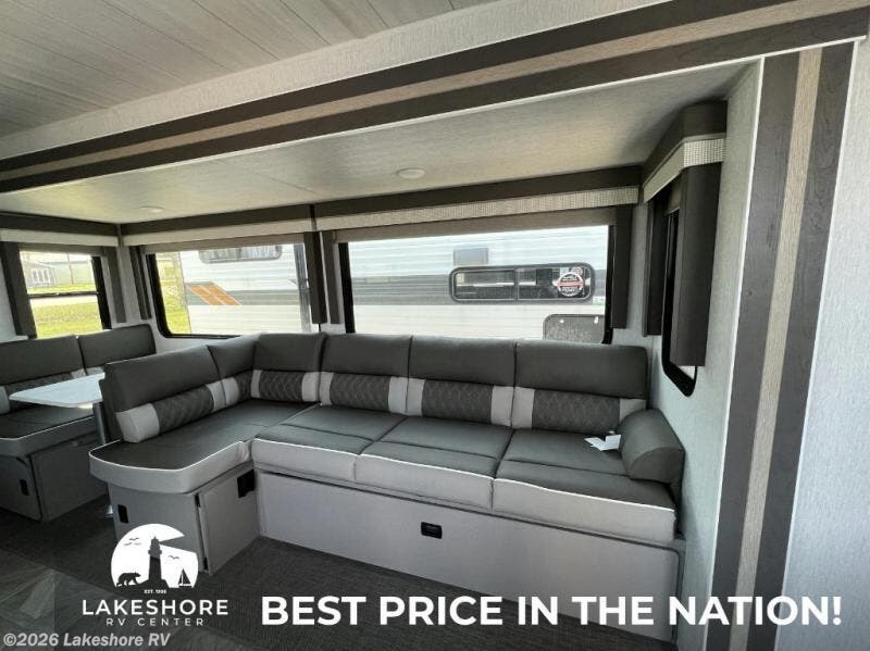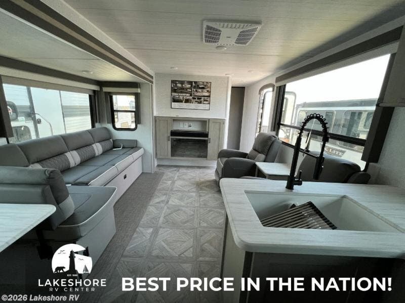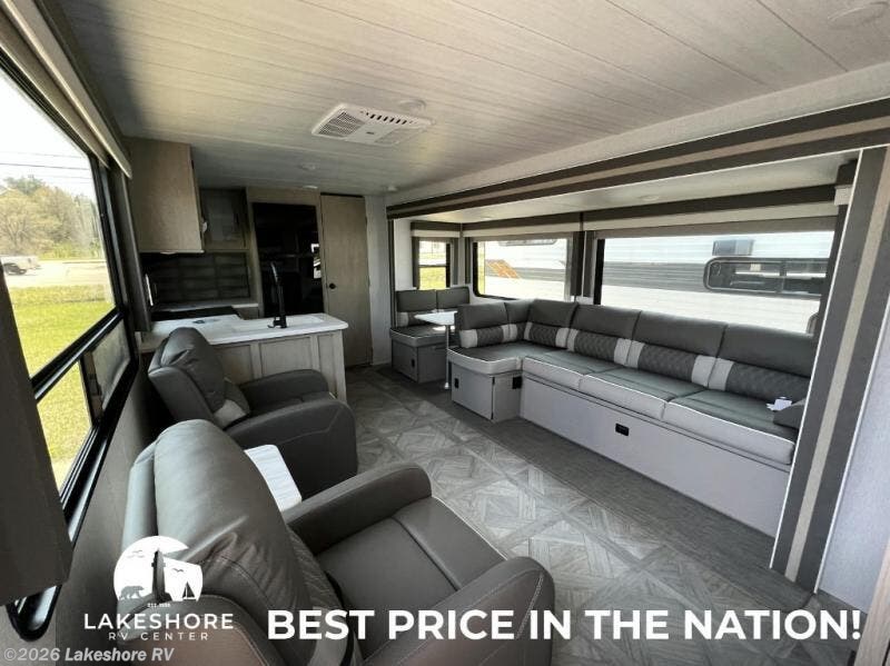 This Wildwood travel trailer is perfect for your family of five looking for a new adventure. You will enjoy the rear kitchen that includes an oversized refrigerator and a three-burner cooktop. The booth dinette within the slide out is perfect for enjoying meals, and when you're through, you can relax on the sofa. Both of these pieces of furniture are a part of the Versa Lounge which allows you to customize their function by moving the middle section to create a larger sofa or a larger dinette. This unit also includes two lounge chairs, so you'll feel right at home! You'll love the full bath in this unit, and the custom king bed in the private bedroom is perfect for a good night's rest.