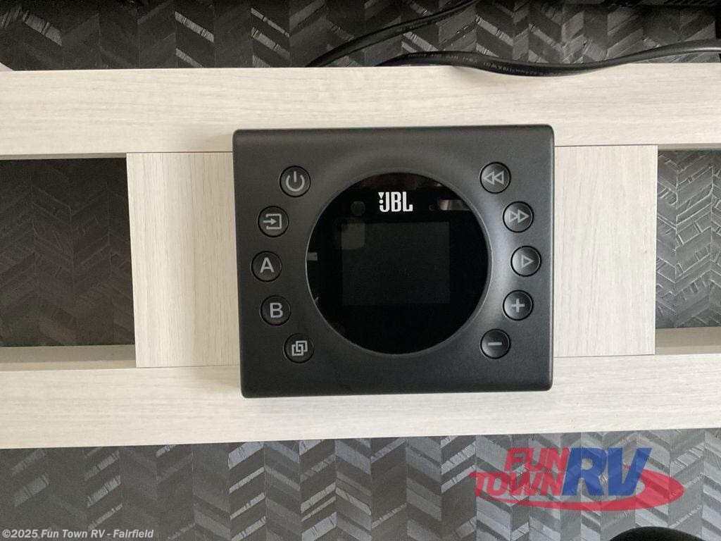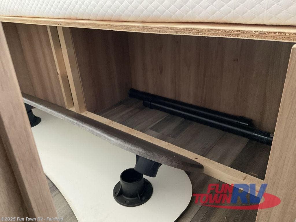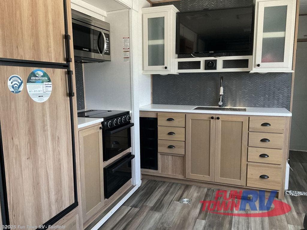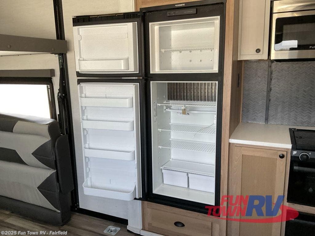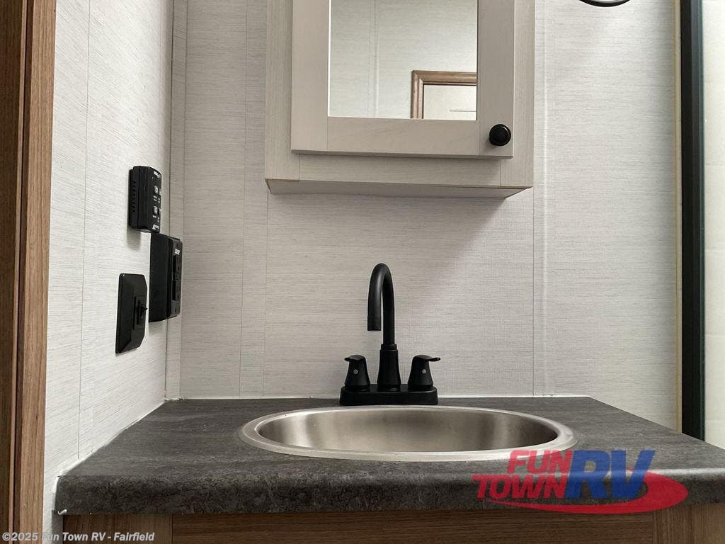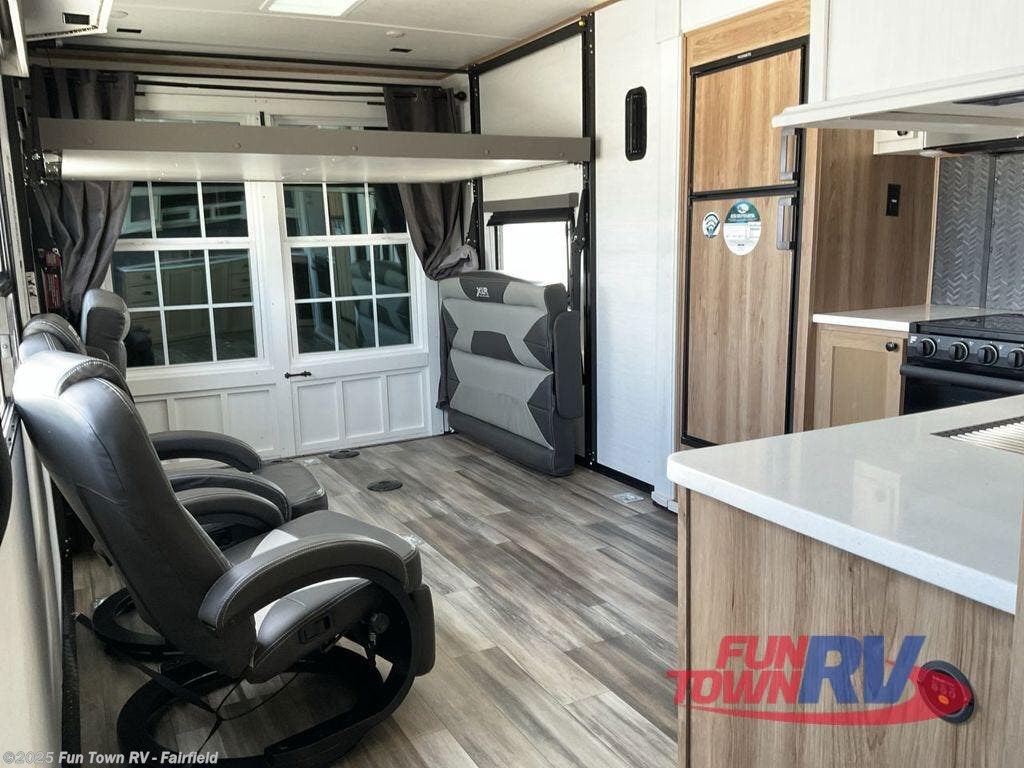 As you seek adventure with your toys, you can also require comfort in your own bedroom at the campsite! The front bedroom provides your own walk-around queen bed with dual wardrobes and windows with great views and natural lighting, plus access to the full bathroom with a radius shower. The main living and kitchen area offers two lounge chairs with end table in between to place your drinks on, dual sofas with dinettes in the rear to dine at, and a slide out with kitchen amenities plus there is extra counter space and a stainless steel single basin sink plus storage for the cook. You will love the hardwood cabinet doors, the grate style sink cover/drying rack, and the metropolitan grey countertops. And the furniture doubles as sleeping space, plus the electric bunk gives you room for two more.