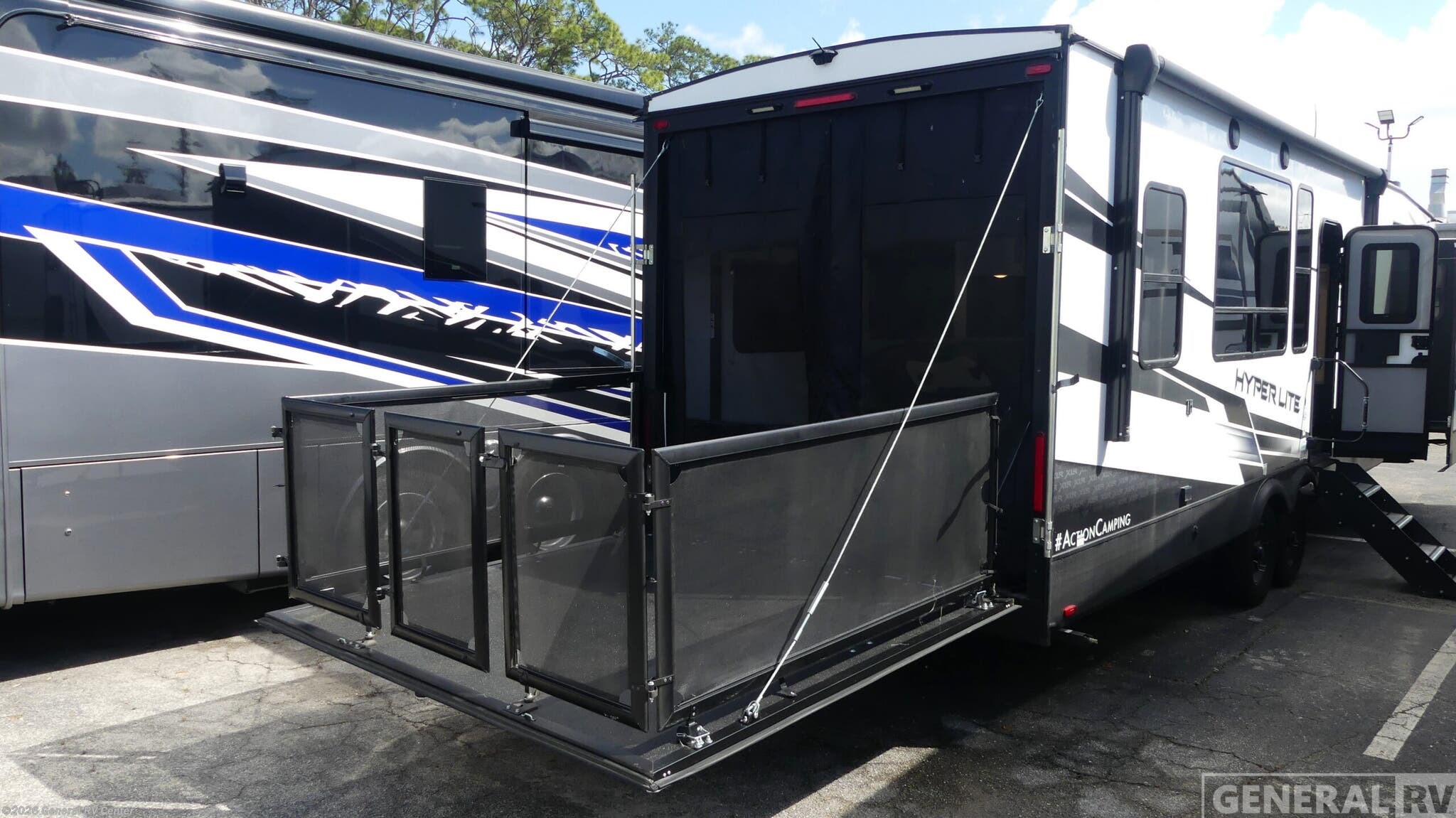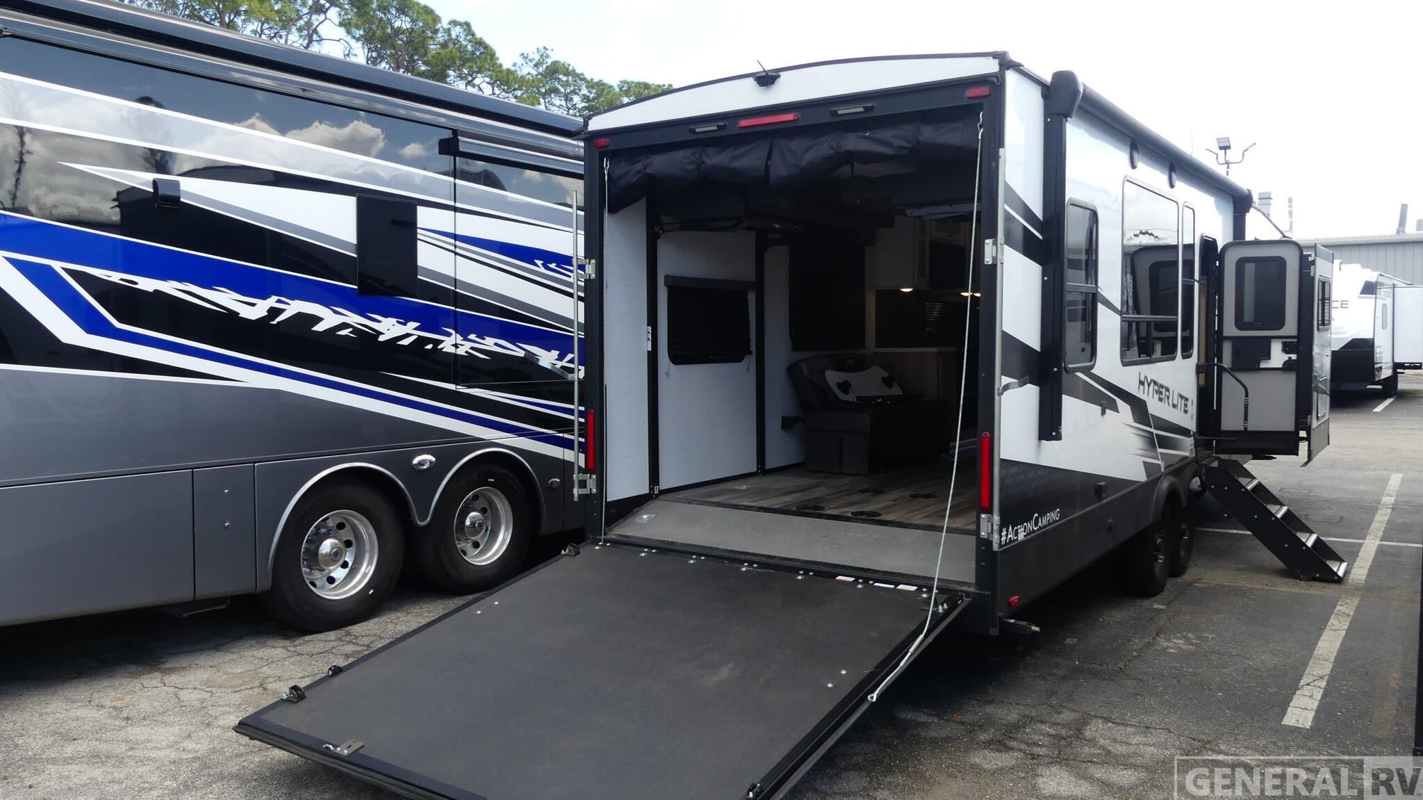**Forest River XLR Hyper Lite toy hauler 3517 highlights:** - Patio Deck - 18' Awning - Queen Bed - Fireplace - Rubber Garage Floor - Front Window With a large rear patio deck and a spacious inside living room, this toy hauler travel trailer offers lots of places to relax! A flip-up sofa and two recliners are arranged by the entertainment center with fireplace for a cozy night in, while the pair of gaucho sofas plus removable table allow you to eat by the rear privacy screen. Step out onto the patio deck to enjoy the fresh air. The kitchen is well-equipped with a microwave, refrigerator, 17" oven with cast iron three burner cooktop, and lots of storage, including a pantry, cubby, and overhead console. You'll love the look of hardwood cabinets with black hardware for a modern look. Retreat to the bedroom with its queen bed located in a slide out for extra space, or curl up with a book on the flip-up bench which is located in the front window so you can enjoy the view. With the XLR Hyper Lite toy hauler travel trailer by Forest River, there is a wider interior with a 74" width even when the slides are retracted in so you can enjoy modern décor, at-home amenities and custom styling. The garages are spacious and include 5,000 lb. cargo tie downs that are anchored to steel plates, an insulated floor, a black rear privacy screen, a ramp patio cable kit for outdoor fun above ground, and Alumi-tread rear entry steps to mention a few highlights. More standout features include MORryde CRE3000 premium suspension that smooths out even the toughest of roads, heavy-duty Dexter axles offering the best in class carrying capacities, and the XLR fully enclosed "Body Armor" underbelly that is insulated and uses a panel system for ease of access. So when you want to play hard, choose an XLR Hyper Lite that offers upgraded features, quality construction, and allows you the control of venturing on or off road!