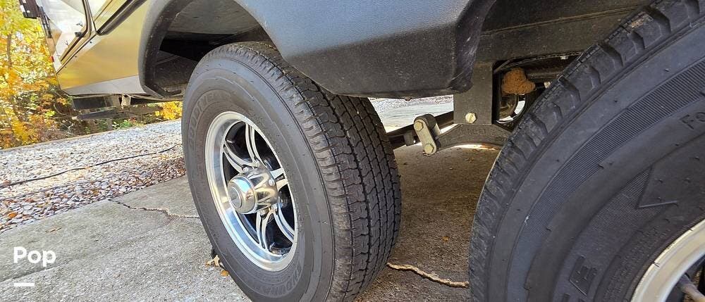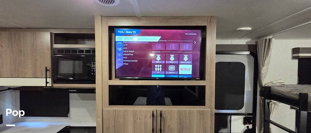 The bedroom features a comfortable queen bed, while the bunk area provides sleeping space for the kids along with ample storage throughout. The bathroom includes a large walk-in shower. A TV and stereo in the main living area round out the entertainment features.
