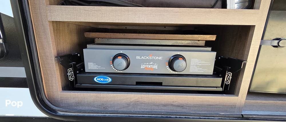The exterior kitchenette includes a two-burner grill and mini fridge, making it easy to cook and entertain under the awning.