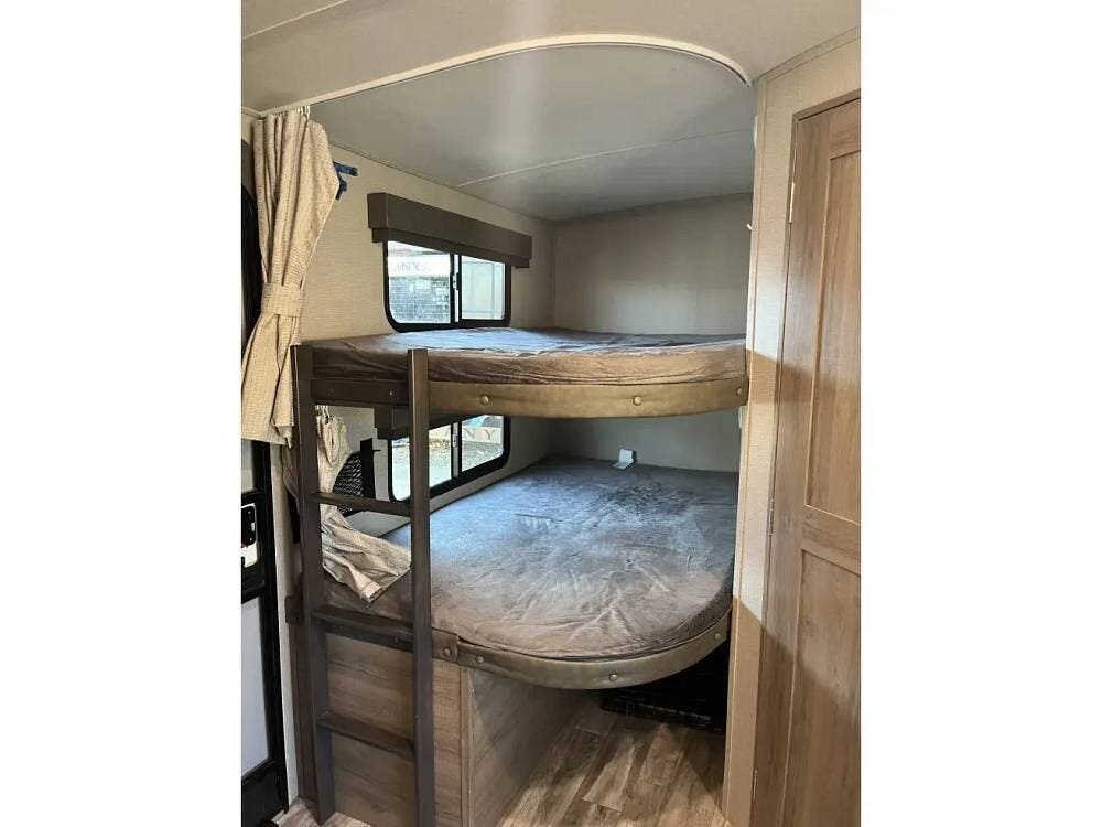 The private front bedroom features a queen bed, sliding doors, and dual wardrobes, creating a cozy and functional retreat. In the rear, the double-over-double bunks are spacious and perfect for kids or guests. The oversized U-shaped dinette converts into additional sleeping space and serves as a comfortable gathering spot for meals, games, or relaxing evenings.