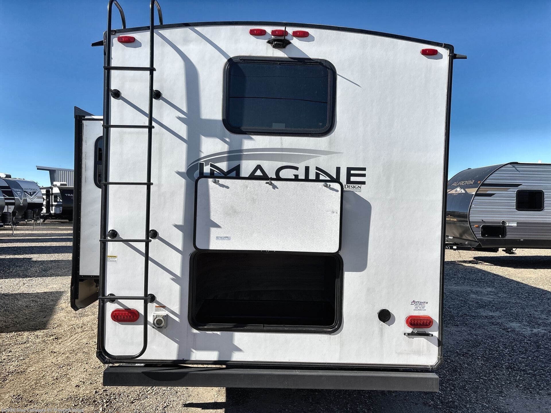 With this Imagine travel trailer, you won't have to imagine what a great camping trip will be like because you can live it! The kitchen includes everything you will need to prepare a meal for everyone, like a 10-cubic foot refrigerator, a three-burner range with oven, microwave, stainless steel sink, and flip-up countertop extension. There is a pet dish below the refrigerator, and the LED HDTV sits across from the tri-fold sofa and U-shaped dinette with removable ottoman so that you can watch a movie or the big game in comfort. Another great addition is the private bunkhouse because it provides you with a second secluded sleeping space. This bunkhouse includes a wardrobe, drawers, and an area prepped for a TV.
