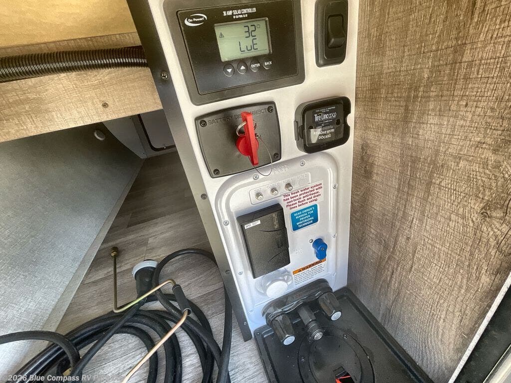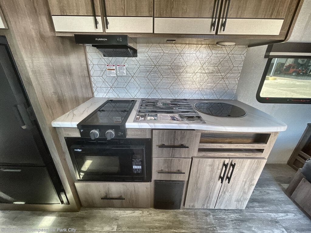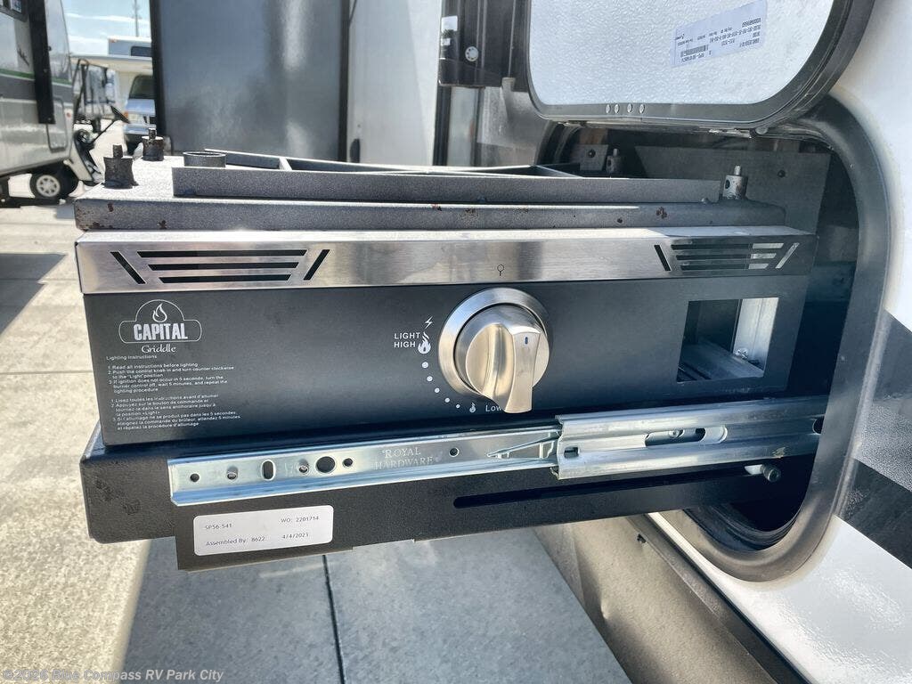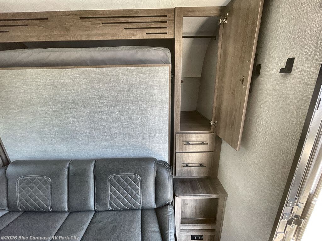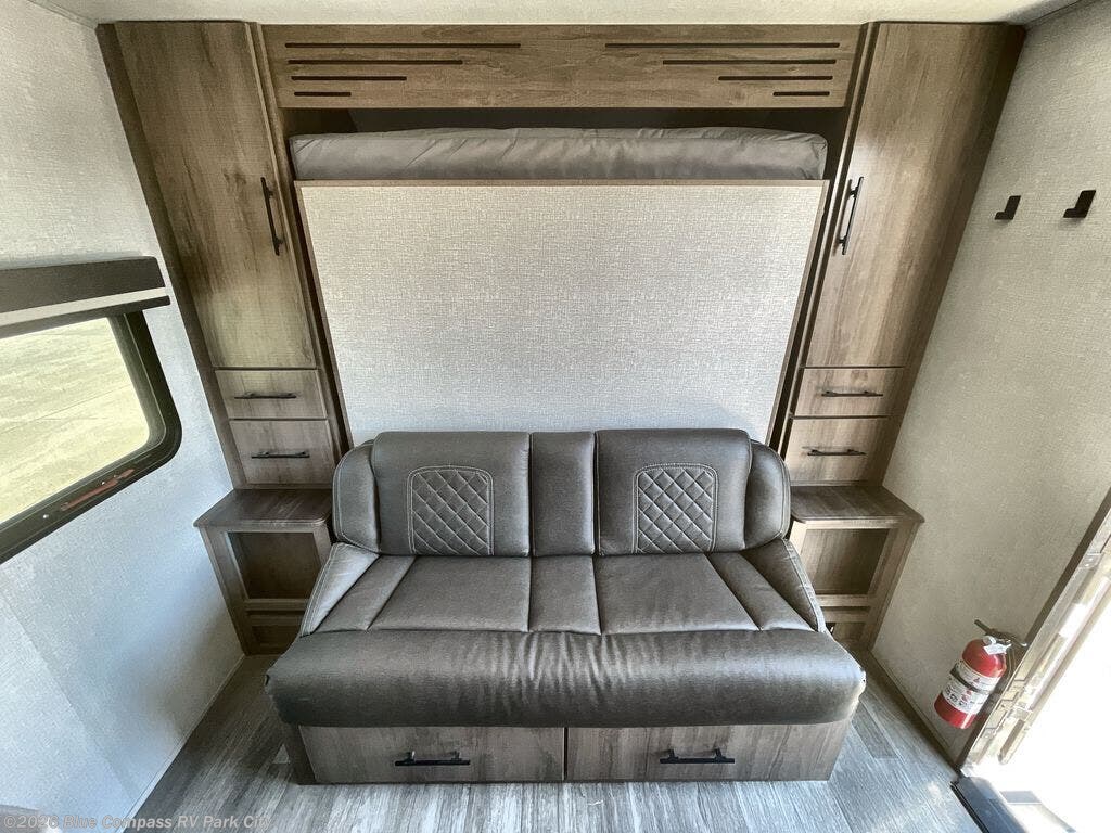 Start looking for your favorite campground to take this travel trailer to! After a fun day at the beach, you can rinse the sand out of your hair with the walk-in shower with a skylight in the full rear bathroom. Depending on what time you enter the unit will determine whether you see the queen Murphy bed or sofa with drawers underneath and wardrobes on either side of it. The booth dinette is not only great for enjoying meals prepared with the two burner cooktop or outside griddle, but also for transforming into an extra sleeping space!