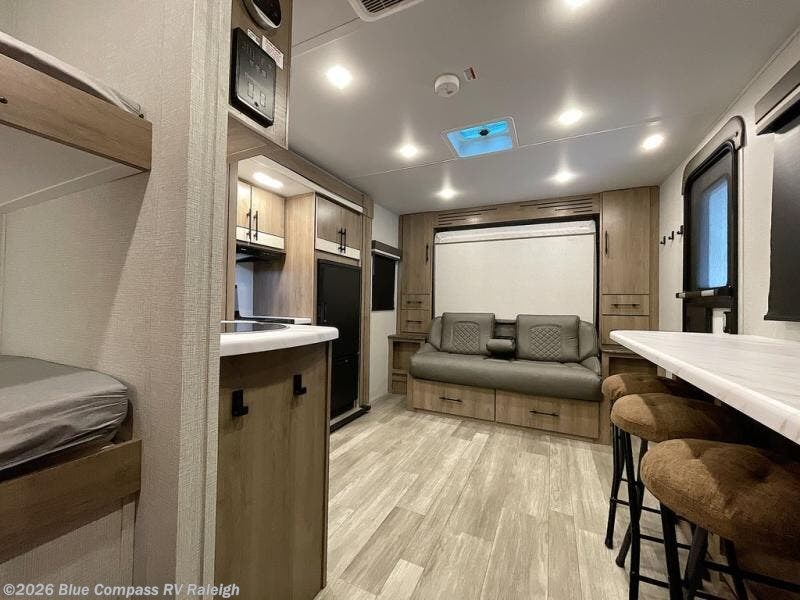 You will feel right at home in this travel trailer! Everyone will have a comfortable place to sleep between the front queen Murphy bed which can transform into a sofa and the 32" x 72" bunk beds. After you have prepared a delicious meal on the two burner cooktop or outside griddle, you can enjoy it at the bar tabletop dinette with four stools for seating. The full bathroom has a walk-in shower with skylight to let in natural lighting and a flip-up sink to save on space!