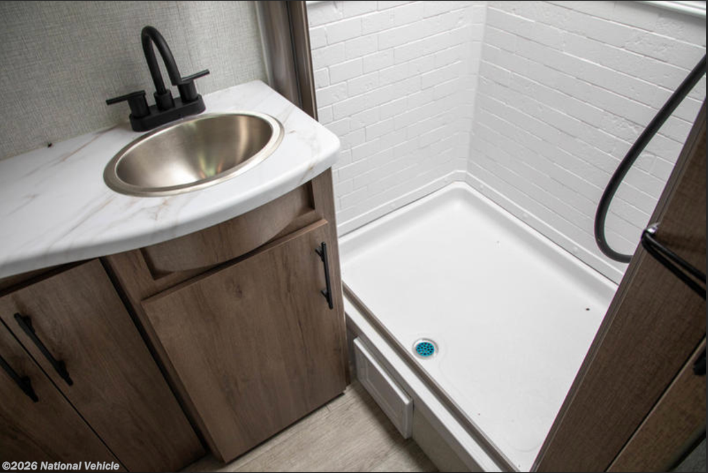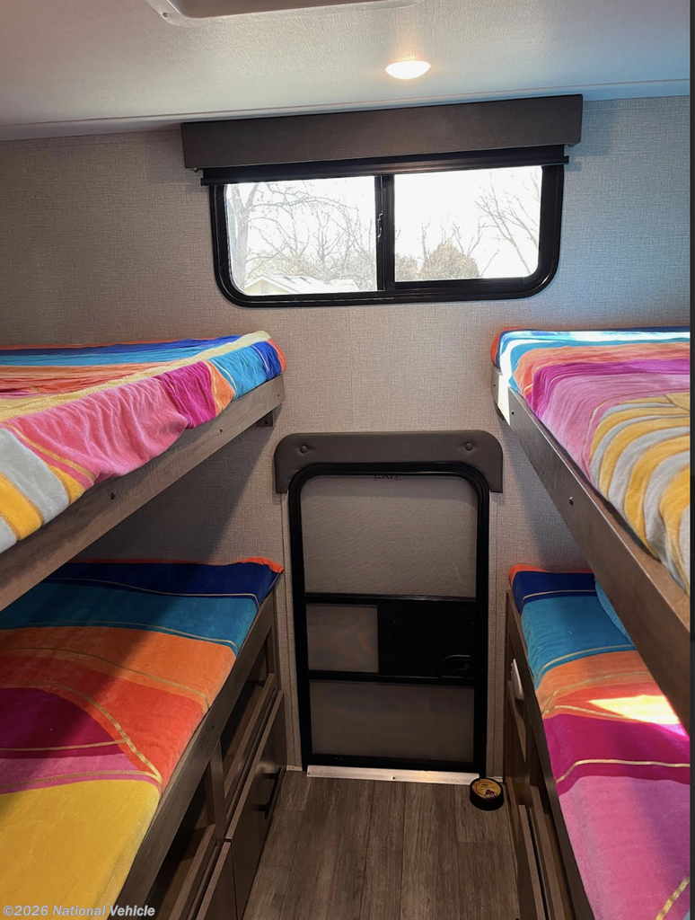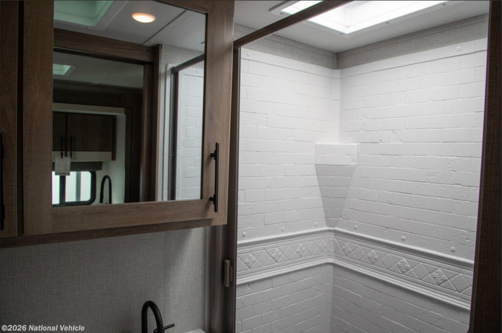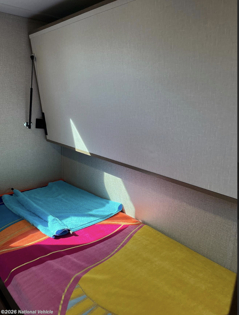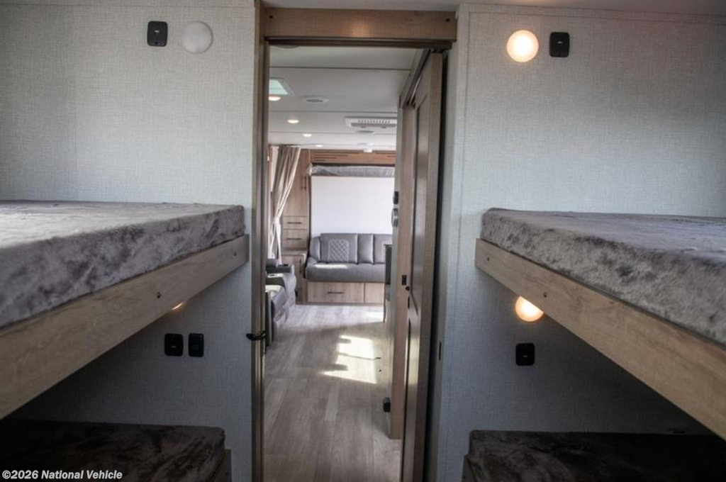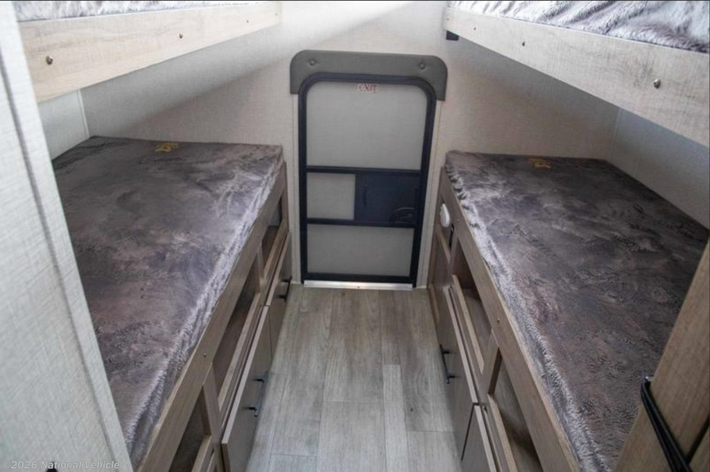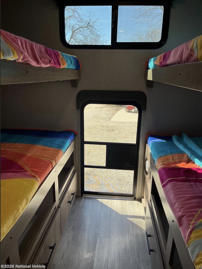 In the rear, the private bunkhouse offers four beds and a convenient exterior access door?perfect for kids, guests, or extra storage. The oversized bathroom includes a large shower with a domed skylight for extra headroom and natural light. Abundant cabinetry and storage throughout make extended trips easy and organized.