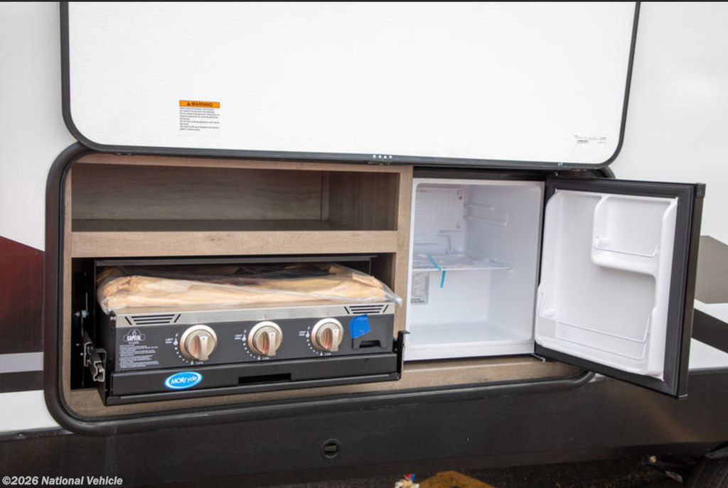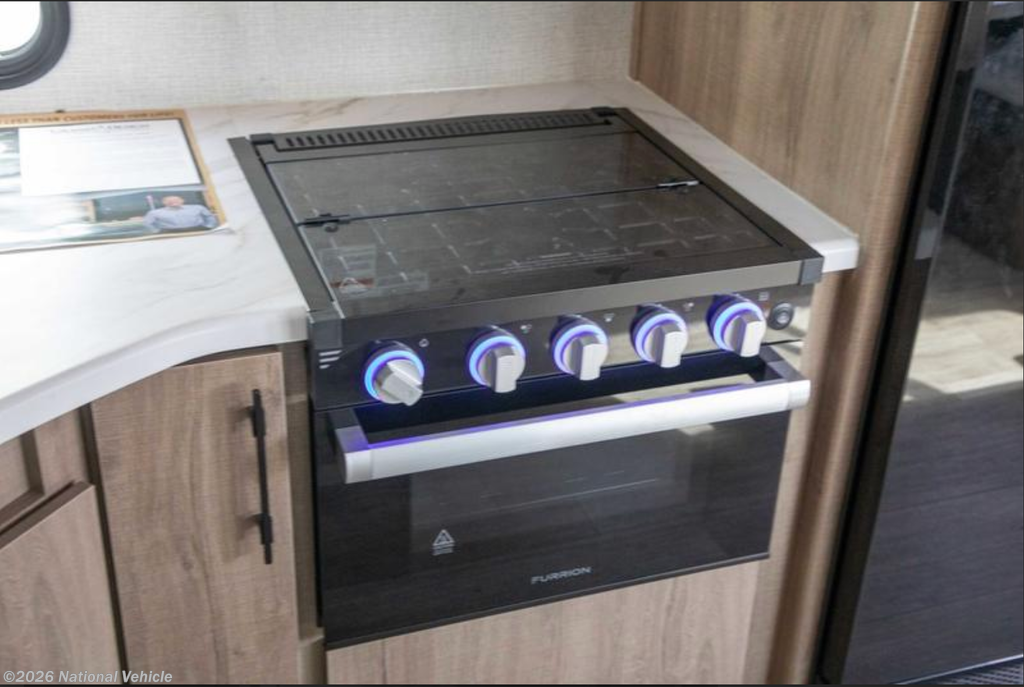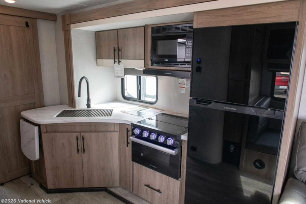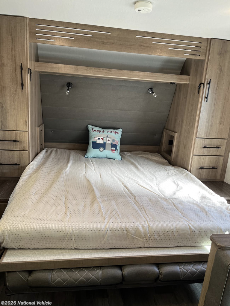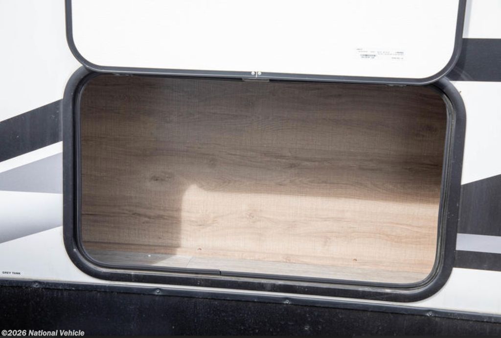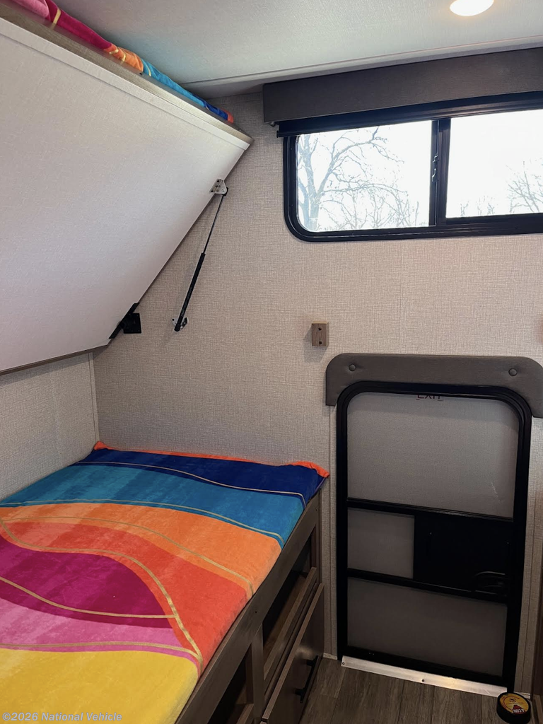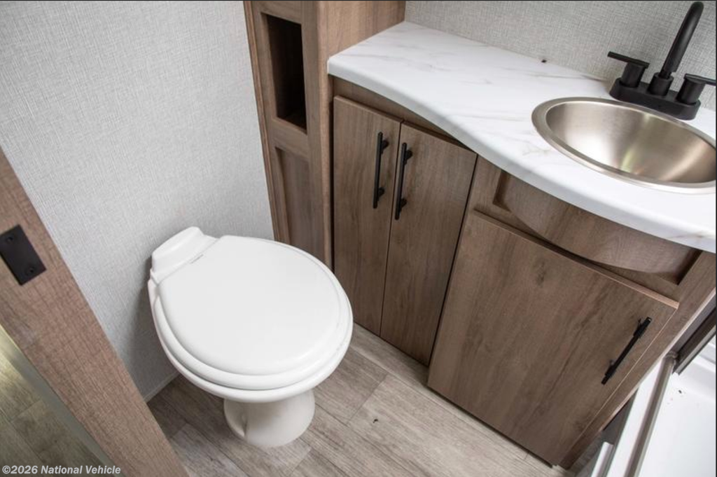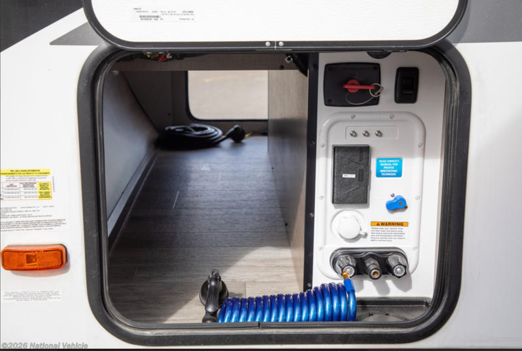 In the rear, the private bunkhouse offers four beds and a convenient exterior access door?perfect for kids, guests, or extra storage. The oversized bathroom includes a large shower with a domed skylight for extra headroom and natural light. Abundant cabinetry and storage throughout make extended trips easy and organized.