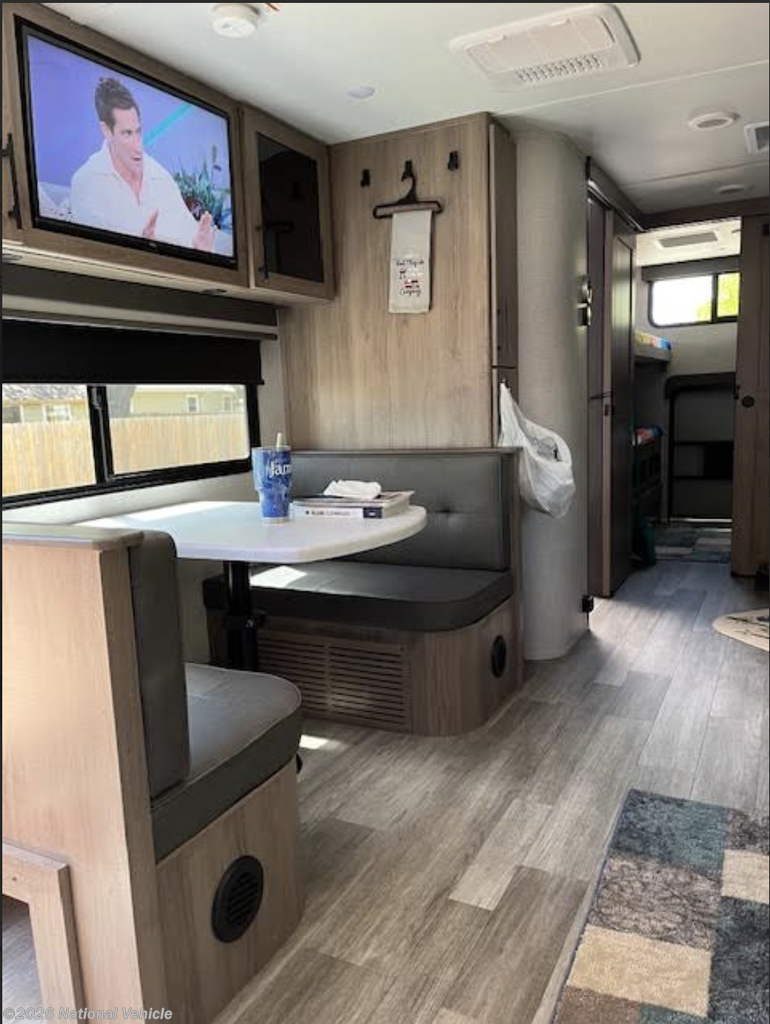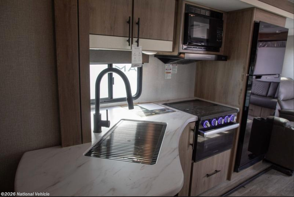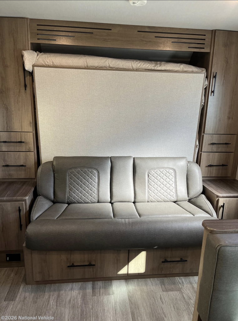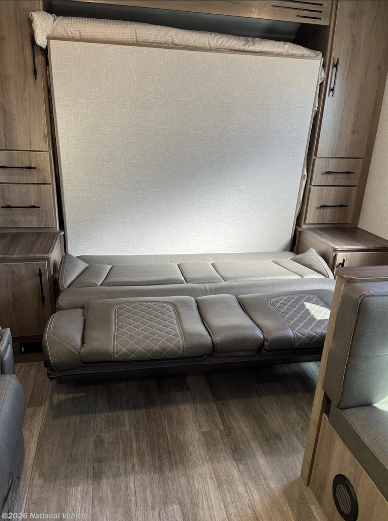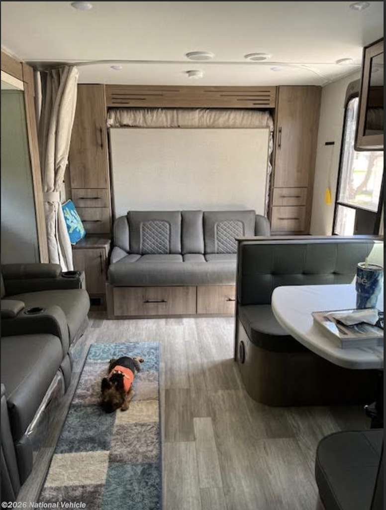 This unit has never been out of state and remains in pristine, showroom-quality condition. The spacious interior features a large slide-out, dual theater seating recliners, and a dinette that comfortably seats four and converts into an additional sleeping area. Up front, enjoy a queen-size Murphy Bed sofa providing both daytime lounging and nighttime comfort.